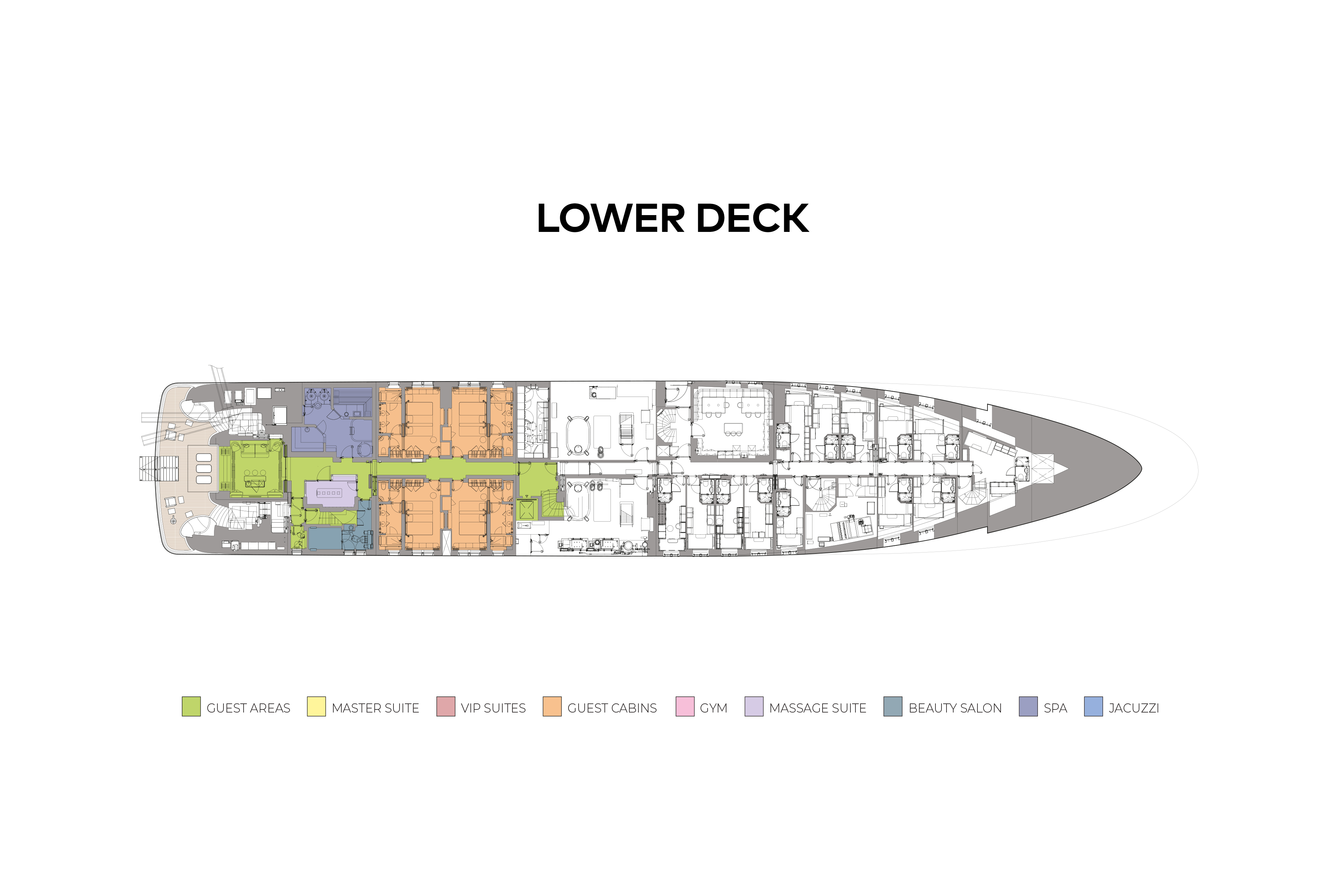 Careful consideration has also been given to privacy, with an entire deck, with lounge, dining, terrace and private jacuzzi, that can be reserved for the owner’s sole use. The owner’s suite offers panoramic views forward, as well as a study, his and hers bathrooms, walk in wardrobe, dressing room and its own private terrace.