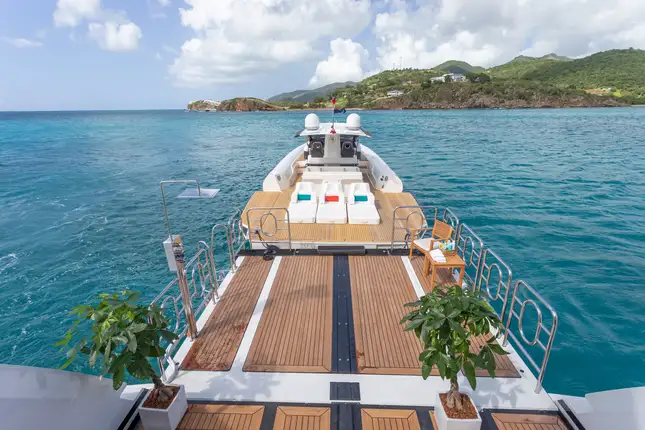 Come evening, you may choose to dine on the bridge deck aft or in the main lounge for a more formal setting. The sky lounge has floor-to-ceiling windows that can be opened to create a wonderful al fresco space and the sun deck offers another large area with sun loungers, jacuzzi and coffee tables for perfect relaxation under the extendable awning.
