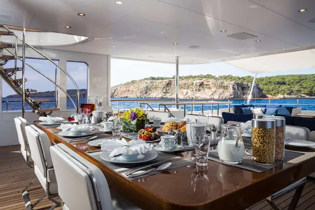 Flexible accommodation for up to 10 guests is one of GO’s most practical features, making her a highly sought-after charter yacht. She offers a full beam, main deck, master suite with dressing room and four guest cabins on the lower deck with can convert to two full beam VIP suites complete with their own lounge.