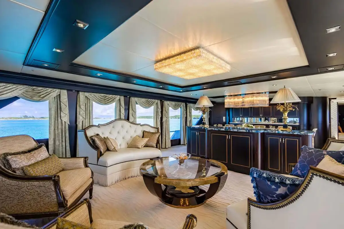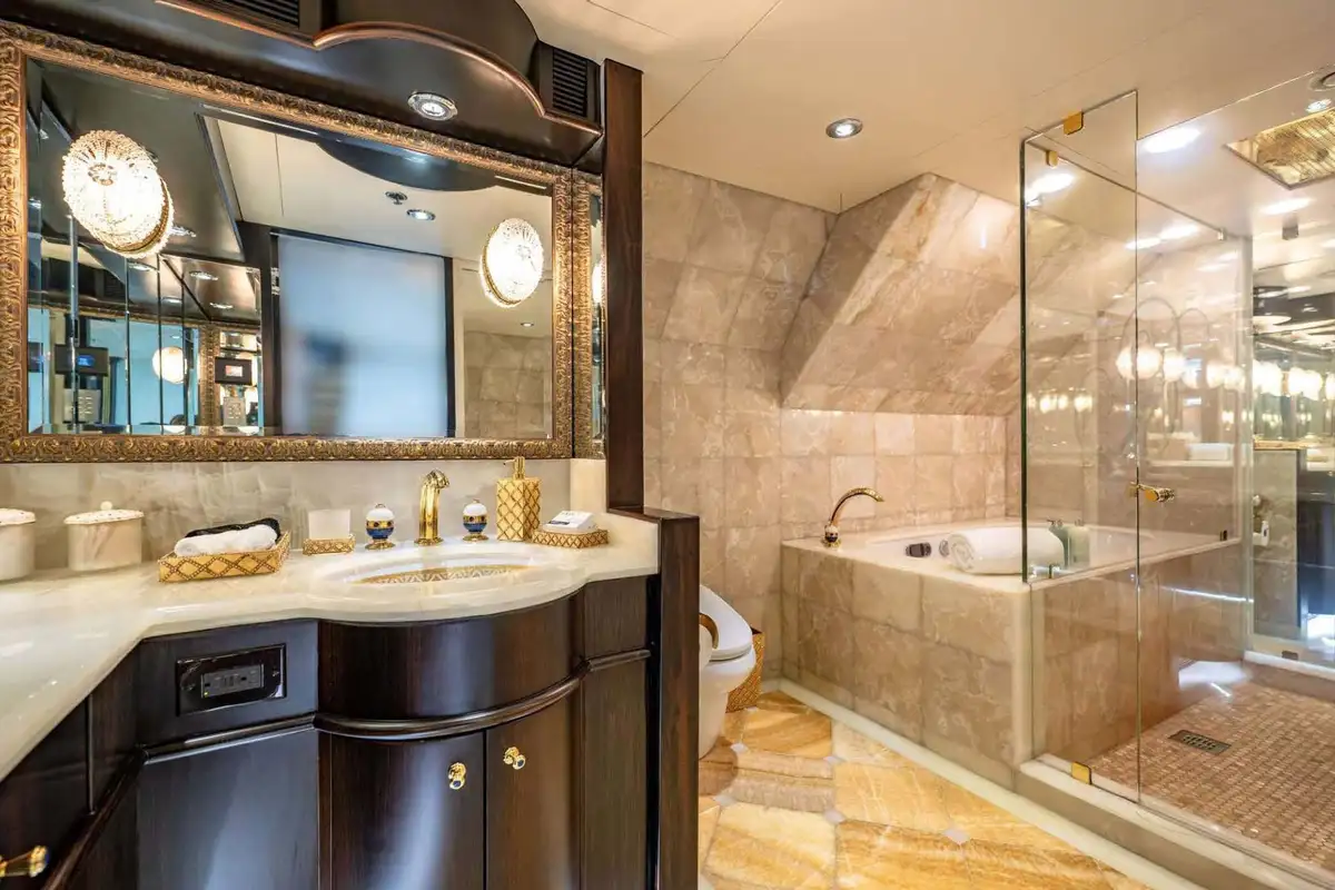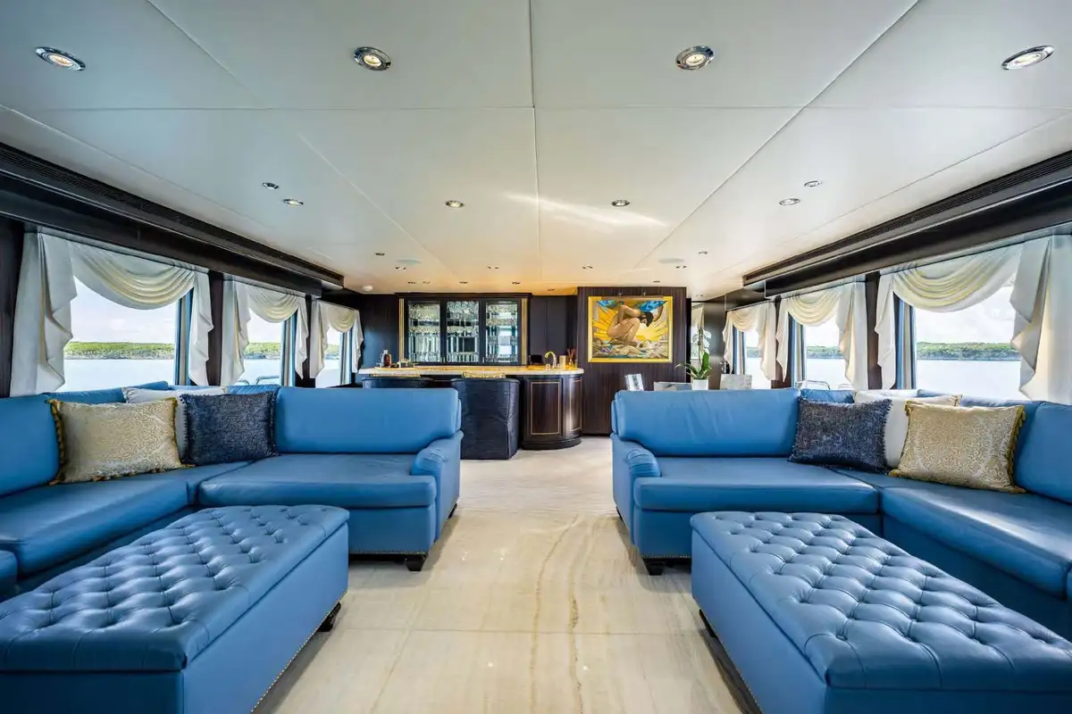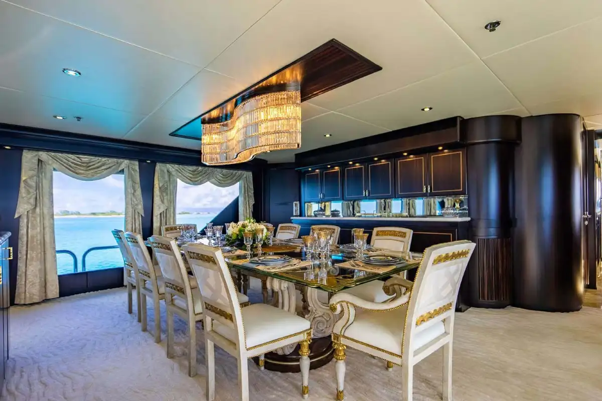 You have plenty of glamorous interior options with wonderful views through near-full-height glass. The main deck lounge is relaxed-classical with dark wood cabinetry inlaid with gold to echo the jacquard drapes, cream leathers and earth-toned fabrics. Forward is a glass-topped dining table supported by classical scrolls. The sky lounge creates a more relaxed environment with opulent blue-leather sofas on marble floors with a feature bar forward.