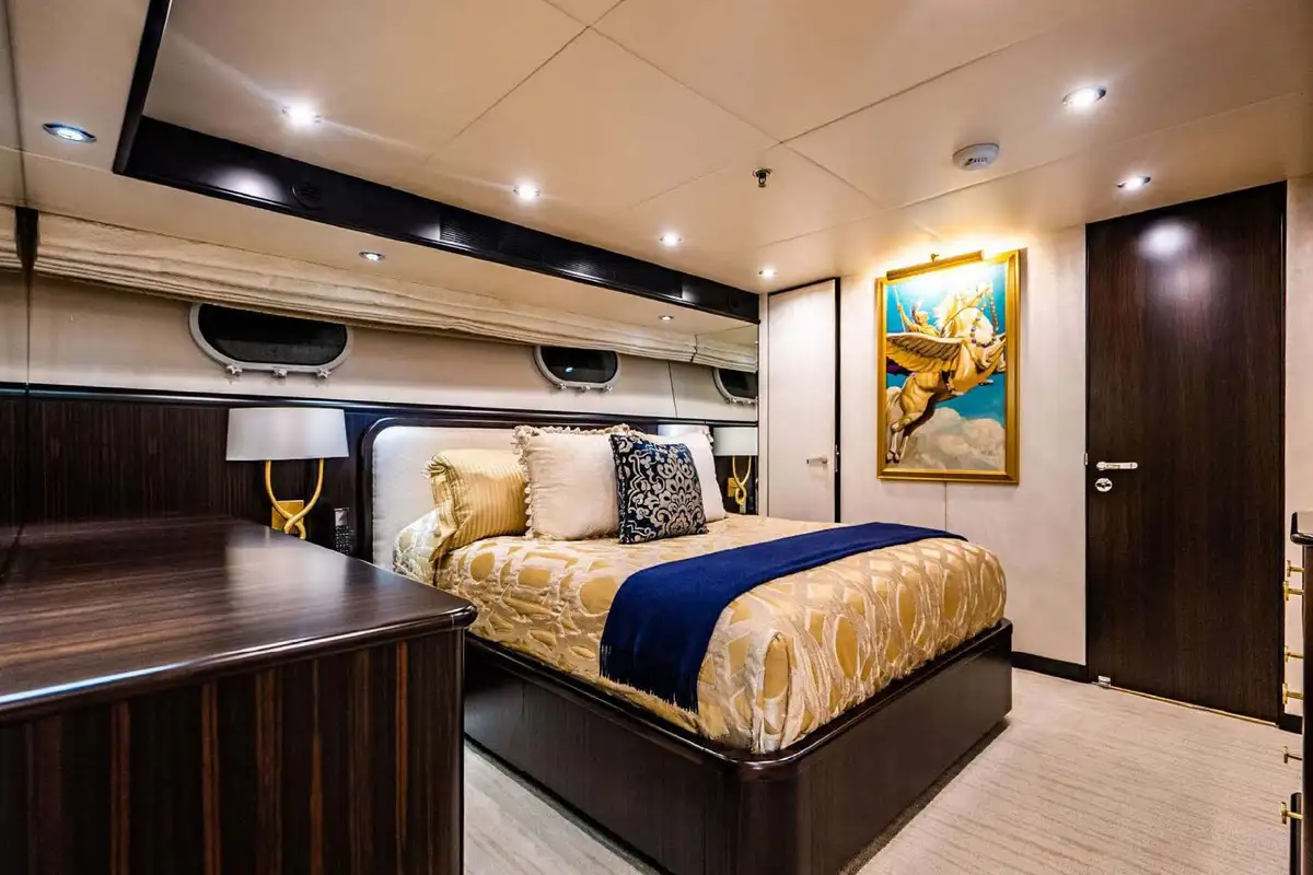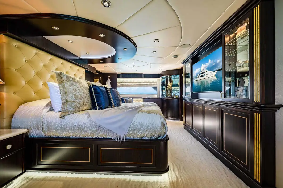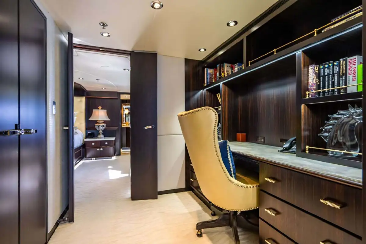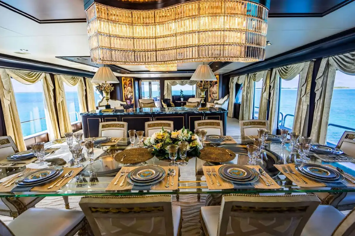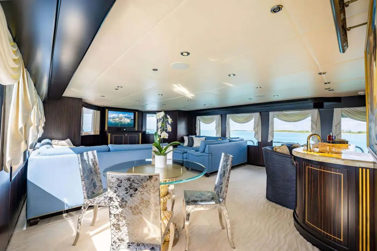 You have plenty of glamorous interior options with wonderful views through near-full-height glass. The main deck lounge is relaxed-classical with dark wood cabinetry inlaid with gold to echo the jacquard drapes, cream leathers and earth-toned fabrics. Forward is a glass-topped dining table supported by classical scrolls. The sky lounge creates a more relaxed environment with opulent blue-leather sofas on marble floors with a feature bar forward.
