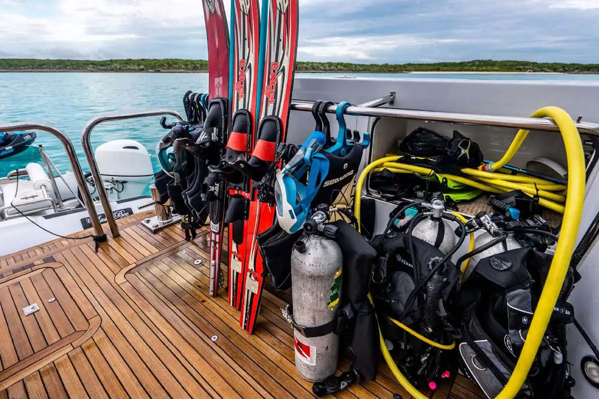 What are the must-haves? A fast tender to explore the islands? Check. There’s a 13m (42ft) Yellow Fin chase tender with 1,050hp of outboard power. Diving equipment? Check. Scuba gear for eight guests and PADI training available, and lots of snorkel equipment. Fishing gear? Check. The yacht has plenty of trolling and deep-drop fishing gear for game fishing and a crew that knows how to use it. Beach set-up? Check. The crew can build a full tent, table and 12 chairs for those beach BBQs. Watertoys? Check. Waverunners, SeaBobs and waterskis for your guests.