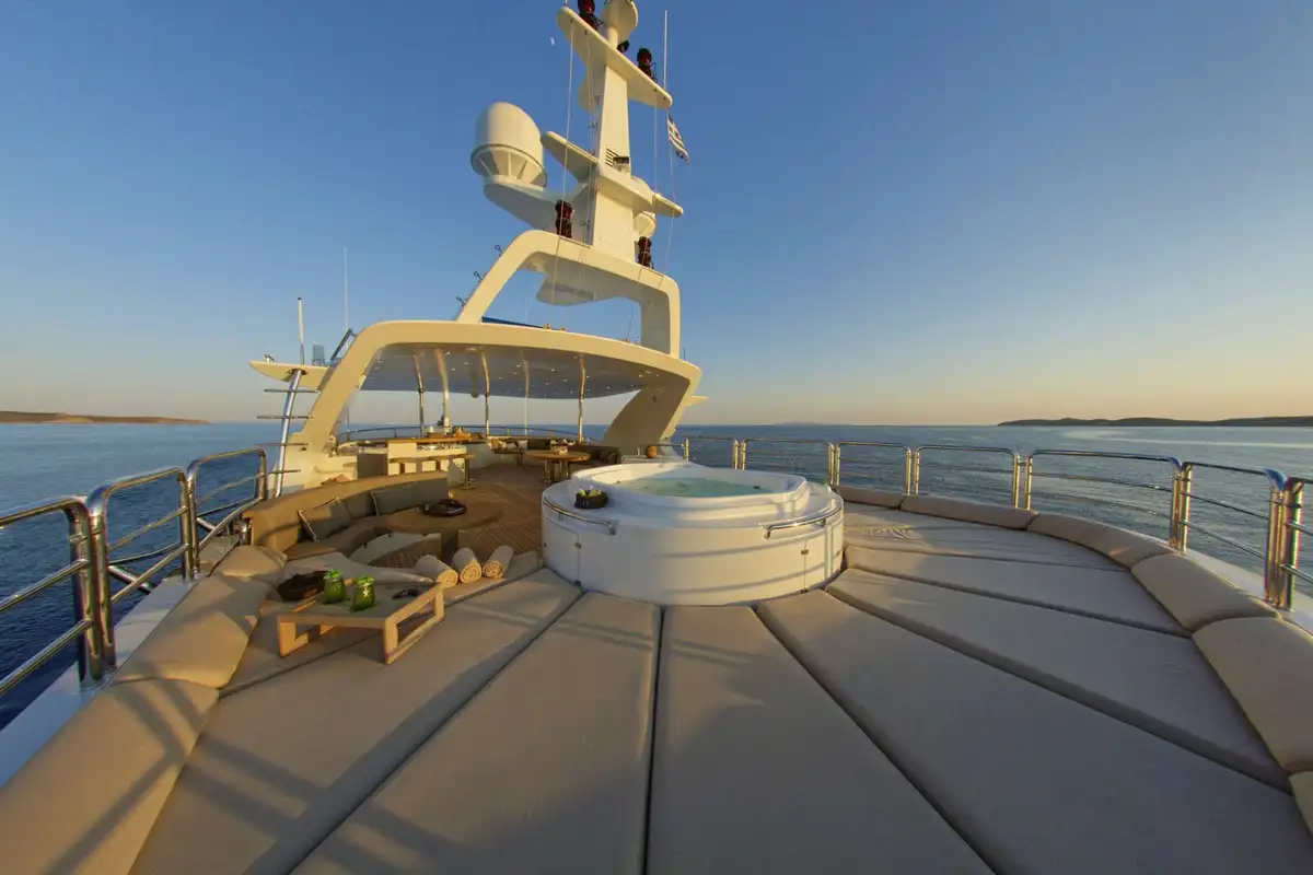 The sundeck has two separate lounge areas, sunpads and loungers, a dining table that extends from 10 seats to 14 and a sit-up bar as well as the big jacuzzi. There’s also a wide range of gym equipment. Welcome aboard, there’s no better way to cruise the Aegean!