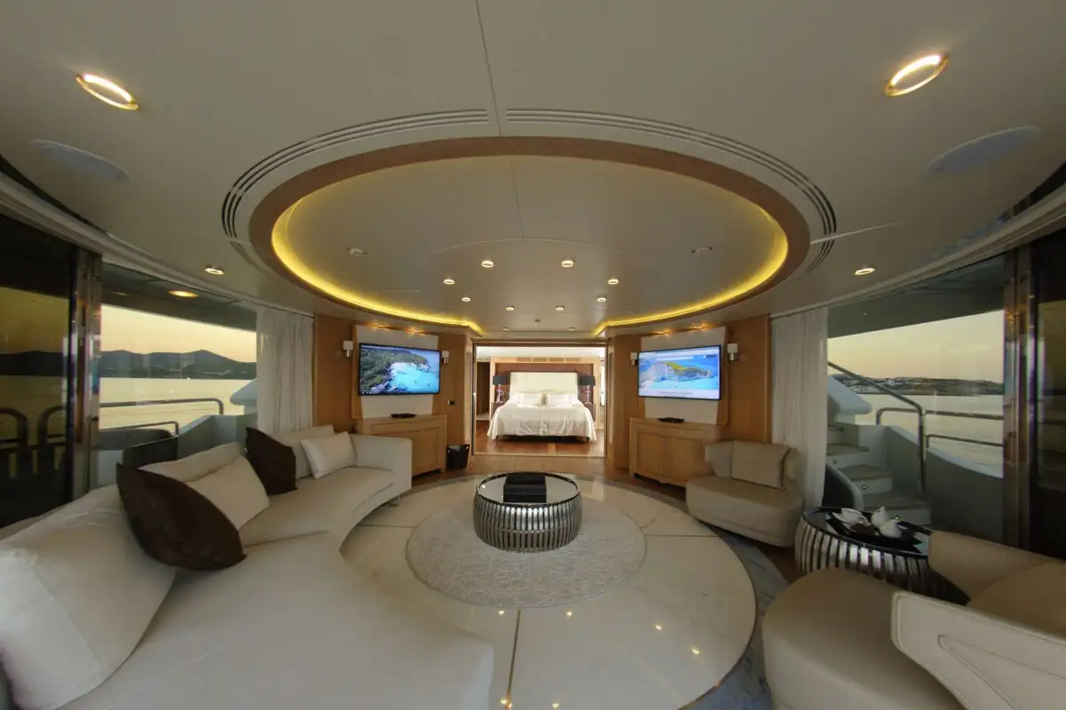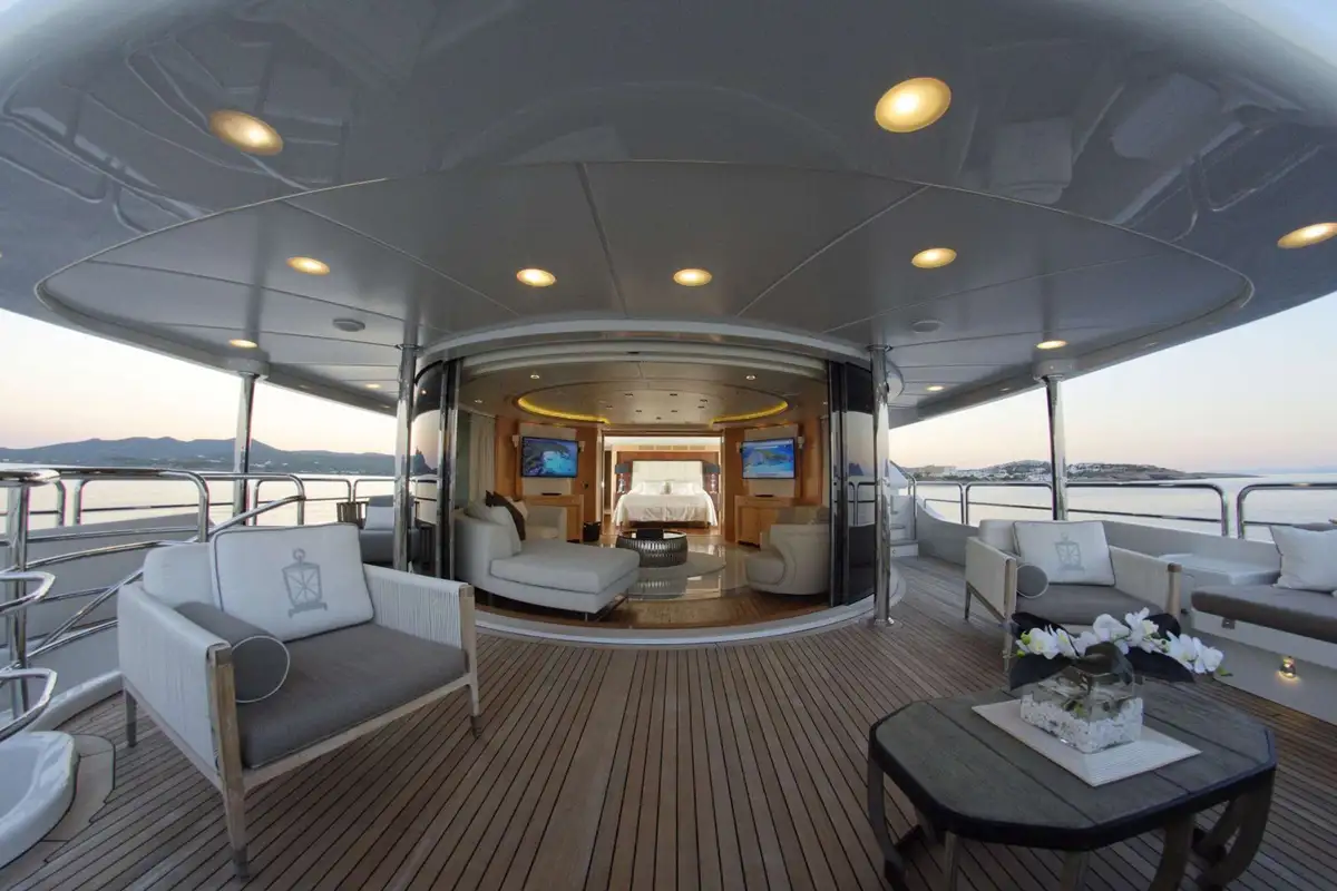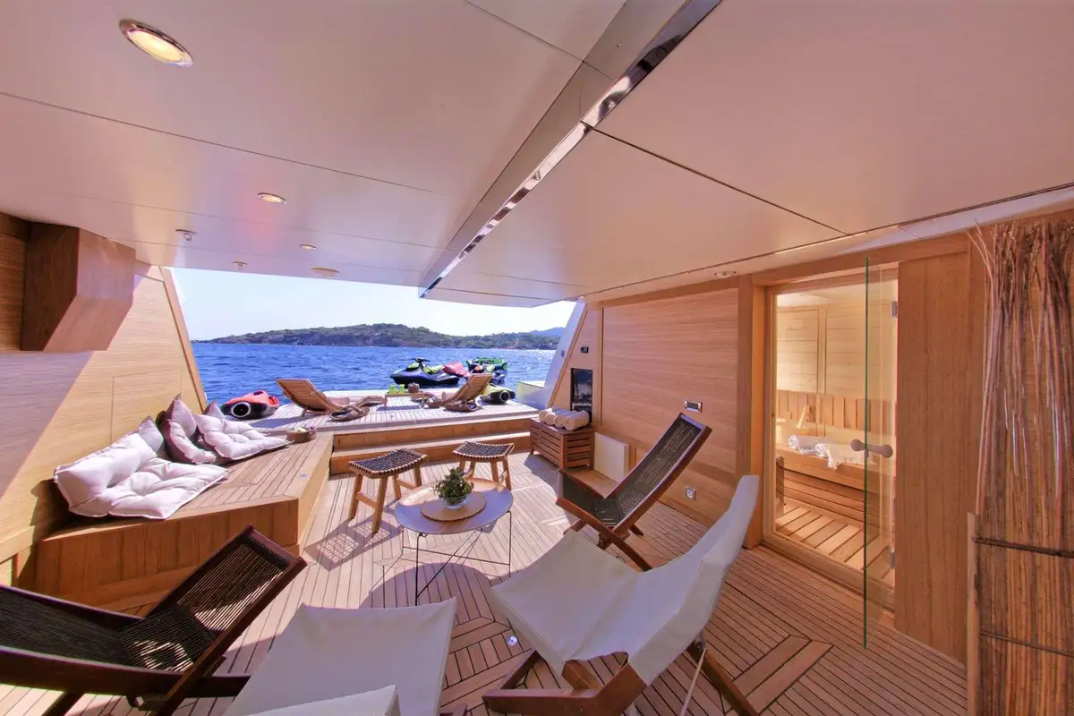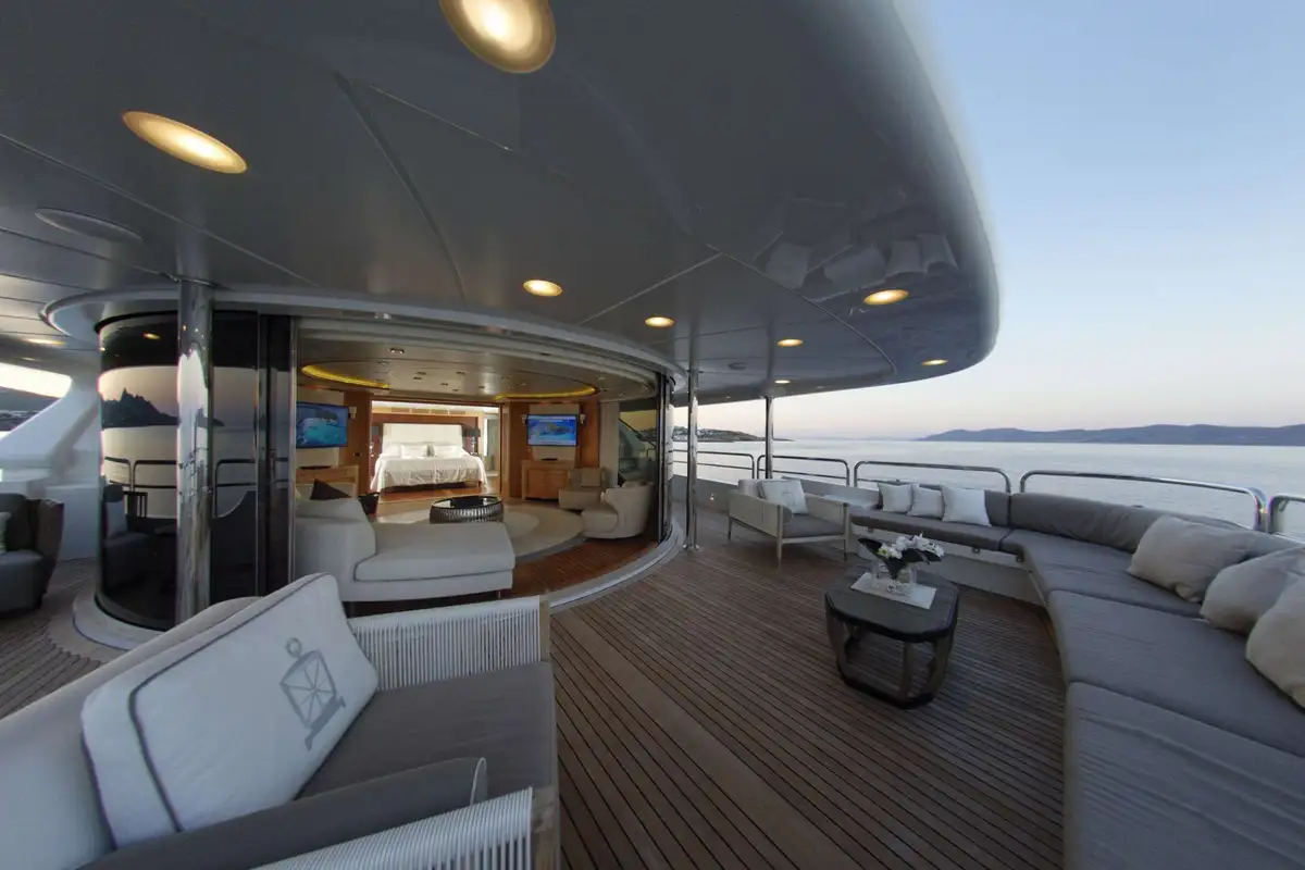 She has an excellent array of key features. When the anchor goes down in a beautiful bay, there’s a large sea-level beach club in her stern with a sauna, shower room and gym equipment. For watersports action she has two tenders including a nine-metre escort boat and a large selection of toys. The main outdoor social hub is an expansive and unobstructed sundeck with an oversized jacuzzi pool; and a wheelchair-accessible elevator connects her lower, main and upper decks.