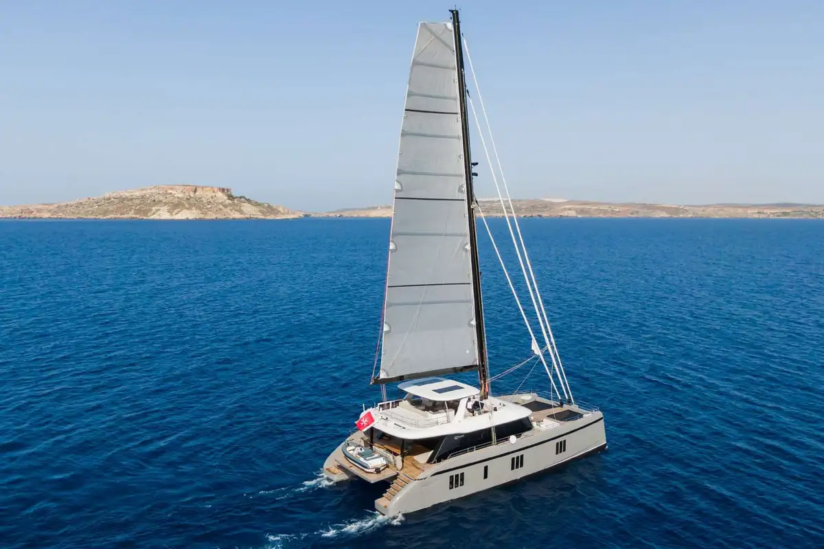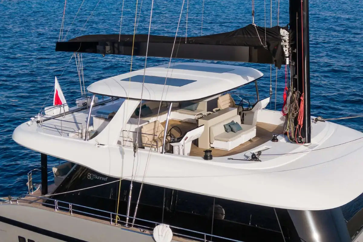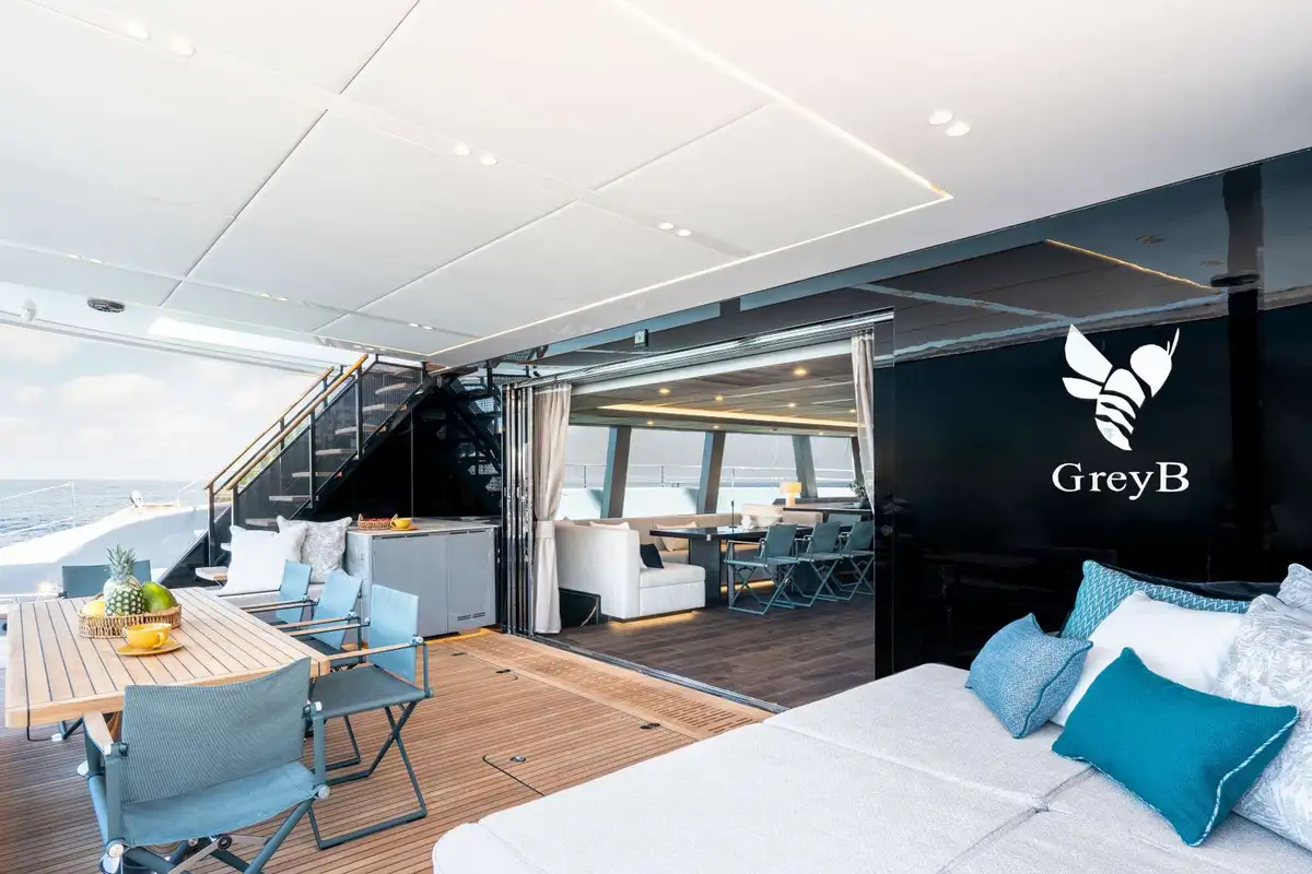 The brand new 2022 Sunreef 80 S/Y GREYB is now available to charter. Featuring an all new superstructure from Sunreef, her sleek and elegant design bring together a classic sailing experience, with all the luxuries you would expect on a new yacht. Upon entering the yacht, you are greeted with the newly designed open saloon and dining concept. Here you have comfortable lounging options on the starboard side and to port there is a dining table and L-shaped sofa combination for more formal seating.