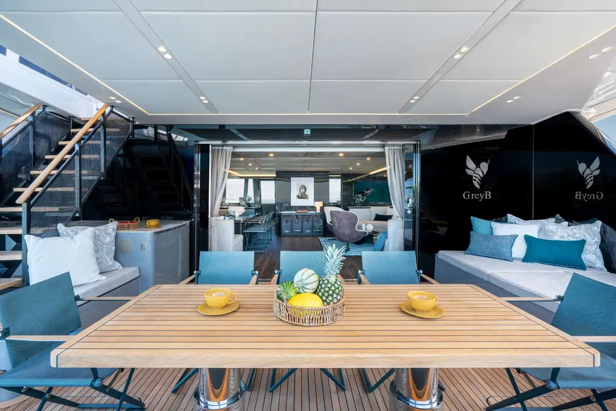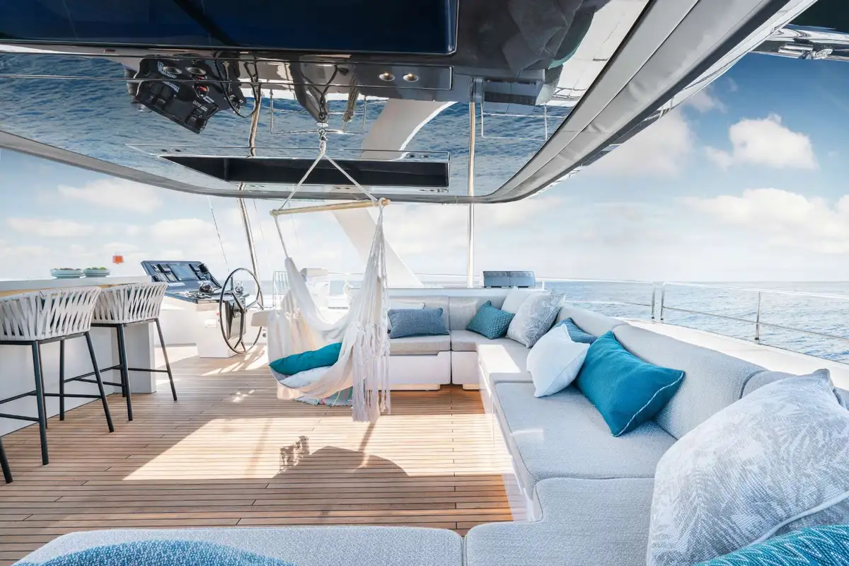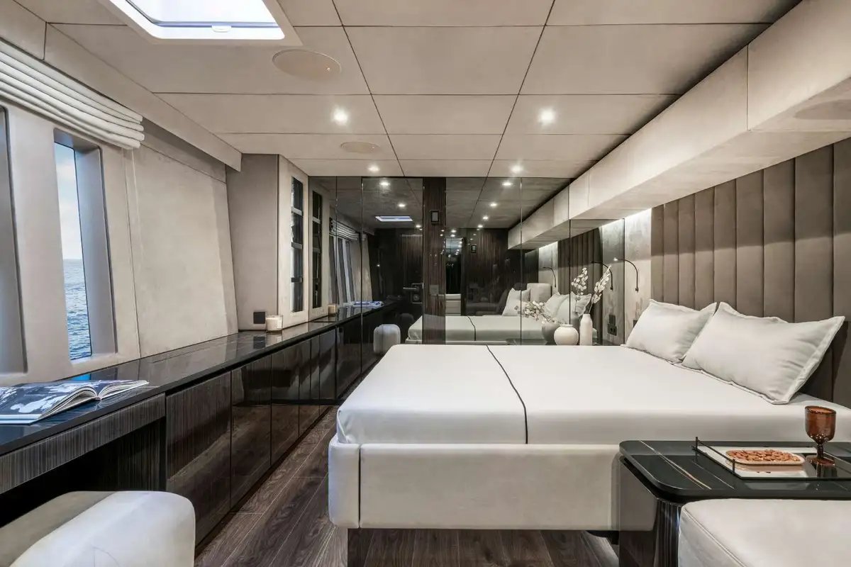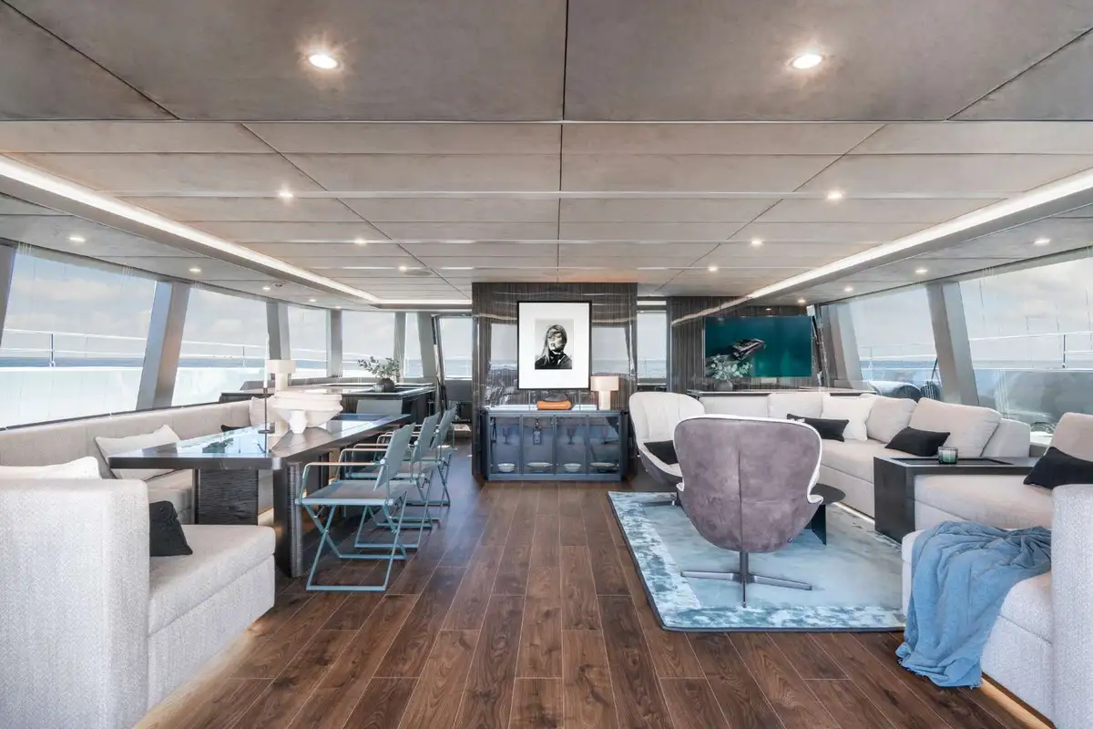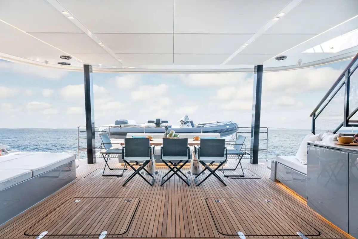 Towards the bow portion of the saloon, there is a bar area with easy access to the yacht’s large foredeck lounge. Surrounded by windows and purposefully kept open-planned, the saloon is an inviting area that flows beautifully into the outdoor spaces. The foredeck terrace has plenty of comfortable seating around the coffee table, perfect for morning coffee with a sunrise. Sun pads can be found in all corners of the foredeck. The aft deck houses the cockpit, outdoor fridge, large dining table and seating and sun pads that are convertible to a sofa. The flybridge is a vast and soothing retreat with numerous lounging, dining and sunning options along with a central drinks bar with panoramic views.