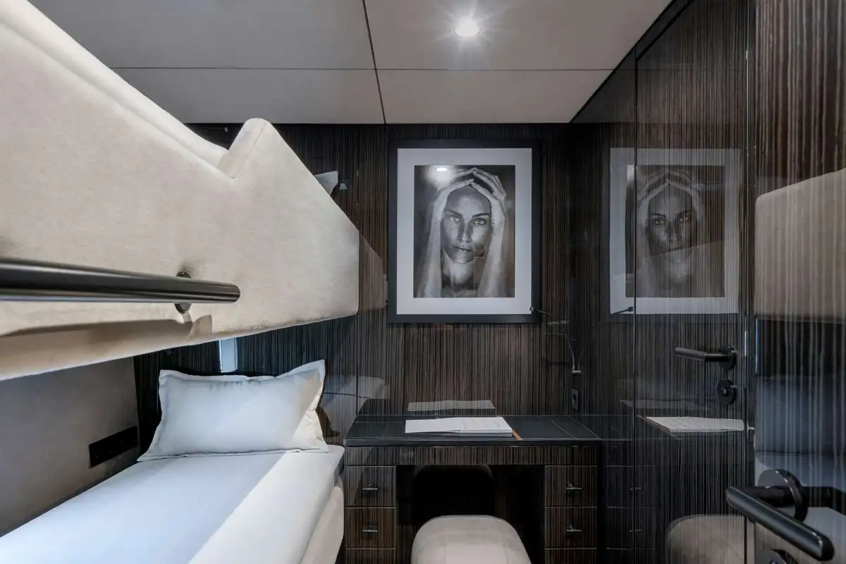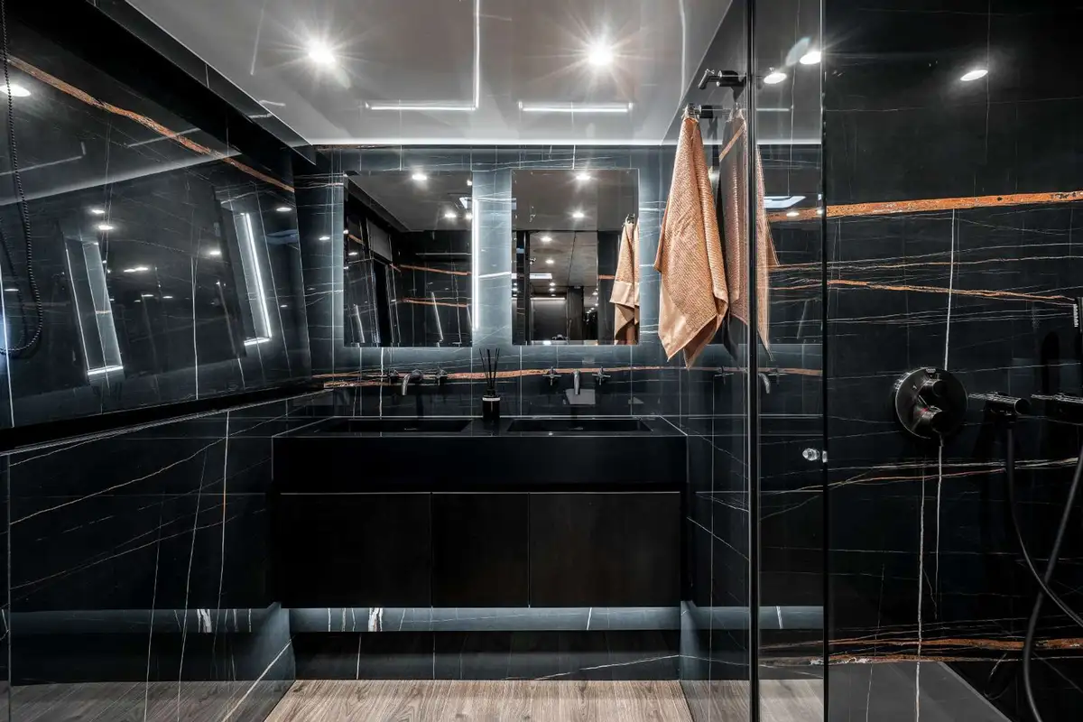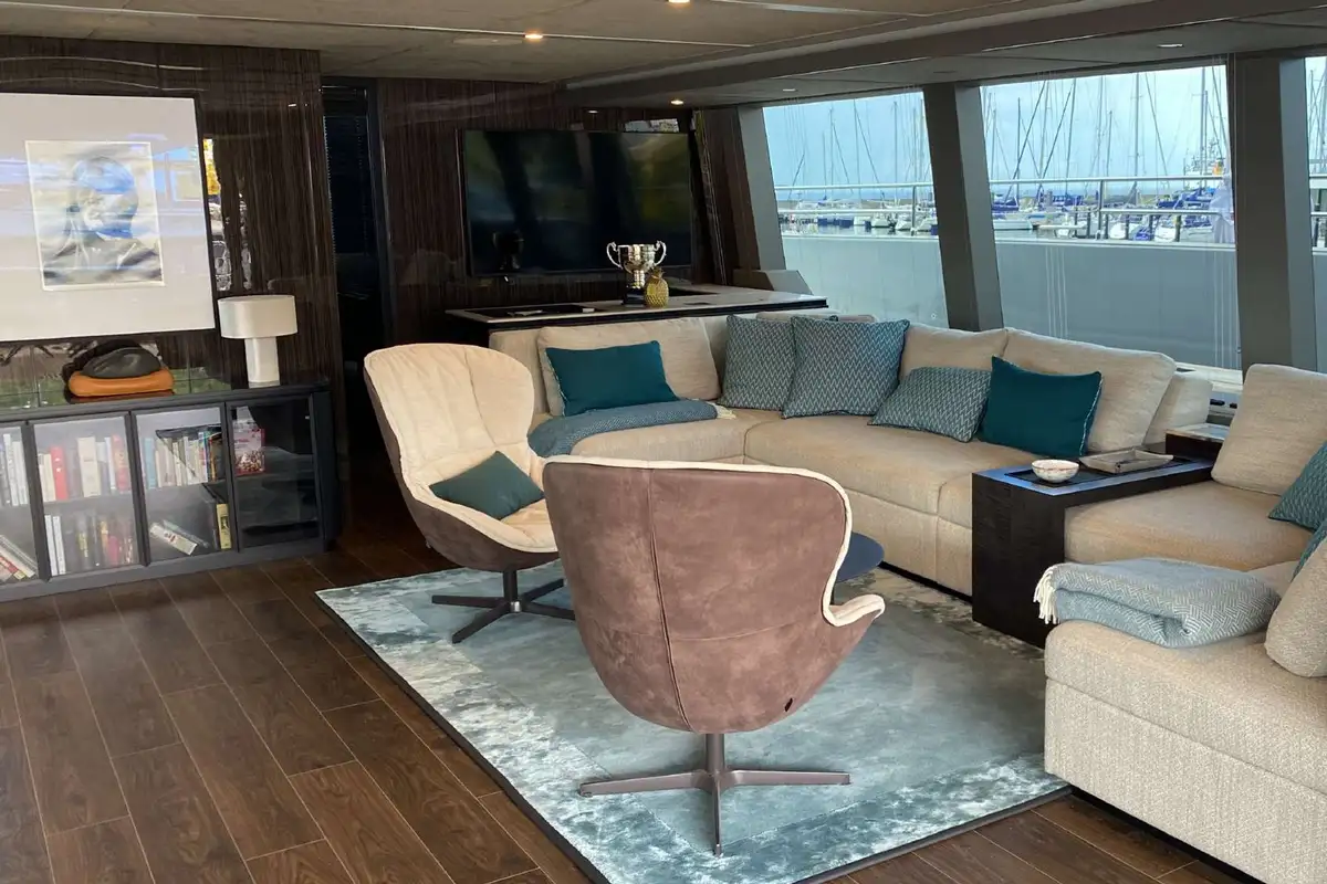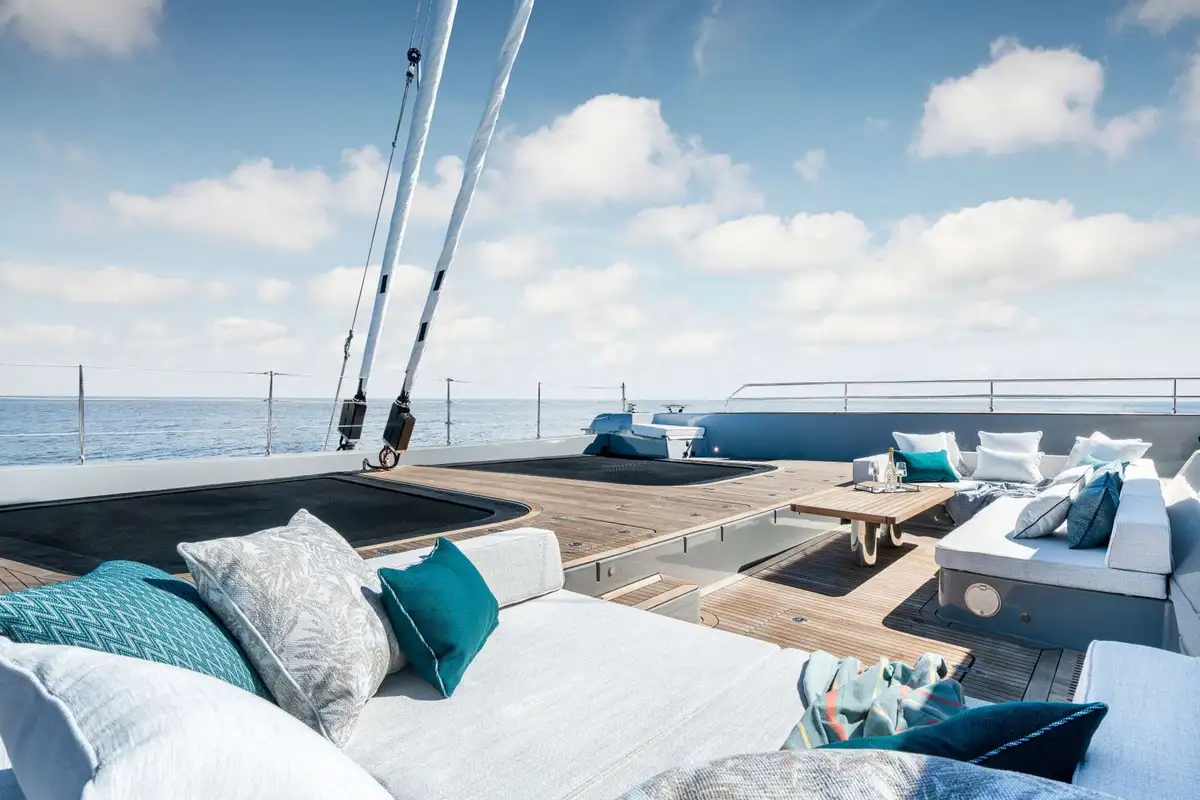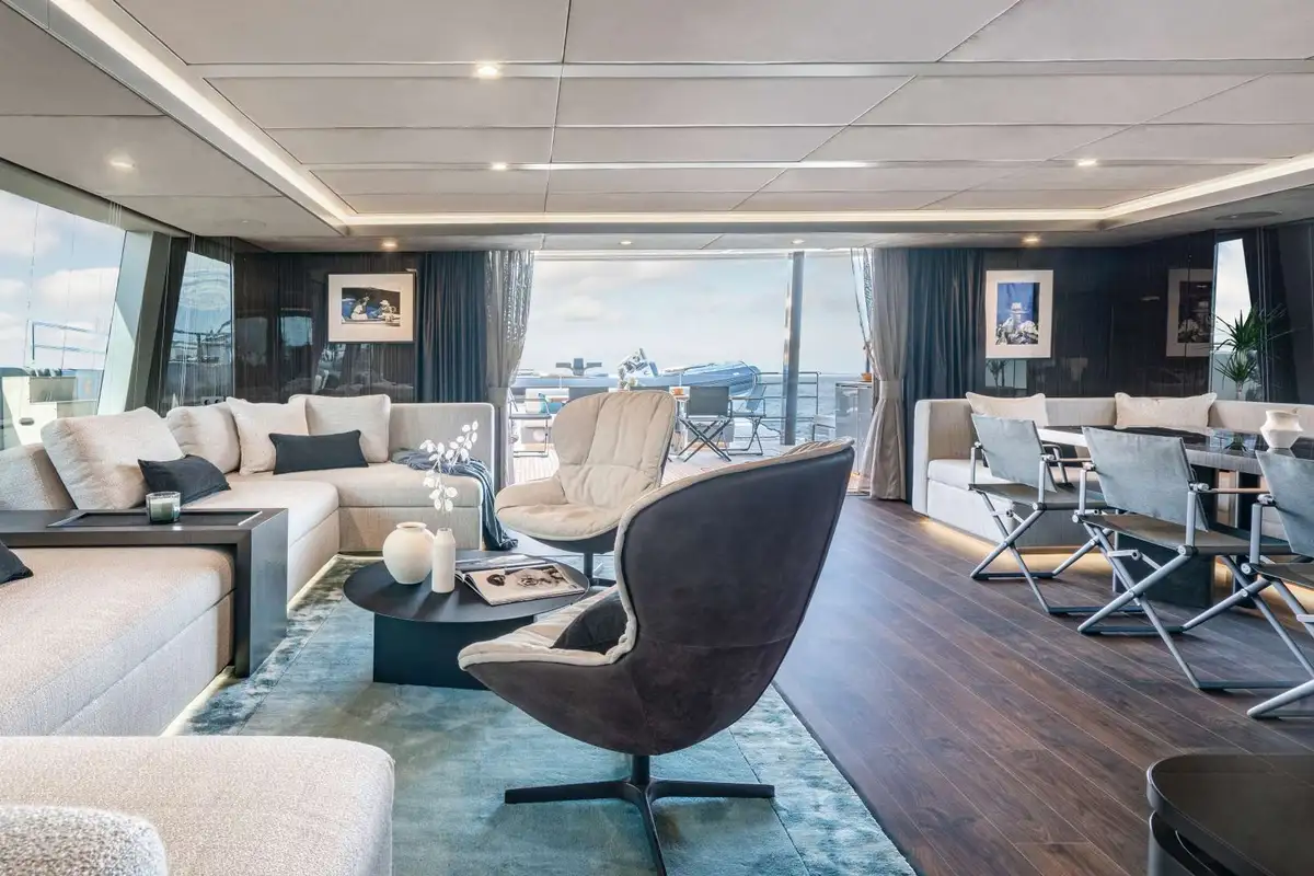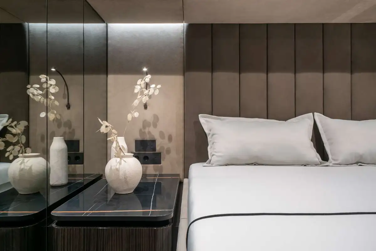 Towards the bow portion of the saloon, there is a bar area with easy access to the yacht’s large foredeck lounge. Surrounded by windows and purposefully kept open-planned, the saloon is an inviting area that flows beautifully into the outdoor spaces. The foredeck terrace has plenty of comfortable seating around the coffee table, perfect for morning coffee with a sunrise. Sun pads can be found in all corners of the foredeck. The aft deck houses the cockpit, outdoor fridge, large dining table and seating and sun pads that are convertible to a sofa. The flybridge is a vast and soothing retreat with numerous lounging, dining and sunning options along with a central drinks bar with panoramic views.