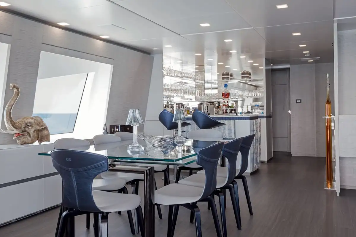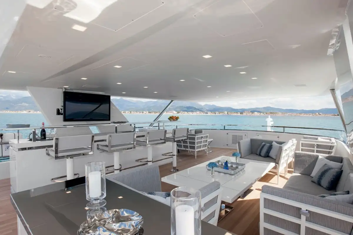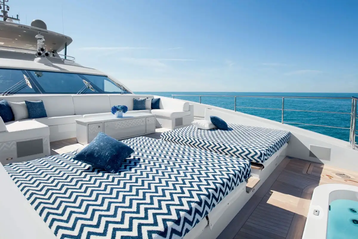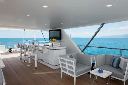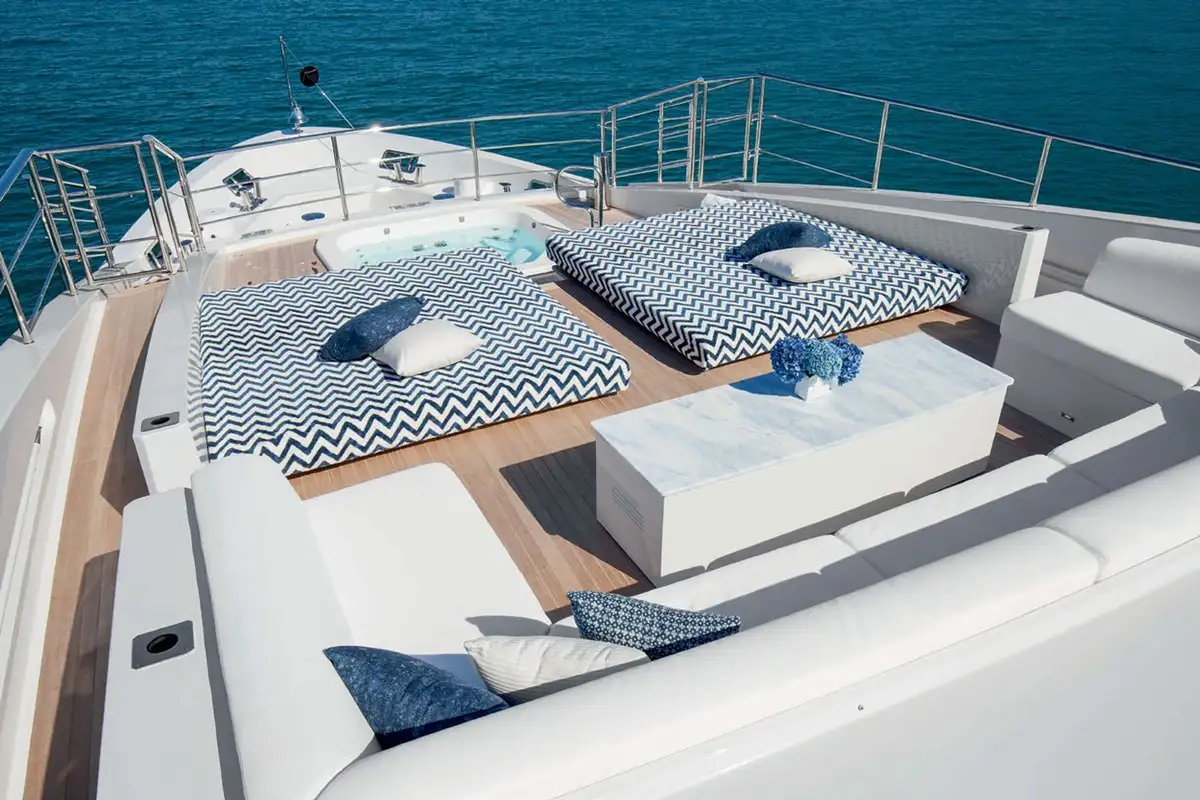 Outside, H boasts fantastic deck spaces, including dining for 10 guests on the main deck aft with hydraulic table and a large circular dining table for 10 on the bridge deck aft, with glass panels providing protection from the elements. The sky lounge features accents of navy blue, a beautiful blue marble bar, comfortable seating area with wraparound couch and a glass dining table for 8-10 guests. A split-level foredeck in front of the bridge features a jacuzzi and two double sun pads, as well as a wide seating area with a removable sun shade and sensational views.
