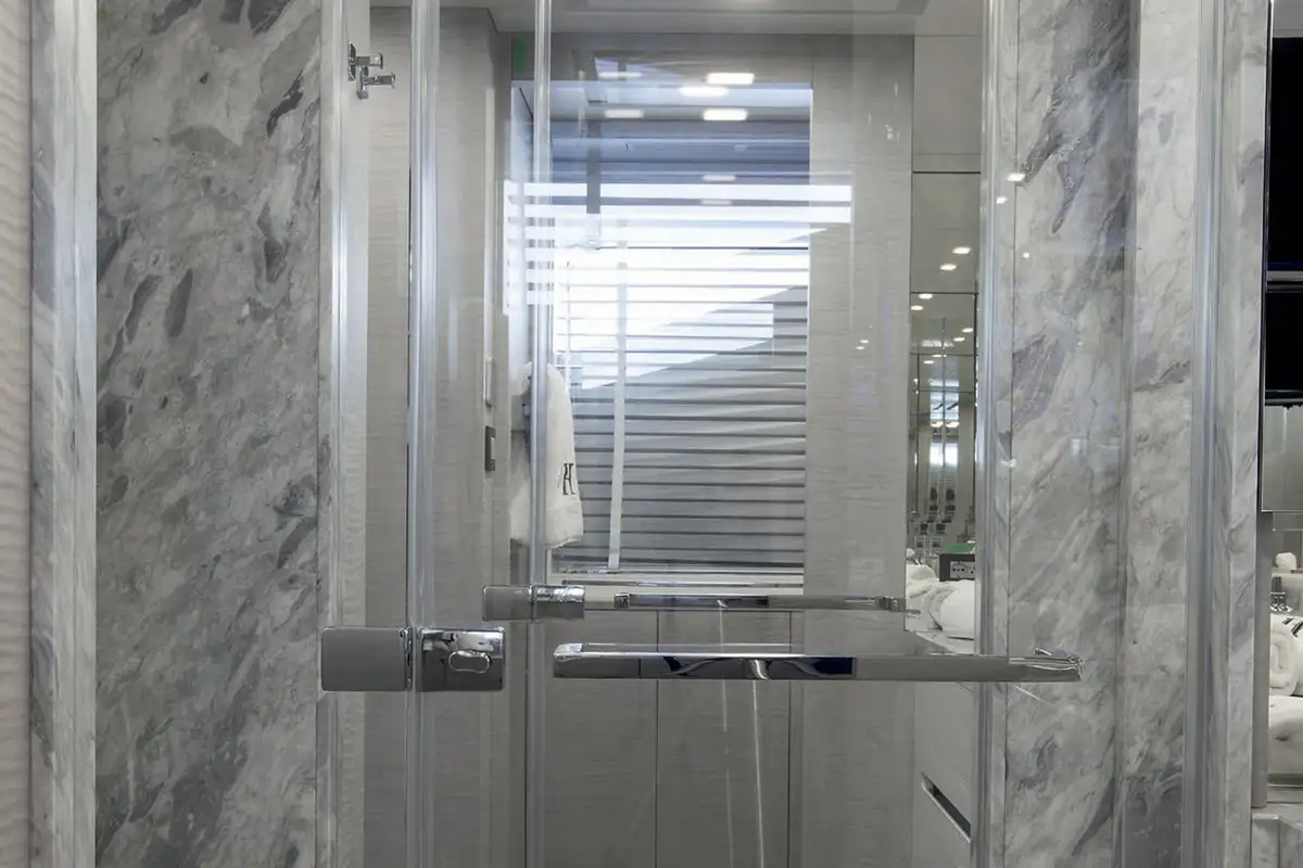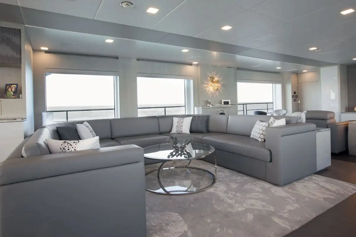Cool and modern, her zen interior is beautifully designed with grey sycamore walls and pale wenge wood flooring. Soft, warm leather contrasts with cool glass and marble and there are subtle details such as leather panels in the floor and woven leather detailing in the cabins.