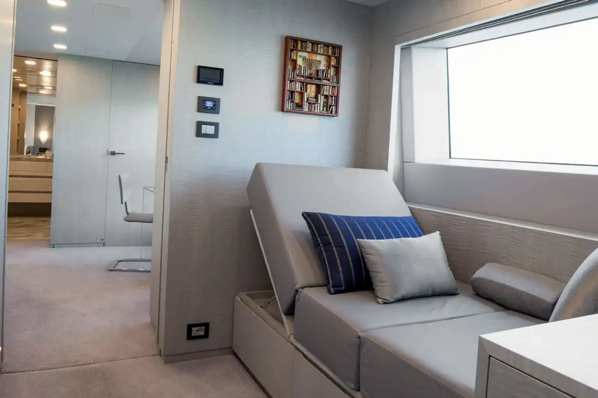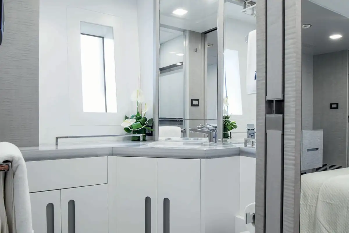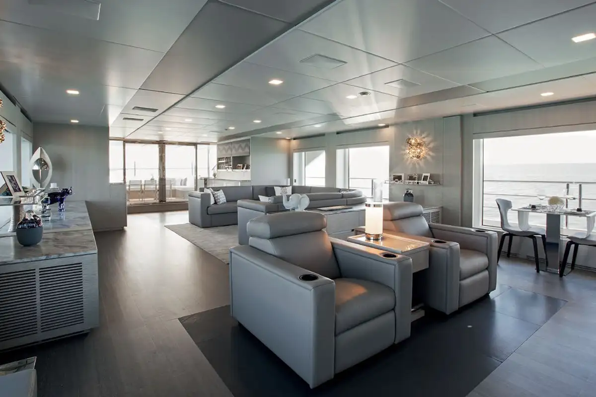 She has two double and two twin cabins on the lower deck at water level offering tranquil views across the horizon. Each double can interconnect with the adjoining twin cabin, and can be converted into a single, VIP suite with bedroom and lounge if preferred. The master suite is forward on the main deck with a ‘meditation room’ with an oversized lounge bed and 46 inch flat screen TV. This deck also houses a magnificent, luminous main lounge with panoramic windows and a cinema area with two extra large reclining seats.