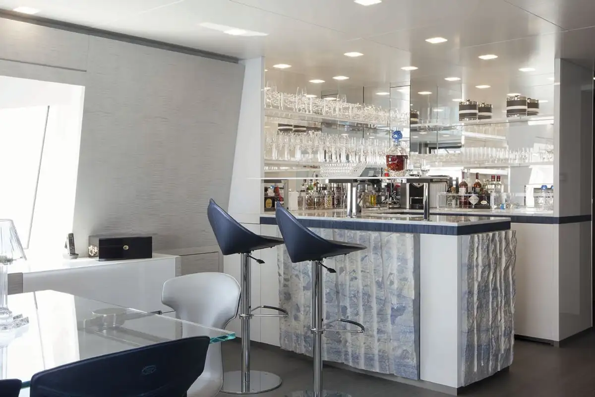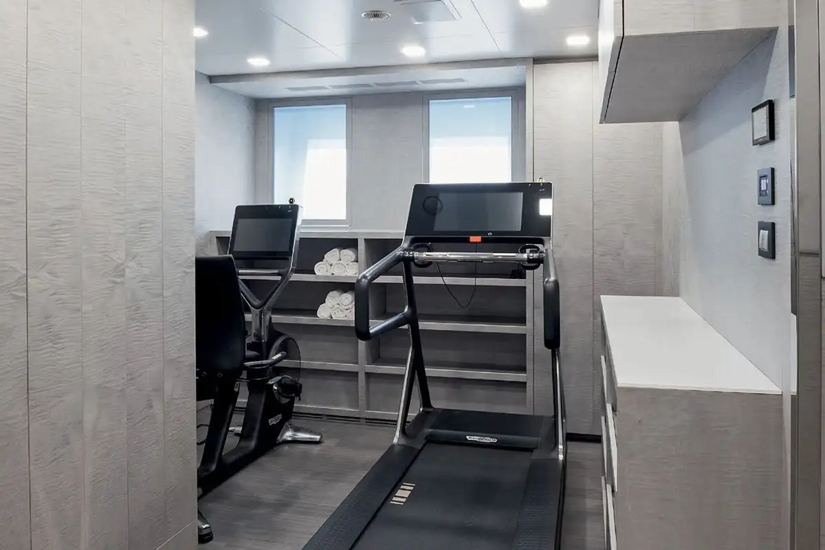 At the aft, her chic beach club at water level offers another area to relax. Watertoys include a fun water slide, SeaBobs and a full set of beach games to take ashore. The gym includes Techno treadmill and recumbent bike and a workout bench.