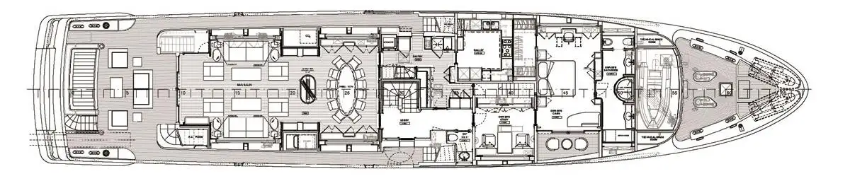 Her interior style is contemporary-classic, with a very high standard of finish thoughout. The main deck saloon is a roomy and welcoming sitting room with a partially separate space for formal dining. The upper saloon serves a dual purpose as a smart-casual cocktail bar and family TV room.
