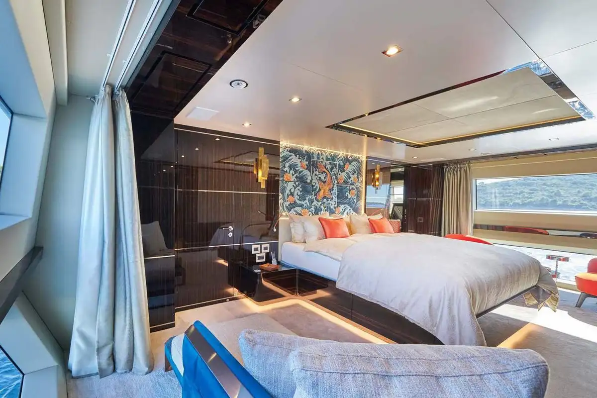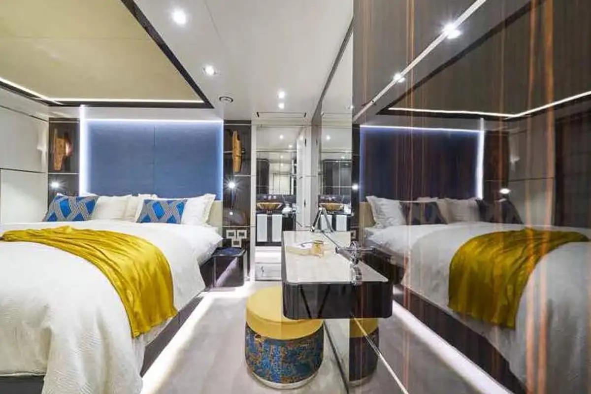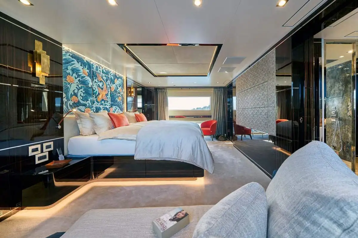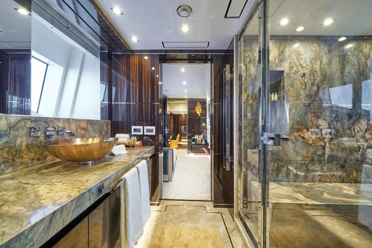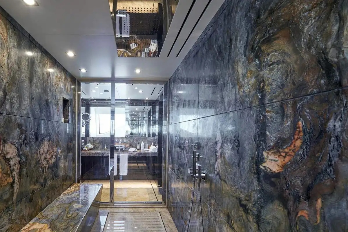 On the main deck is the chic main salon, featuring silk artworks created from millions of individual hand stitches. The formal dining table seats 10 and is situated forward in the main salon. On the aft deck is a further table which seats 9 guests and in the entrance way are temperature controlled wine fridges. Moving forward on the main deck is the full beam master suite. This spacious suite includes an office and 2 generous dressing rooms. The bathroom has his and hers heads (with additional bidet) and a large steam shower. The stunning marble floor is also heated. One of the special features of the master suite are the double windows on each side, allowing views of the water and the horizon.
