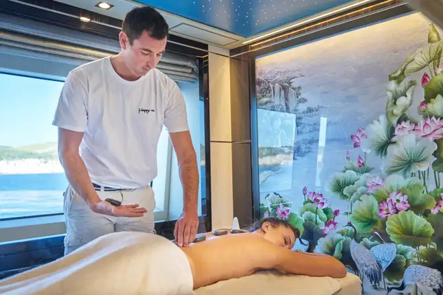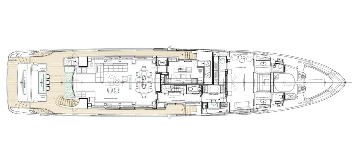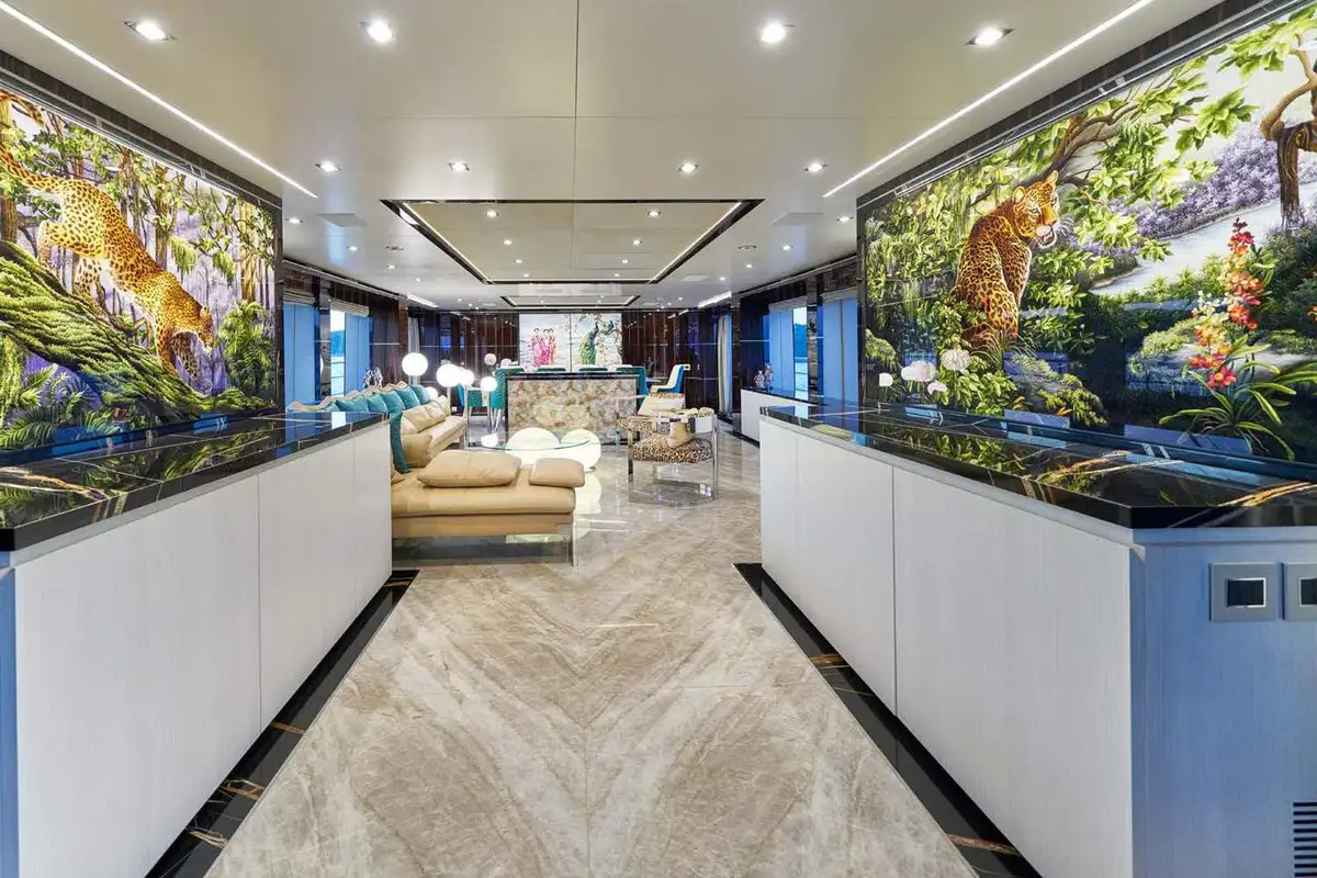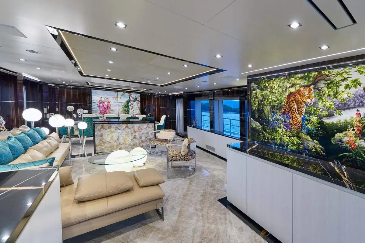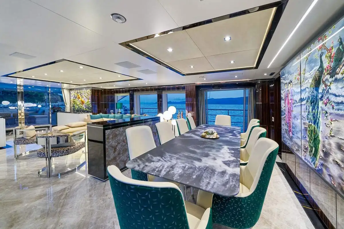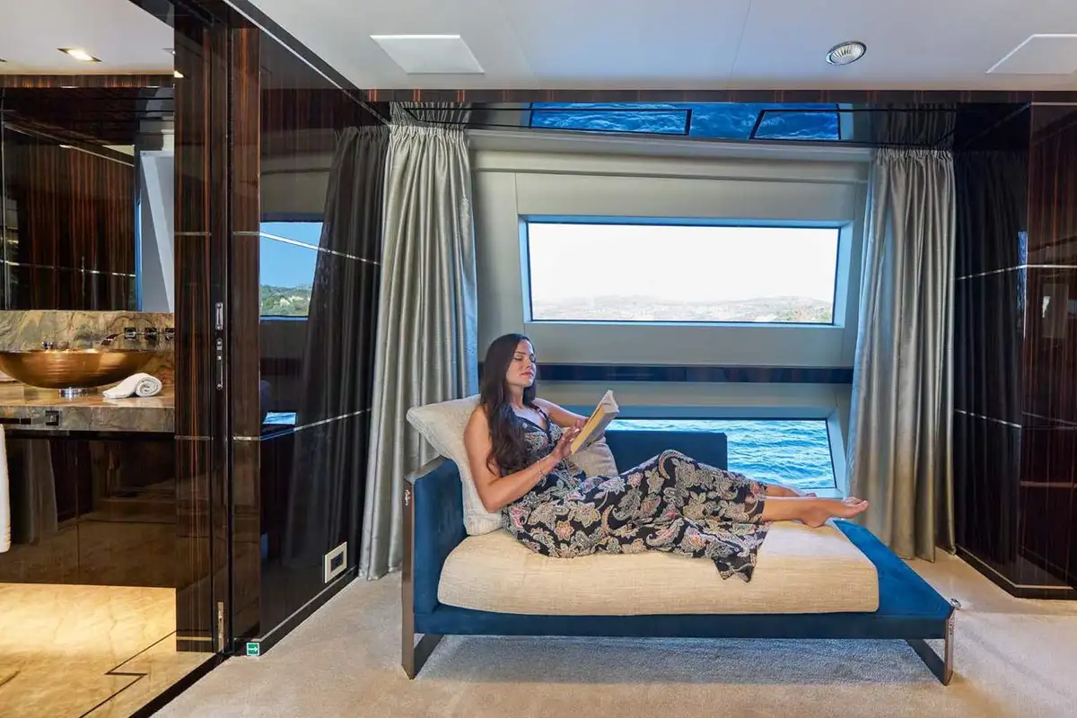 On the main deck is the chic main salon, featuring silk artworks created from millions of individual hand stitches. The formal dining table seats 10 and is situated forward in the main salon. On the aft deck is a further table which seats 9 guests and in the entrance way are temperature controlled wine fridges. Moving forward on the main deck is the full beam master suite. This spacious suite includes an office and 2 generous dressing rooms. The bathroom has his and hers heads (with additional bidet) and a large steam shower. The stunning marble floor is also heated. One of the special features of the master suite are the double windows on each side, allowing views of the water and the horizon.