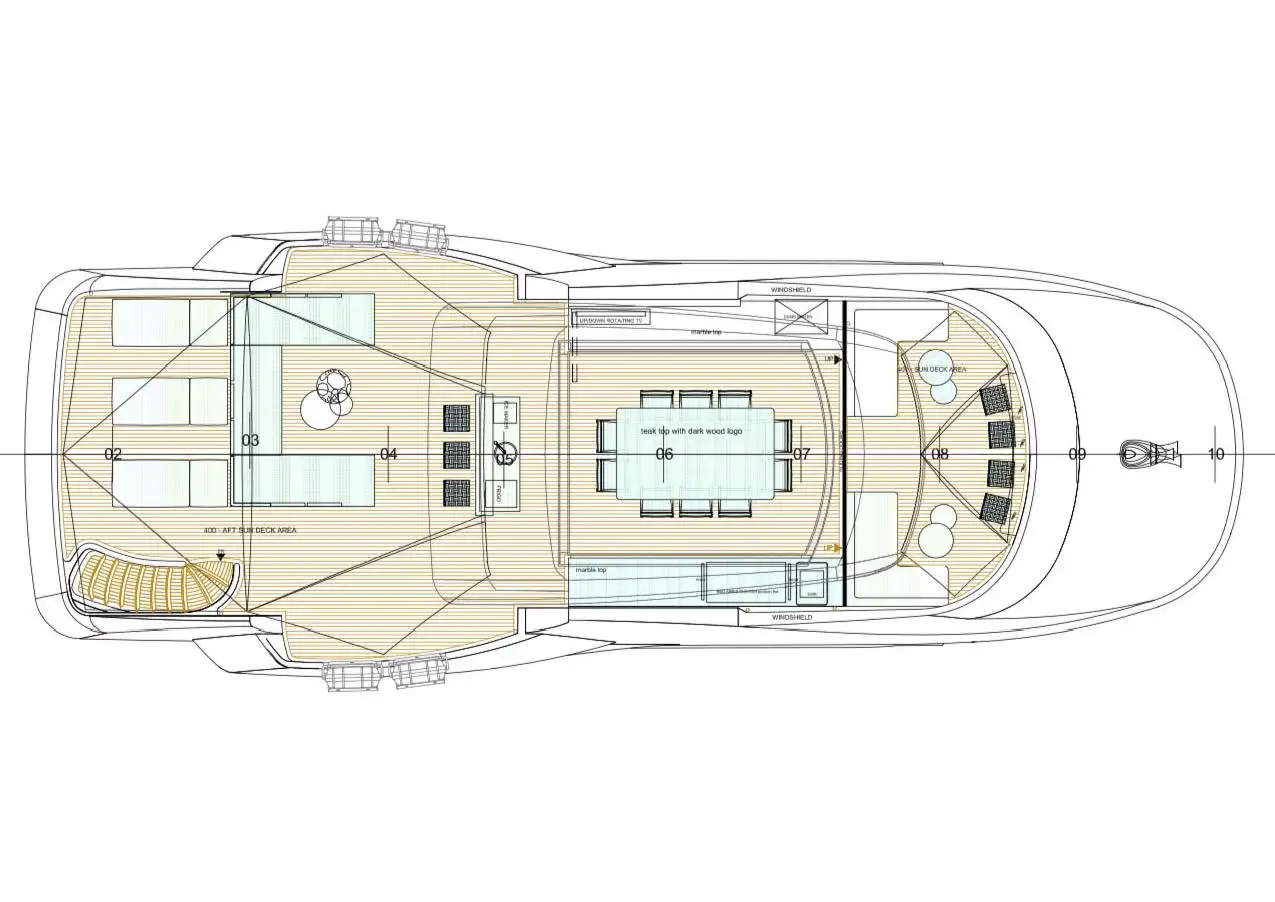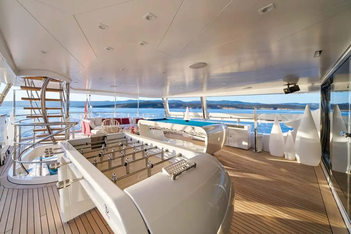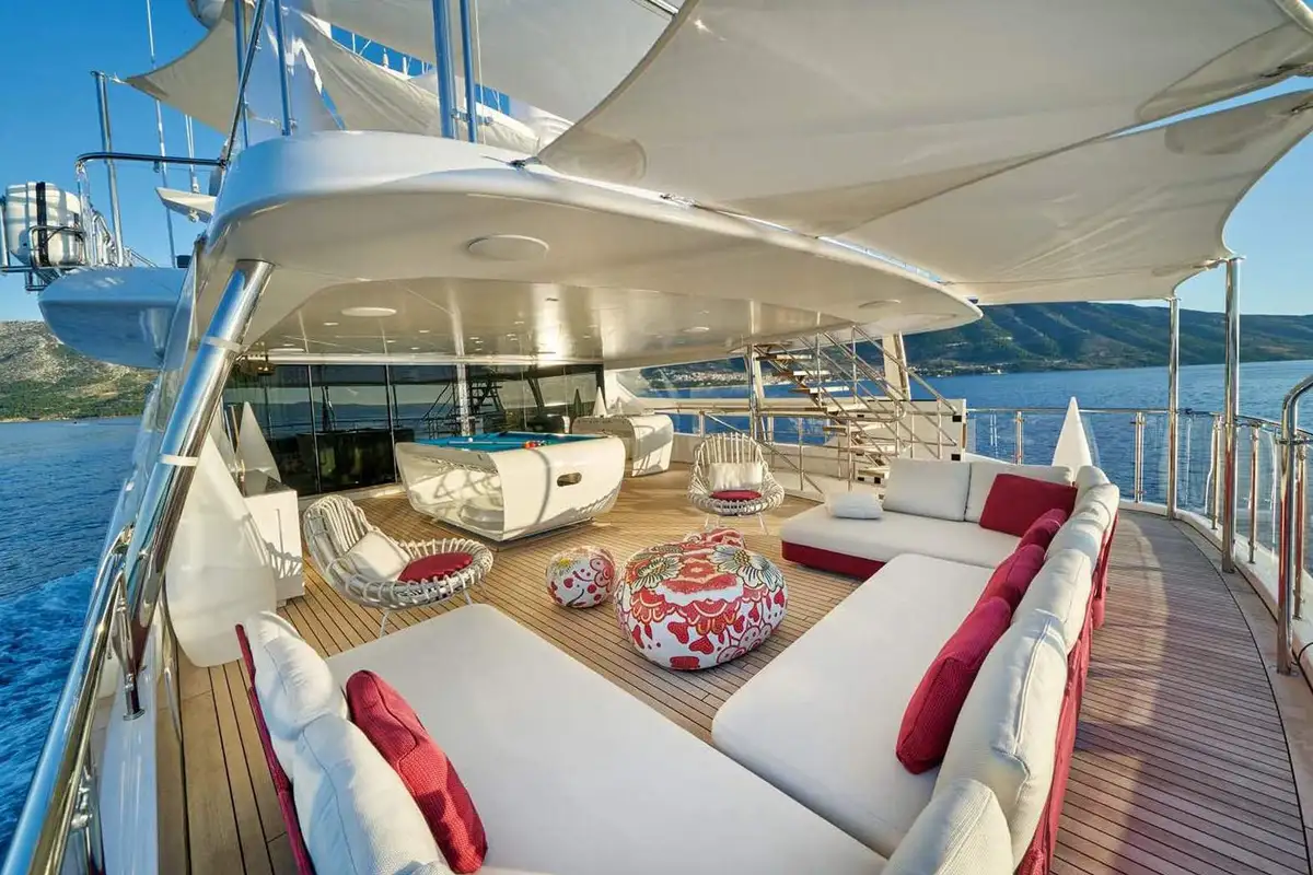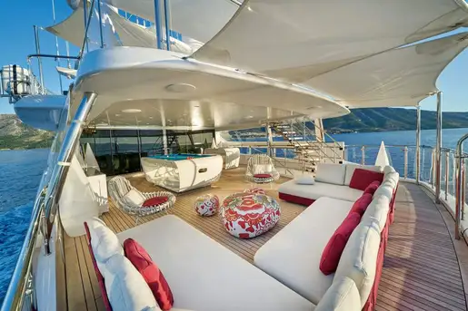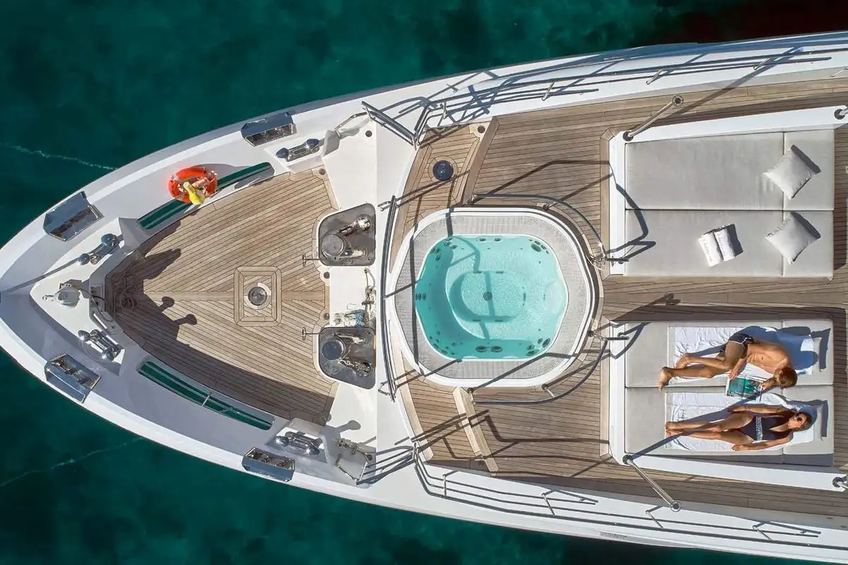 Her large sundeck is the perfect place to relax, featuring bar stools forward for watching the world go by, a central dining table for 10, crafted of teak and marble, 4 exercise machines (treadmills and bikes), a large sofa and plenty of sunbeds aft. The central section has a fully retracting roof, sliding glass doors and ceiling heaters, offering the greatest possible flexibility and comfort in all weather and wind conditions. There is also a BBQ and a pop-up television. Both the forward and aft sections have removable bimini covers for shade as required. One of the many special features of HAPPY ME is the foredeck sunbathing area, with a 6-person Jacuzzi, 2 tables which can be raised and lowered, sunpads with moveable headrests and a retractable bimini for shade.