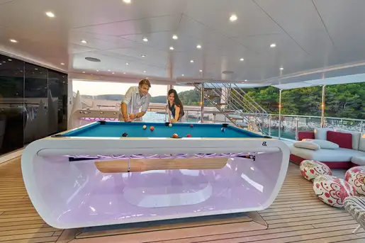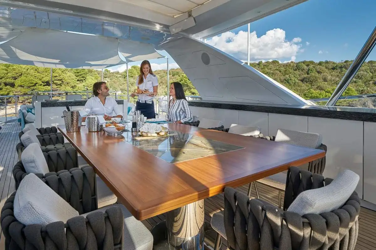 Guests can be whisked off to ports and secluded beaches in the comfortable and fast 12m / 40ft chase boat (with 850 hp) and there is a huge selection of water sports toys onboard to keep all entertained. Getting on and off the tender and toys is made easy with the inflatable docking pontoon and there is a large swim platform with 2 umbrellas and a shower. The experienced charter crew (including a stewardess and deckhand who are also masseuses) will ensure guests have a safe and thoroughly enjoyable charter experience.