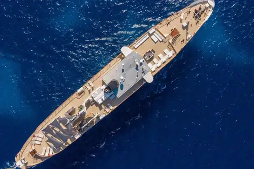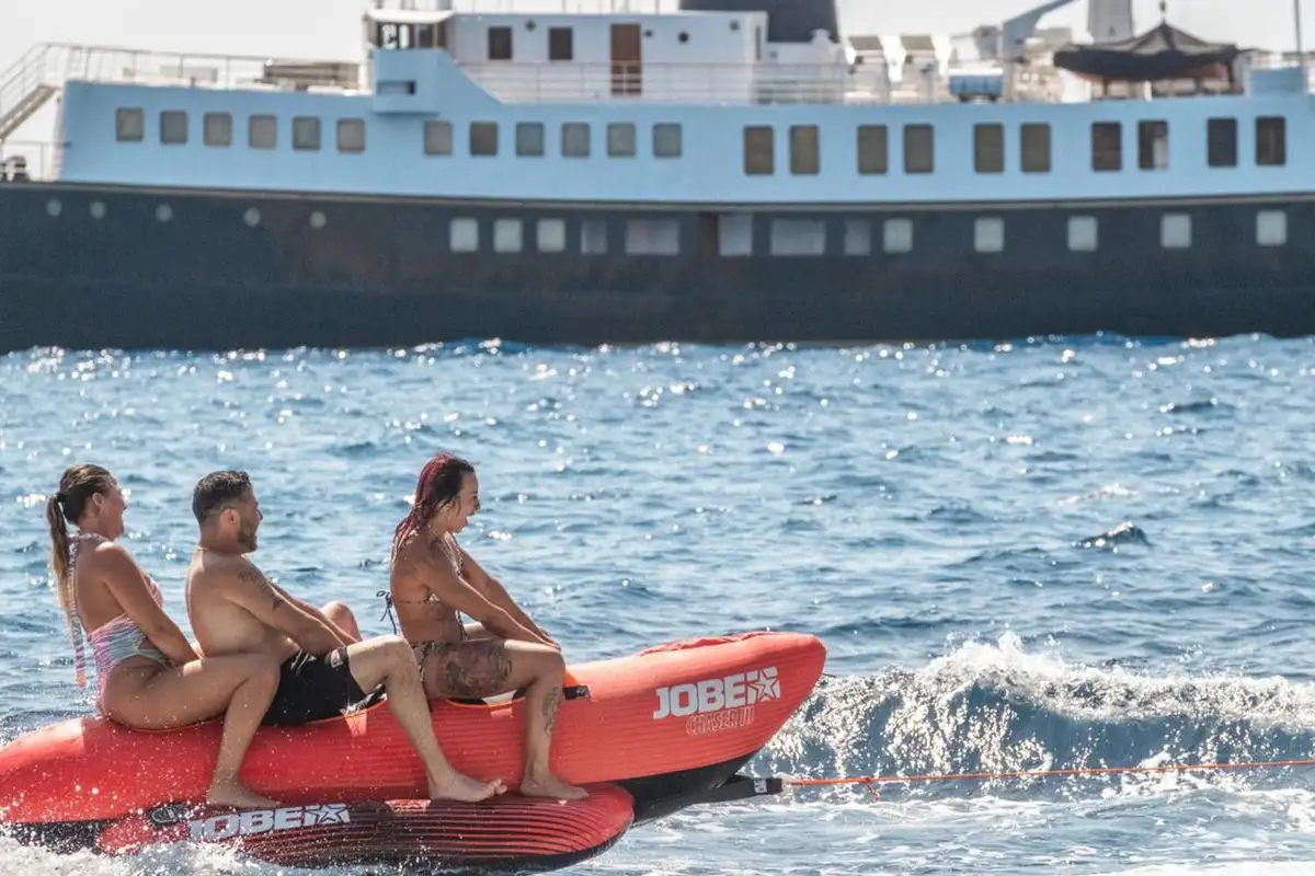 She also has an aft cockpit on the lower deck with direct access to the extended bathing platform, which is an excellent launch pad for watersports – there’s a pair of jetskis and some paddleboards as well as inflatable tows for her extra-large RIB tender, which is ideal to take your whole group ashore for a party on a remote beach, or for swift, comfortable transport into harbour for shopping or dining trips.