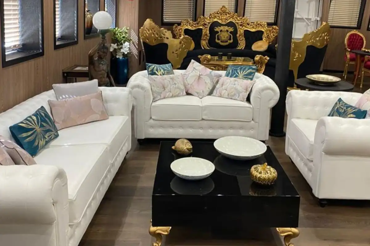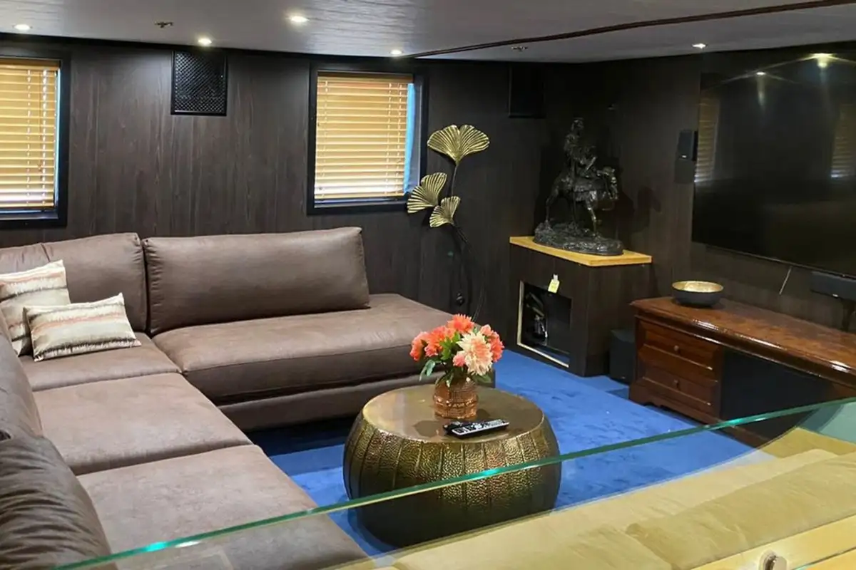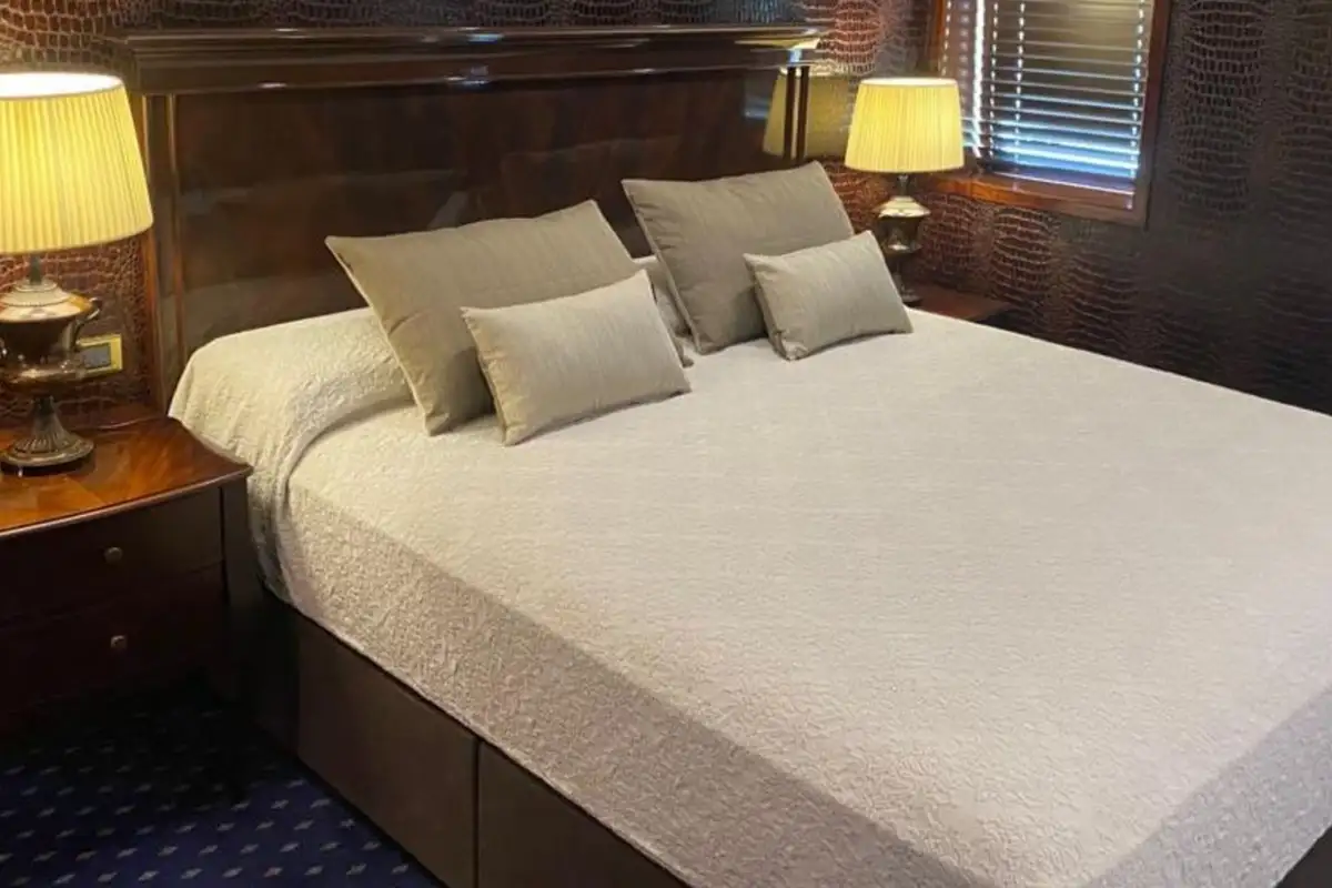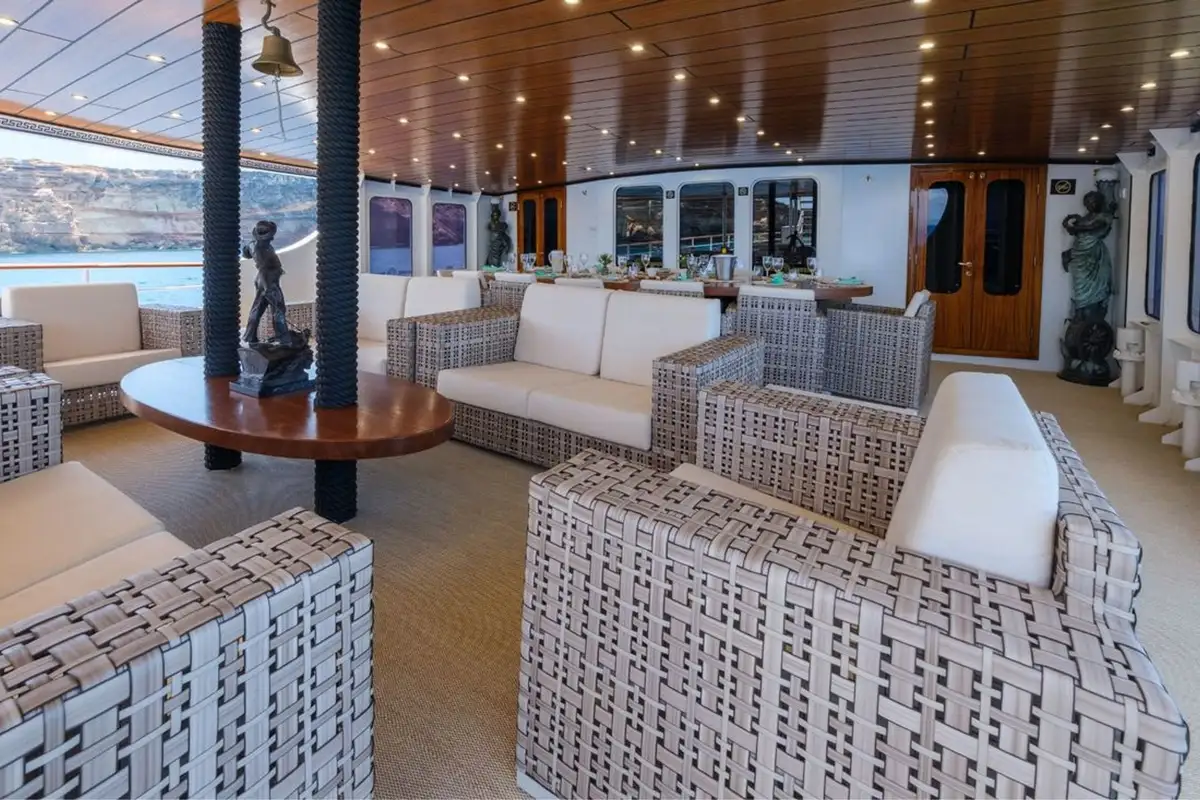 Her inside spaces include a piano bar, a cosy snug, a dining room and a spacious lounge, plus a cinema room and a casino with a roulette table and armchairs on the lower deck.