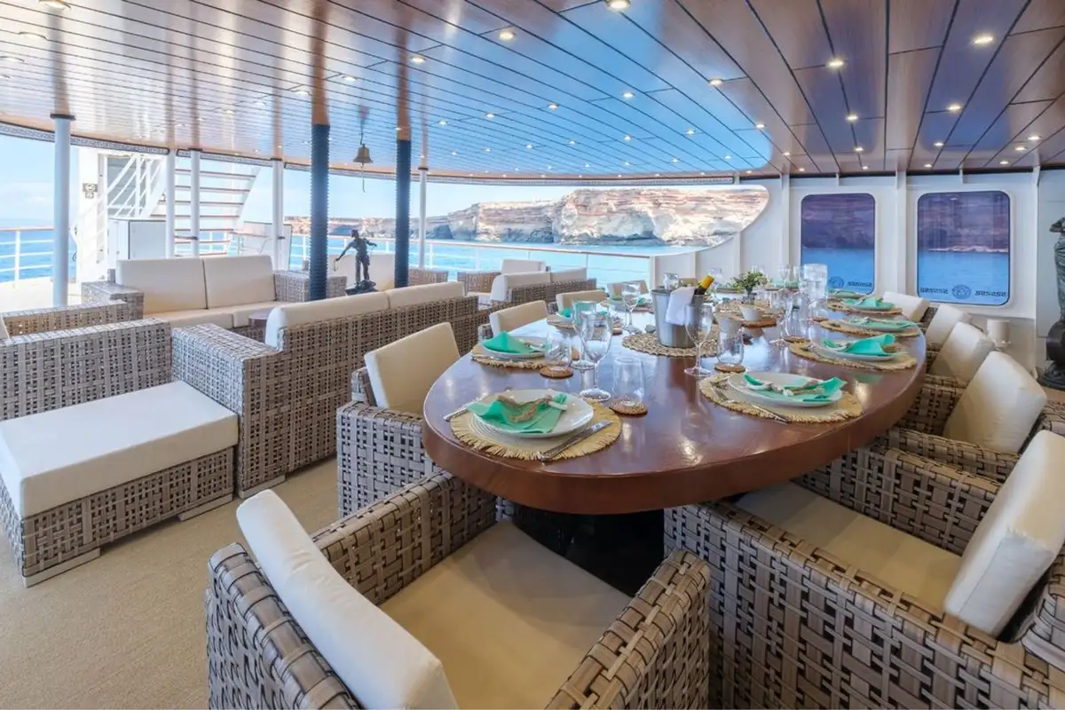The master cabin has a lounge area and a study desk, great sea views through large picture windows and a king size bed. The other guest cabins include large doubles with queen size beds, desks and chairs, standard doubles and twins. Each cabin has its own private en suite bathroom.