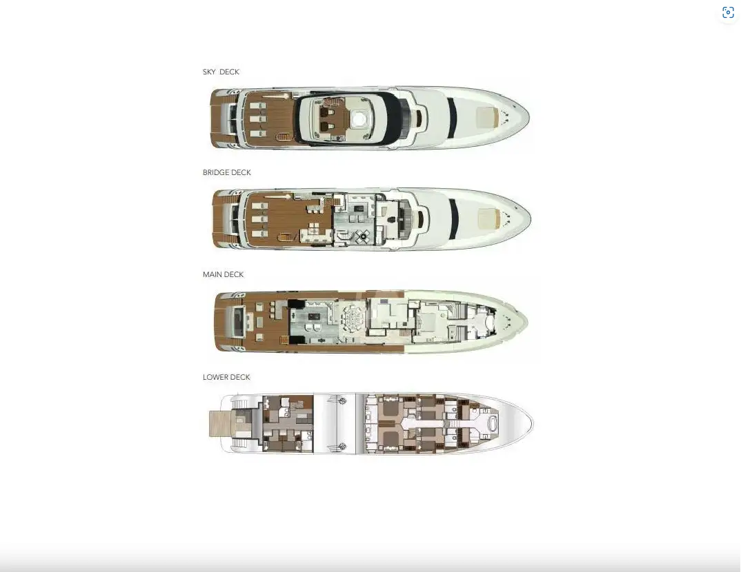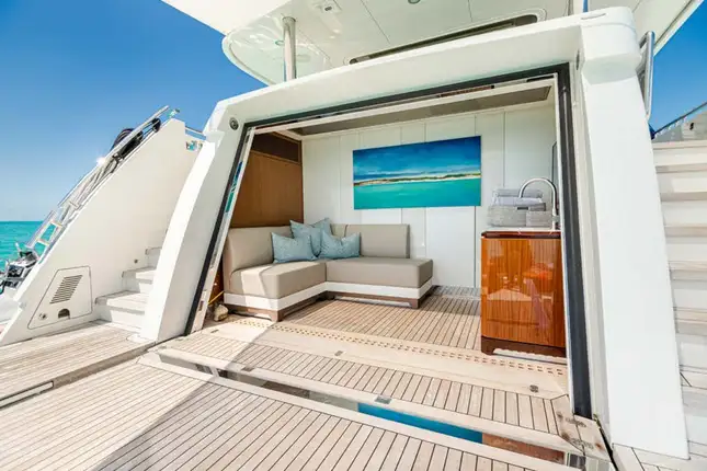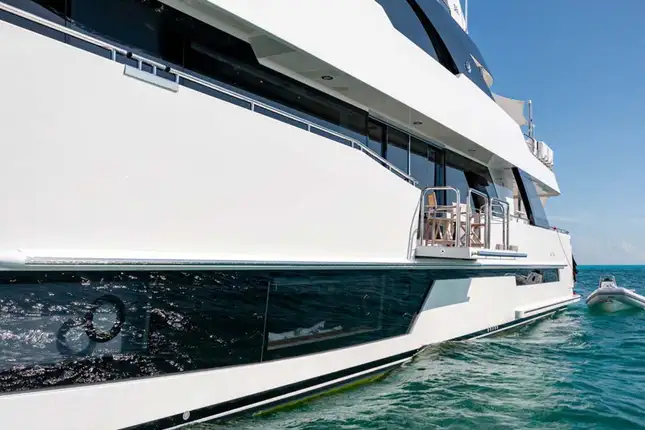 On board highlights include the hardtop sun deck with its big jacuzzi, bar and sociable seating, all in ample shade; the sea-level beach club with comfy sofas in her stern; the magnificent master suite with its commanding view; and the extra-large through-hull windows in all other cabins so every guest can wake up with an inspiring view of the sea.