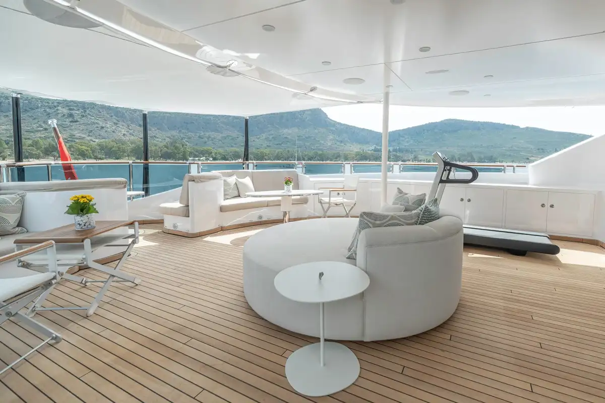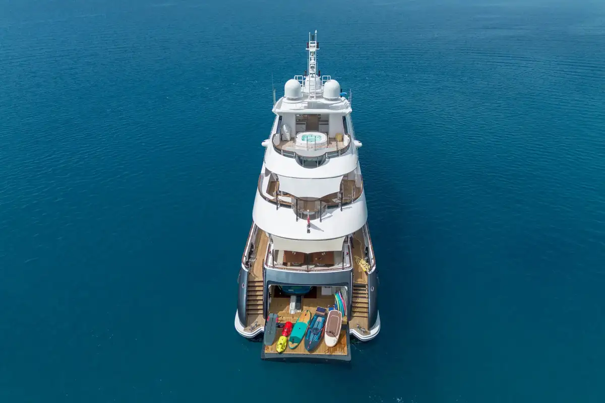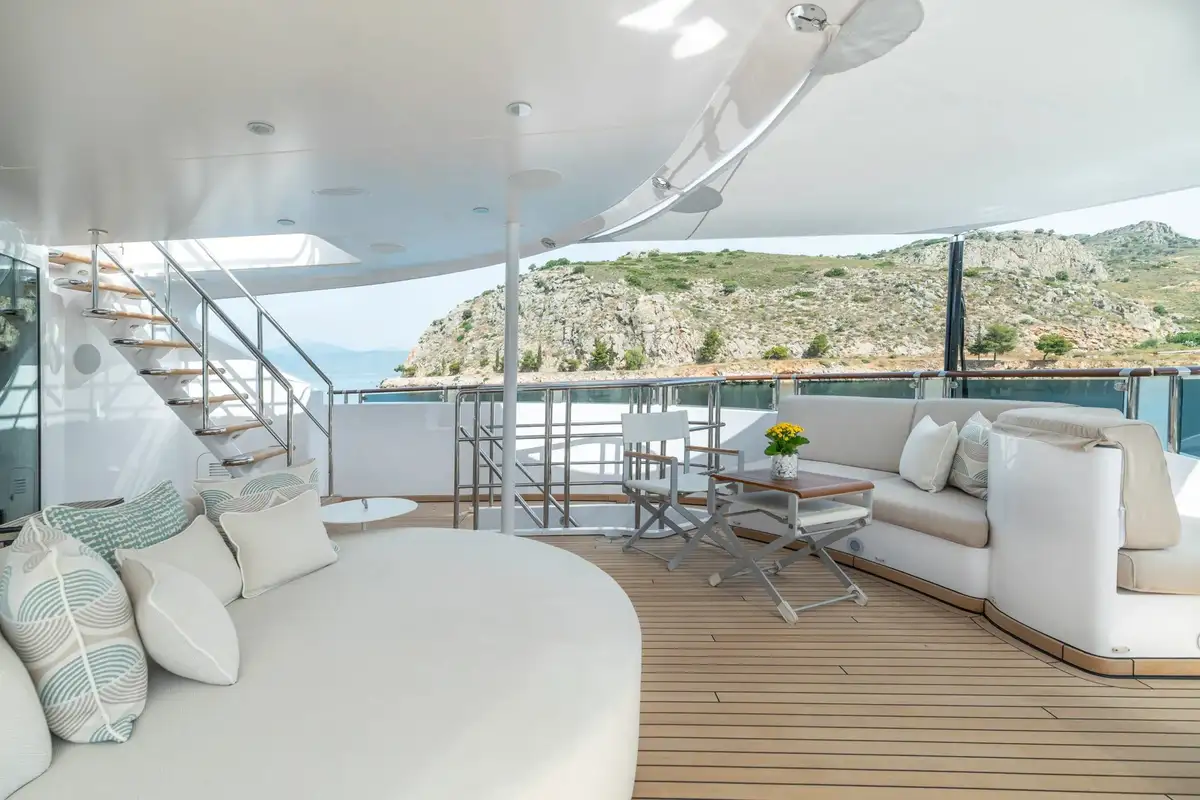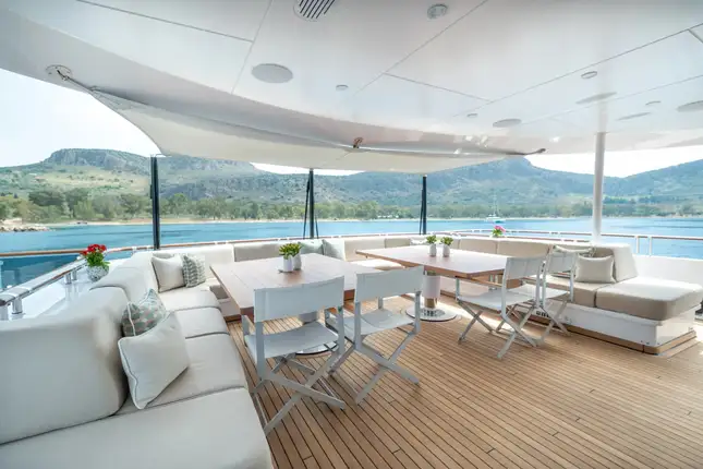 Her exterior spaces are equally impressive. The sun deck invites long days of relaxation with a jacuzzi, sunpads and a shaded al fresco dining area, all framed by panoramic sea views. The upper deck aft provides a stylish spot for evening aperitifs, and the main deck aft is perfect for casual breakfasts or sunset drinks. A beach club at water level ensures effortless access to the sea.