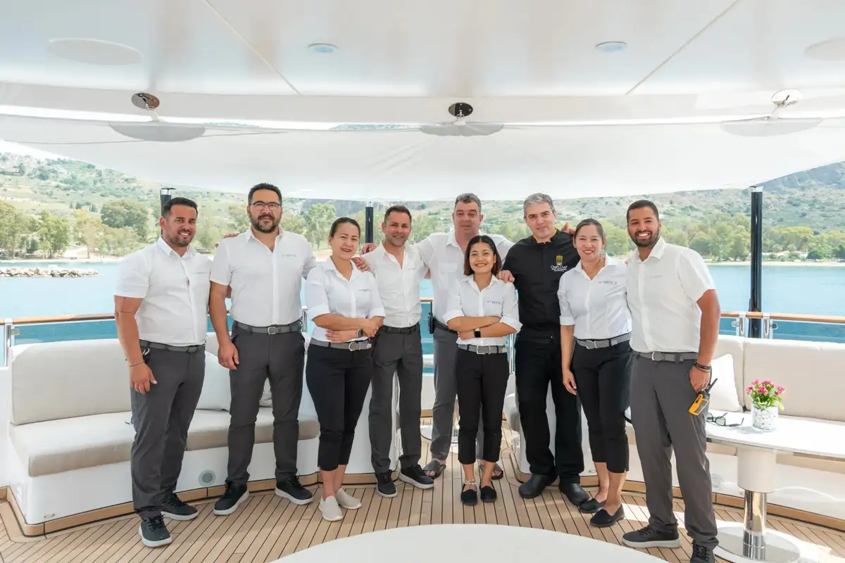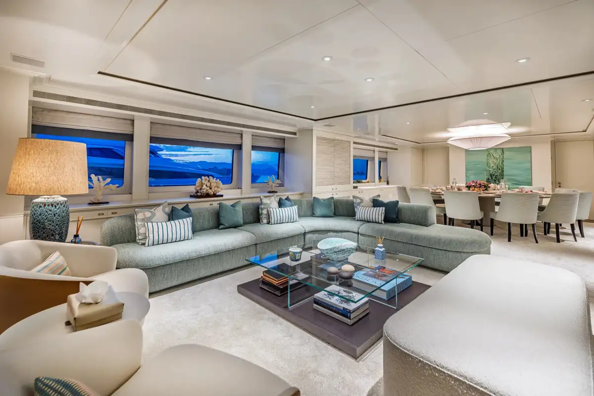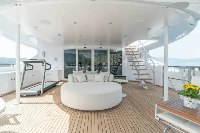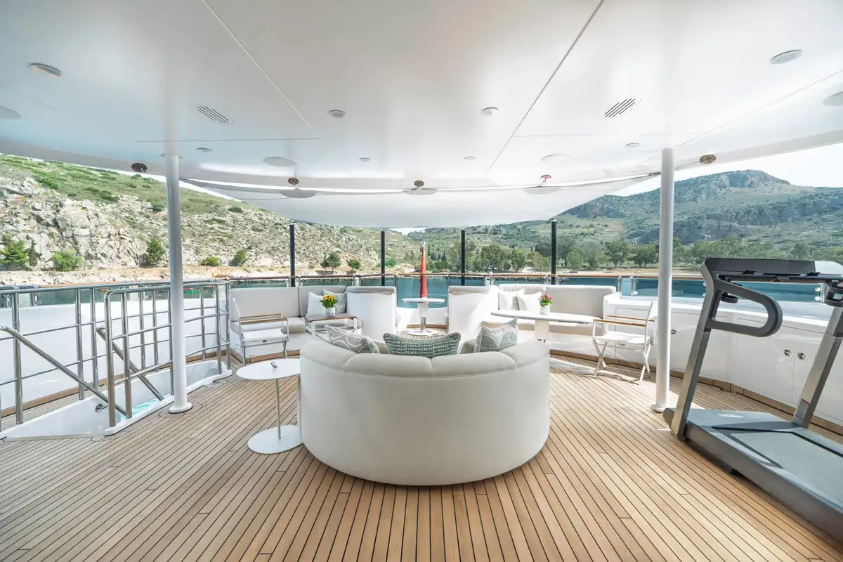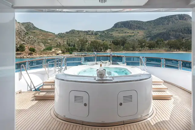 Her exterior spaces are equally impressive. The sun deck invites long days of relaxation with a jacuzzi, sunpads and a shaded al fresco dining area, all framed by panoramic sea views. The upper deck aft provides a stylish spot for evening aperitifs, and the main deck aft is perfect for casual breakfasts or sunset drinks. A beach club at water level ensures effortless access to the sea.