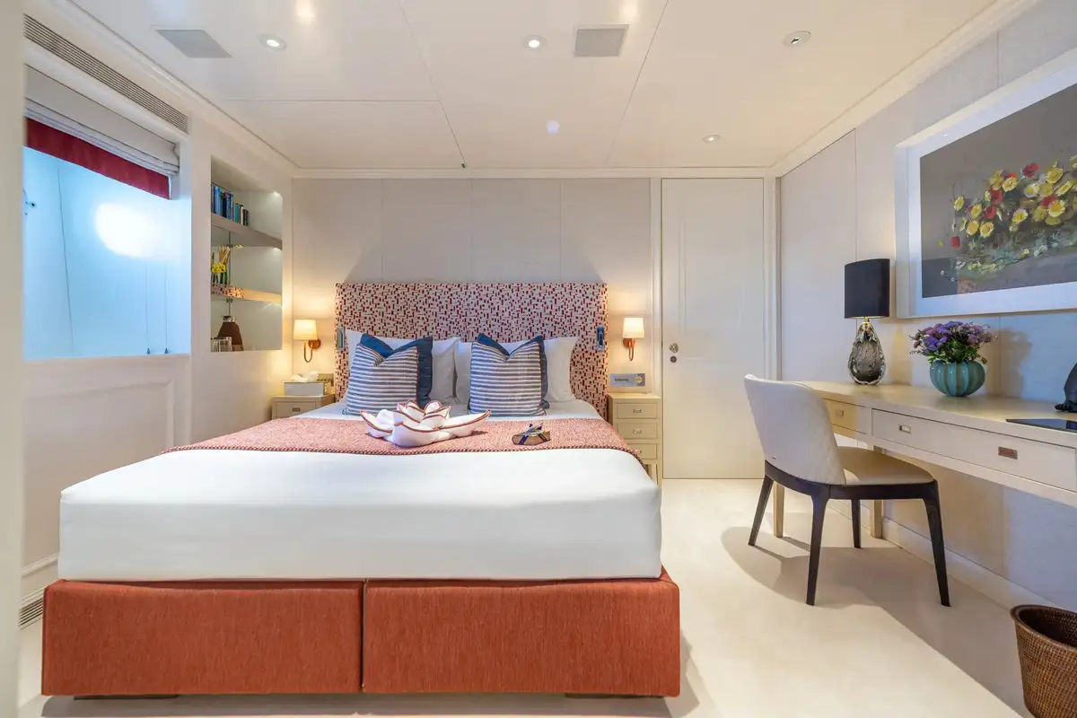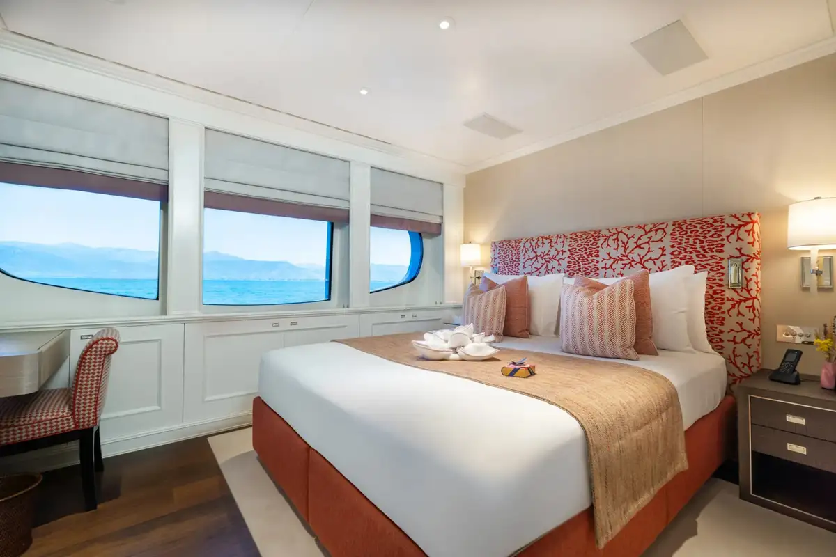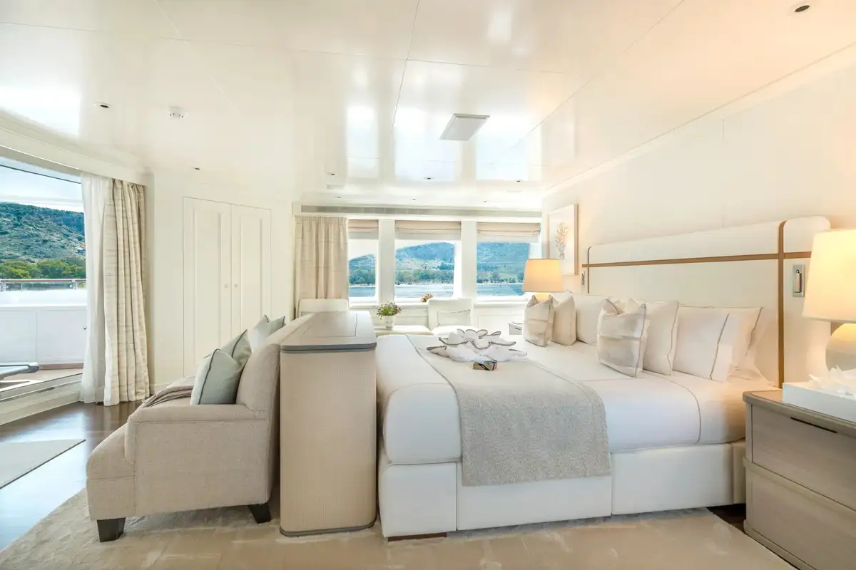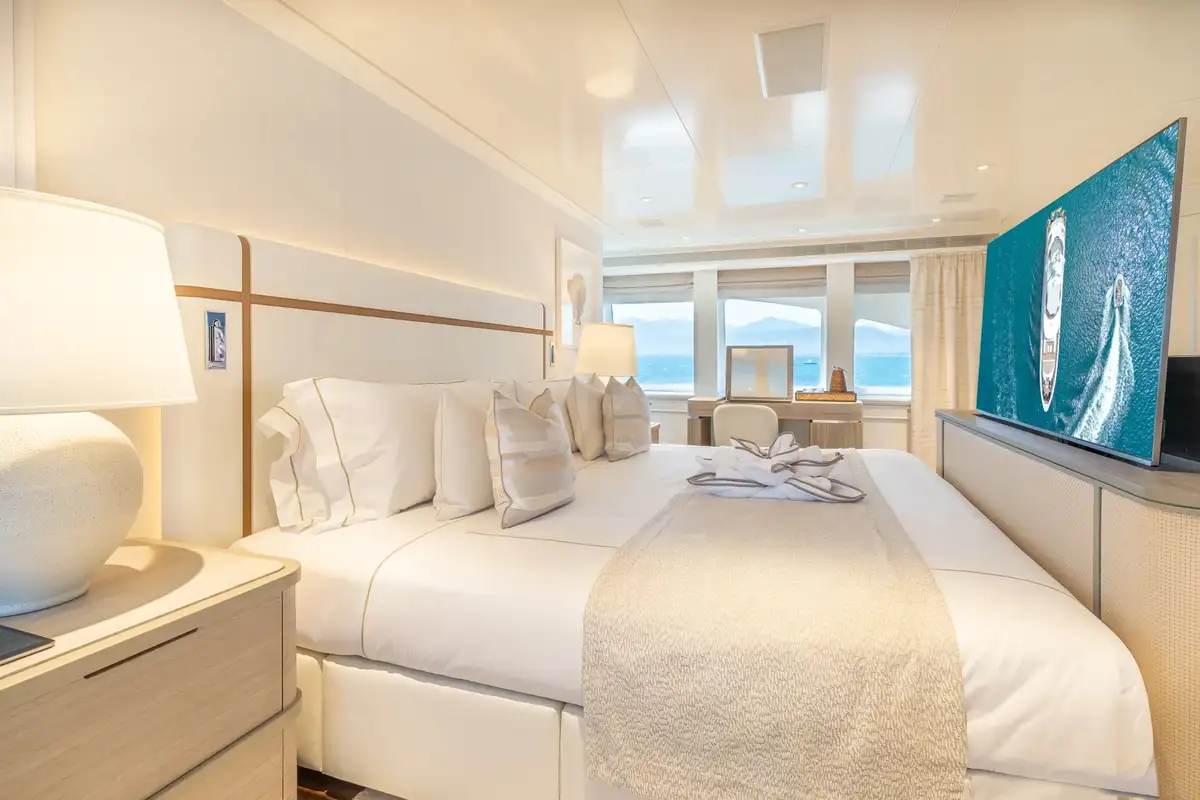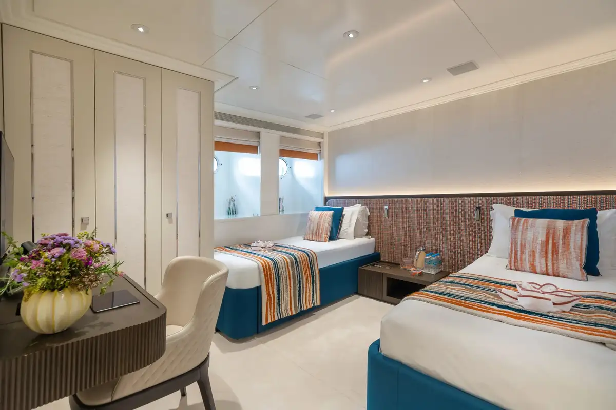 Accommodation for up to twelve guests is arranged across six cabins. The full‑beam master cabin on the main deck features floor‑to‑ceiling windows, a private study and his‑and‑her bathrooms with spa bath. A VIP cabin on the upper deck and four cabins on the lower deck—two doubles and two twins, each convertible to doubles—are all en suite and appointed with sumptuous linens and refined furnishings.