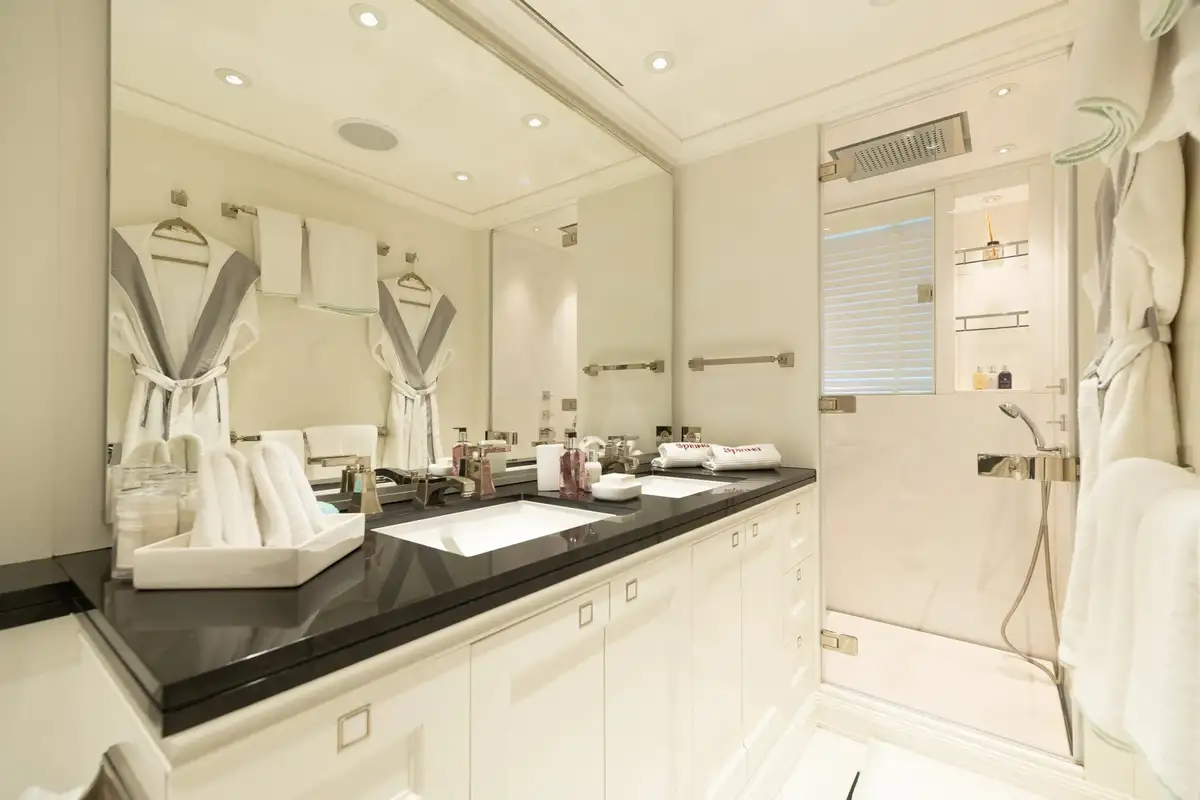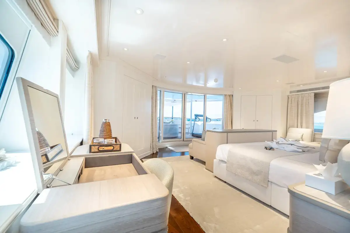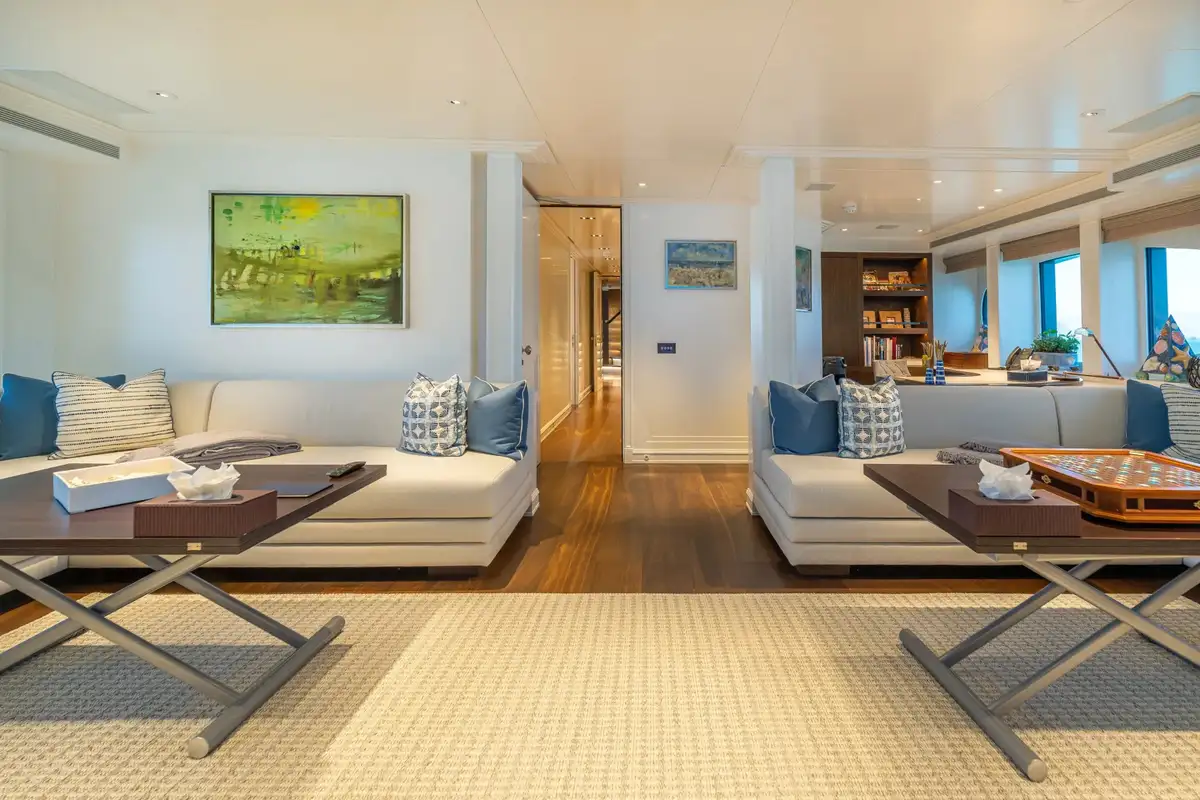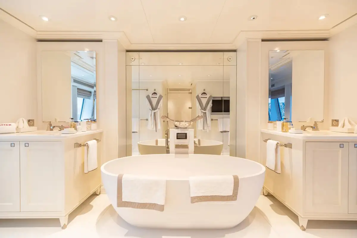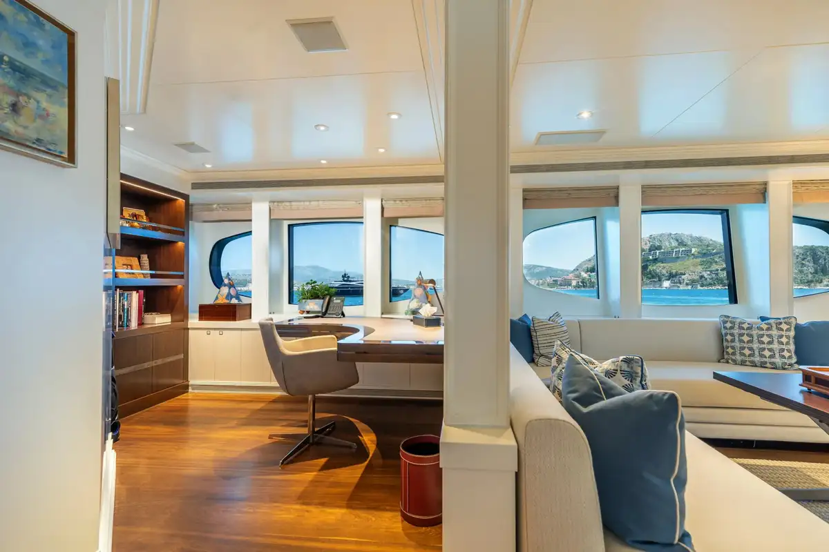 Accommodation for up to twelve guests is arranged across six cabins. The full‑beam master cabin on the main deck features floor‑to‑ceiling windows, a private study and his‑and‑her bathrooms with spa bath. A VIP cabin on the upper deck and four cabins on the lower deck—two doubles and two twins, each convertible to doubles—are all en suite and appointed with sumptuous linens and refined furnishings.