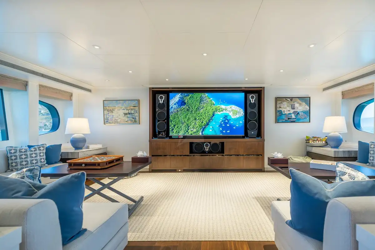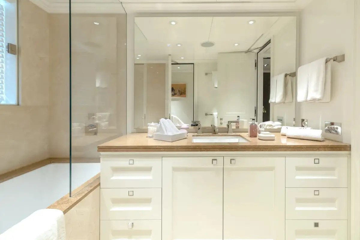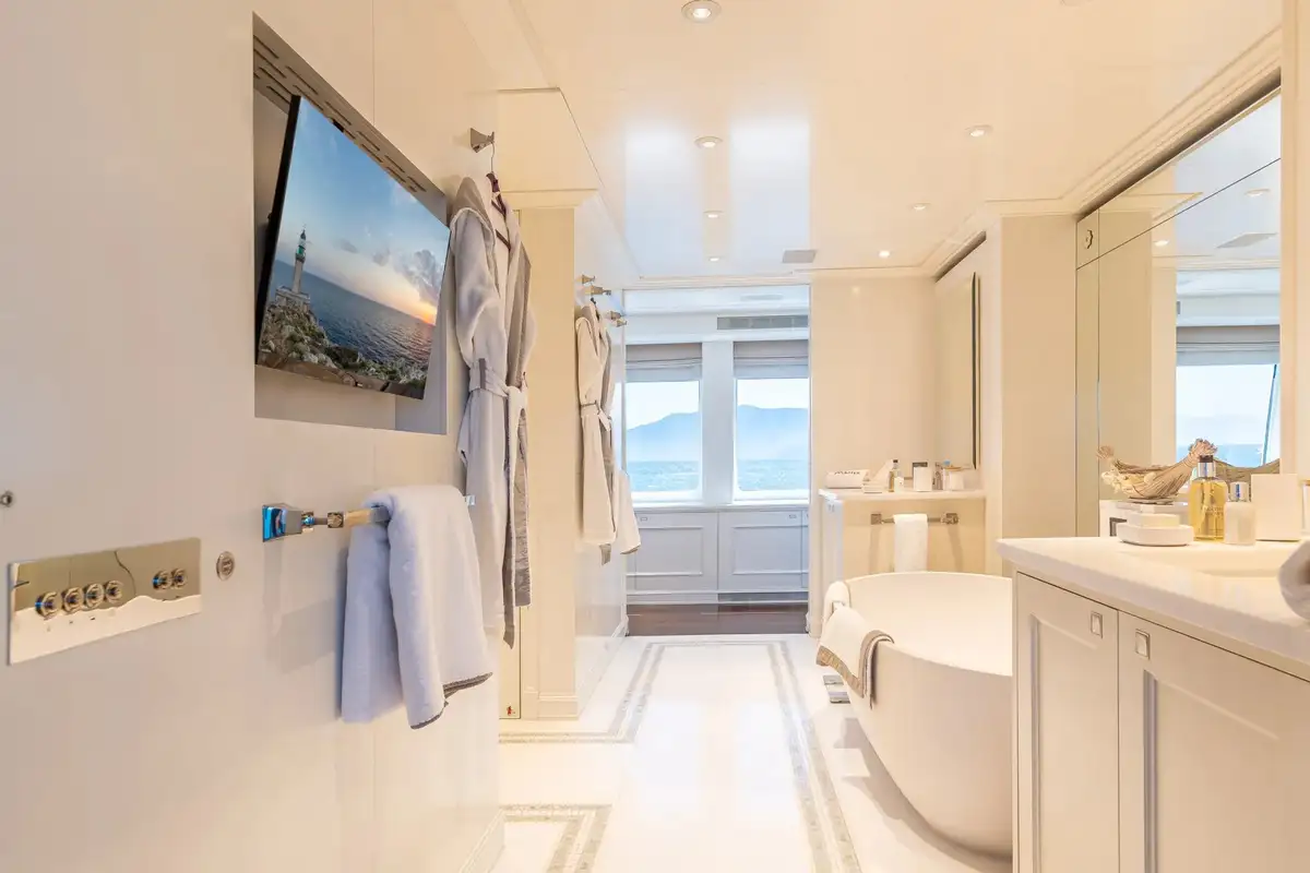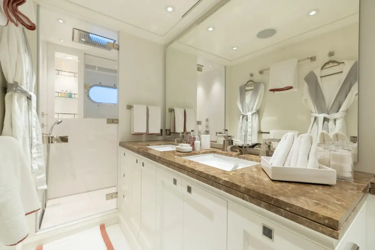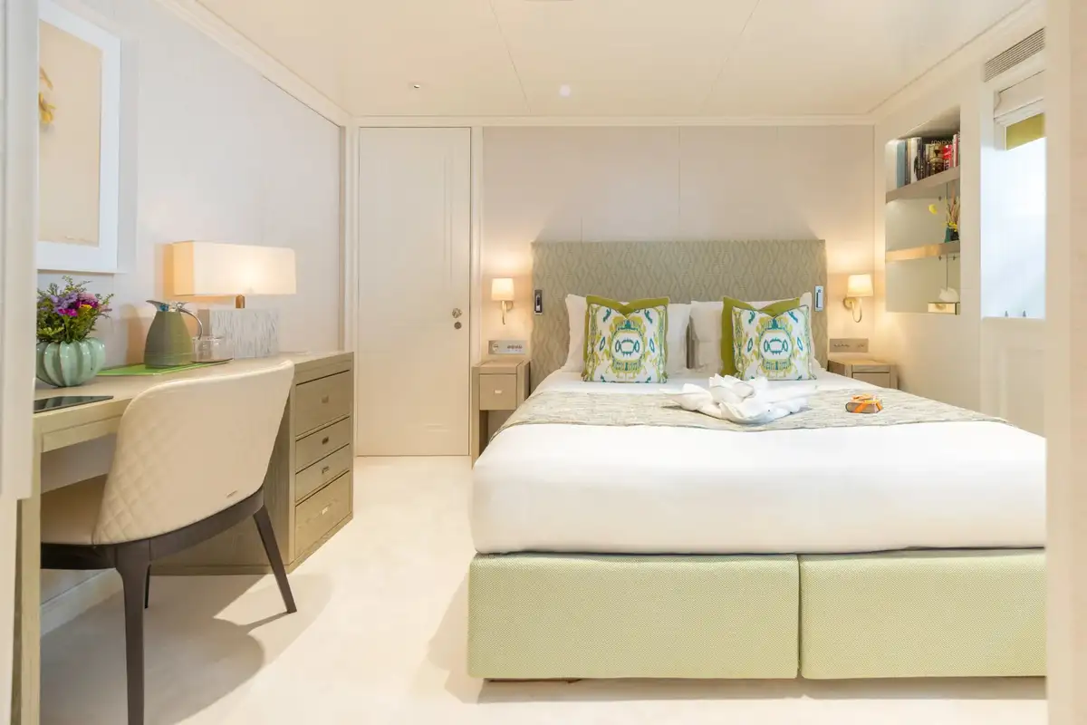Accommodation for up to twelve guests is arranged across six cabins. The full‑beam master cabin on the main deck features floor‑to‑ceiling windows, a private study and his‑and‑her bathrooms with spa bath. A VIP cabin on the upper deck and four cabins on the lower deck—two doubles and two twins, each convertible to doubles—are all en suite and appointed with sumptuous linens and refined furnishings.