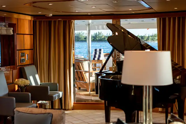 IMPROMPTU accommodates 12 guests in six stunning staterooms. The split-level master stateroom features a king-size bed, an elevated lounge with 180-degree views, and his-and-hers en-suite bathrooms featuring a steam shower, Jacuzzi tub, vanity and walk-in closet adjacent. A private study with a desk is located at the entrance. The bridge deck offers a VIP stateroom surrounded by large windows. On the lower deck, you'll find three king staterooms and a twin cabin with a Pullman, each with desk areas and shower en-suites. The charter yacht’s versatile accommodation layout makes her primed family-friendly voyages.