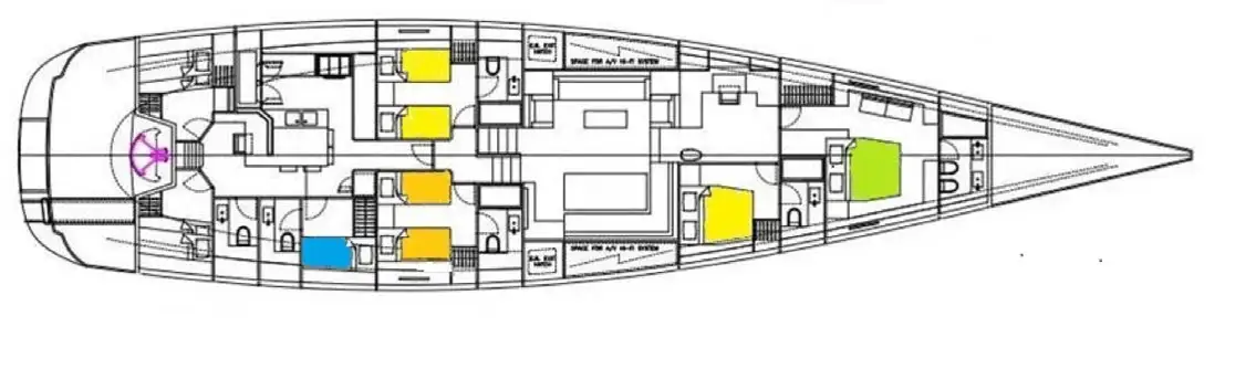 Accommodation for up to 8 guests comprises of a master cabin forward with a private office area, a VIP cabin forward on the starboard side and two twin cabins starboard and port side, aft. Aside from the intelligent design, tranquil atmosphere and comfortable furnishings, it's worth mentioning that there is no concern for head room on board this yacht.