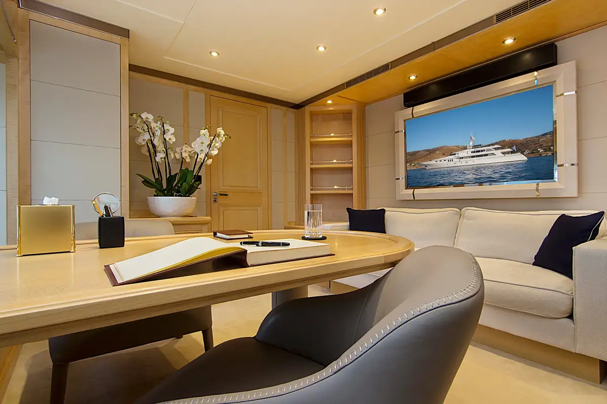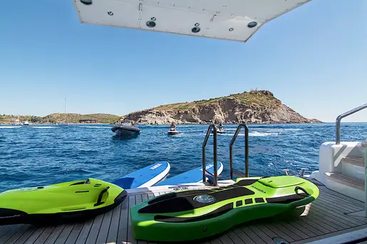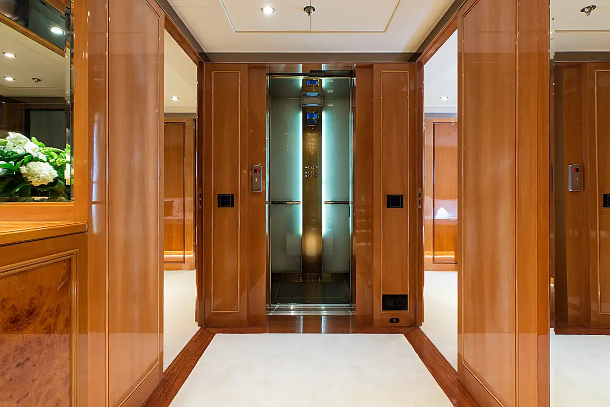 She has a spacious elevator servicing all decks. On upper deck the large all new sky lounge is fully equipped with a corner sofa area, Home Cinema feature, desk, bar and card table with direct access to the fully shaded dining area on aft deck. Upper deck forward a Portuguese bridge offers a totally private round seating area with shade upon request by manual umbrellas. She has zero speed stabilisers to reduce any rolling motion while at anchor.