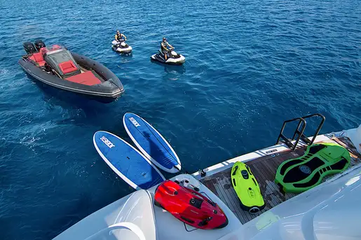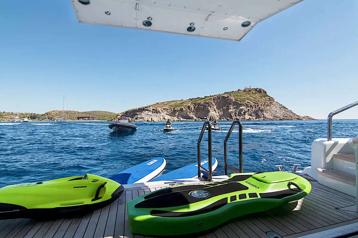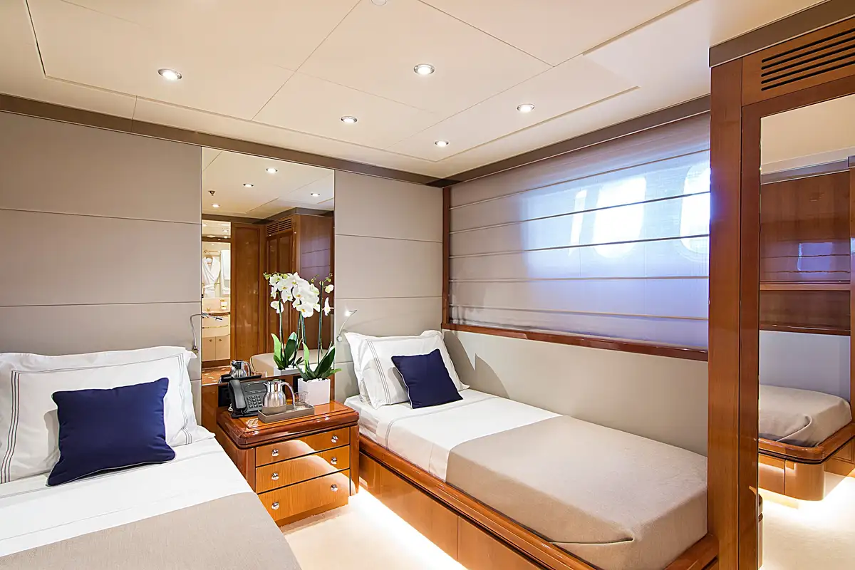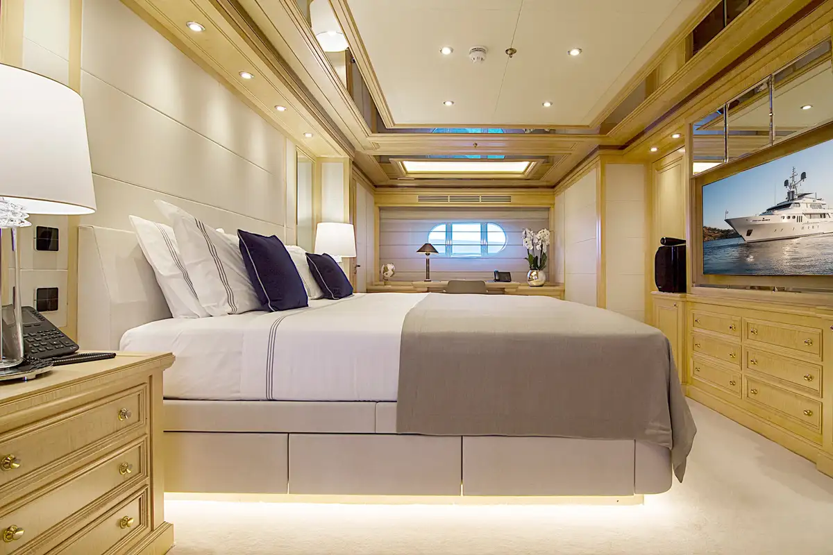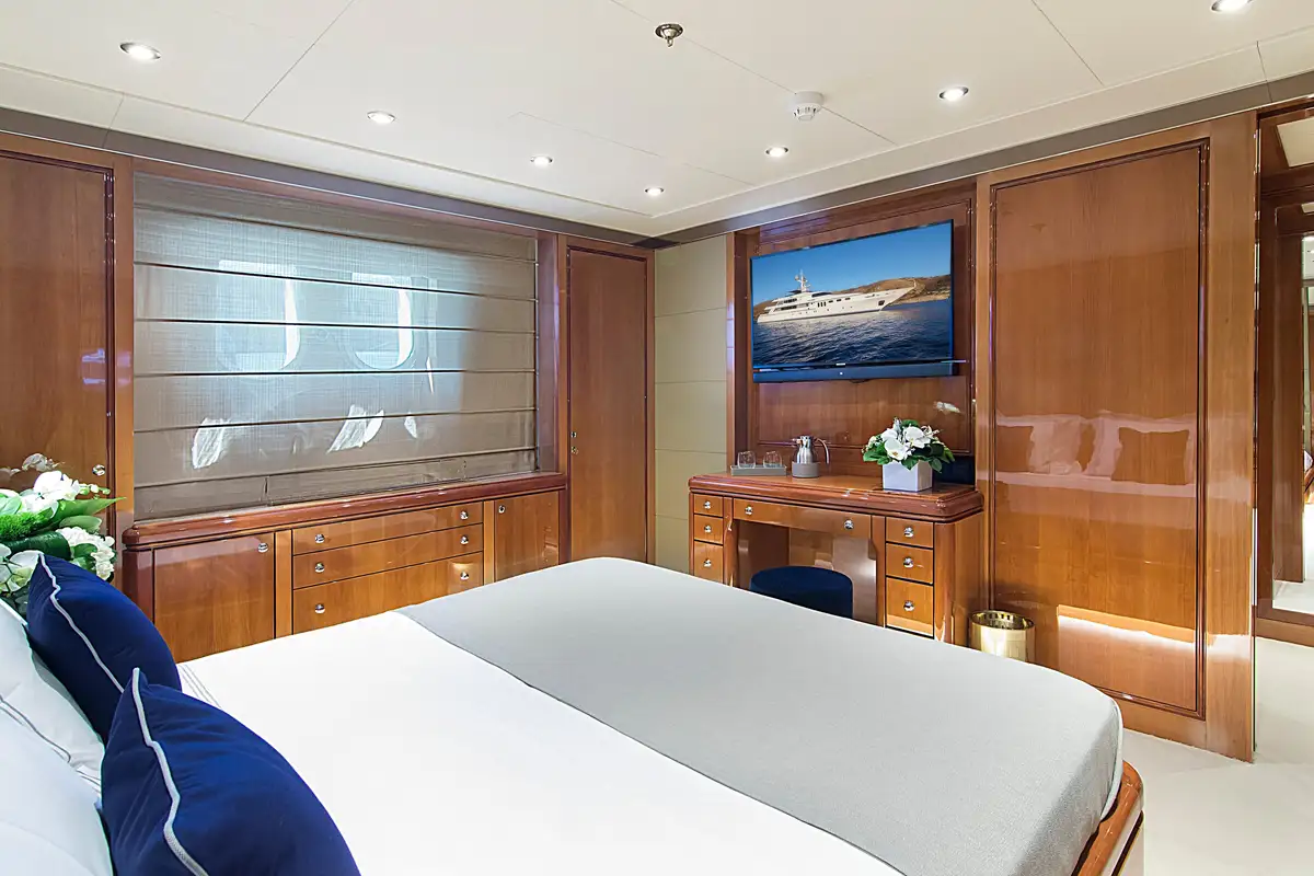 INVADER, sleeps 10 guests in 5 stylish staterooms, having the master cabin on main deck, with his and hers walk-in wardrobes, en suite marble bathroom with separate shower and tub and owner's office. She has 4 cabins located on lower deck, 2 double with wardrobes and en suite bathtubs and 2 twins with en suite shower rooms.