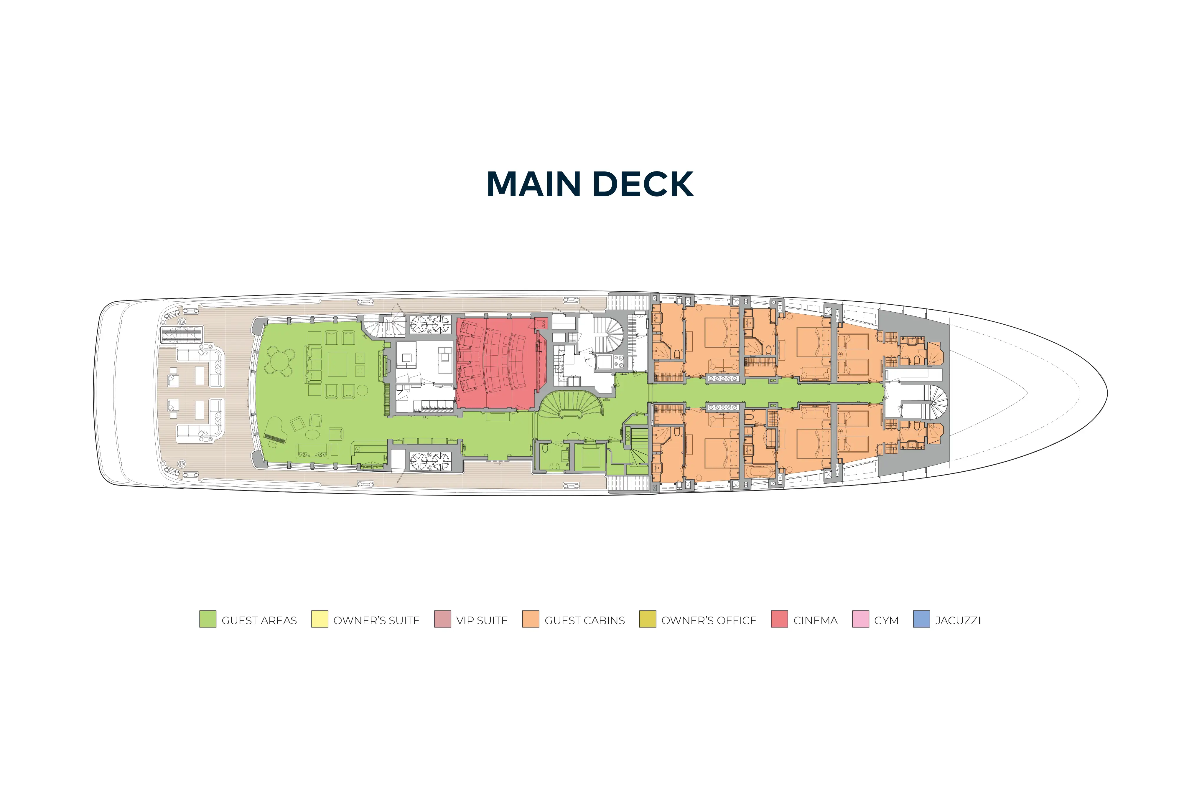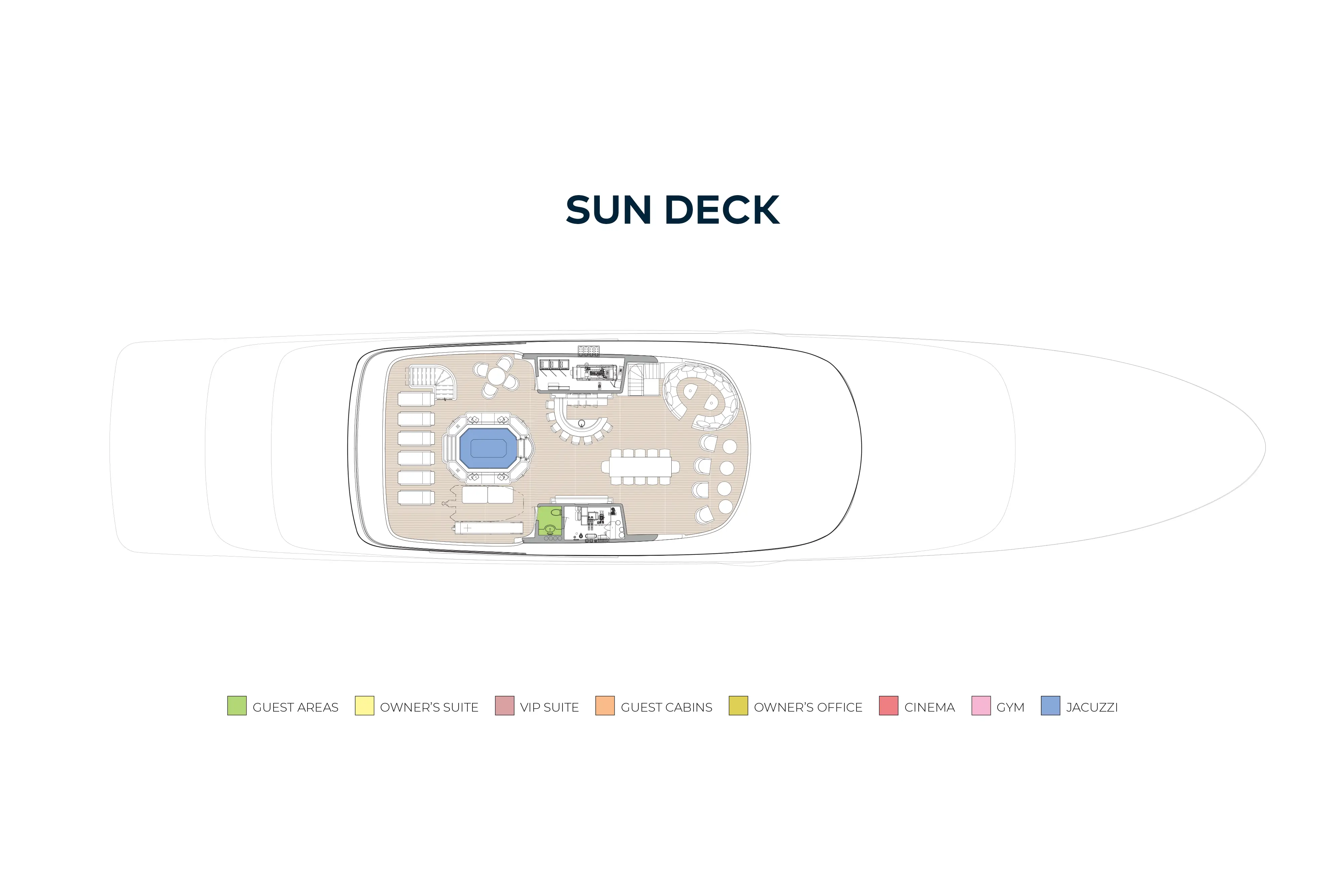 Expansive deck spaces host a variety of exotic dining options, from breakfast on the sun deck, to lunch by the dip pool and a five-star gourmet dinner for 22 guests at the impressive owner's deck dining table. Charter guests can make the most of the sun deck with its barbecue, jacuzzi and extensive sun loungers offering pure, uninterrupted relaxation.