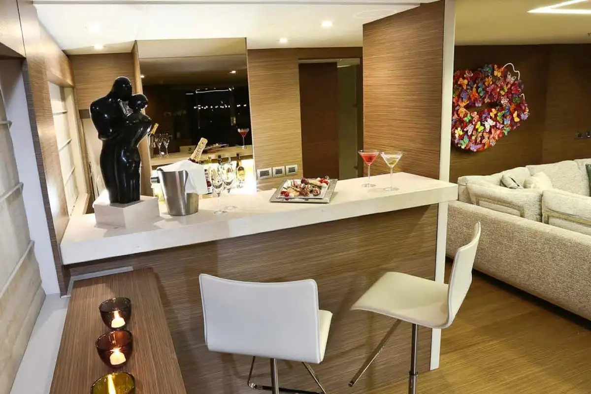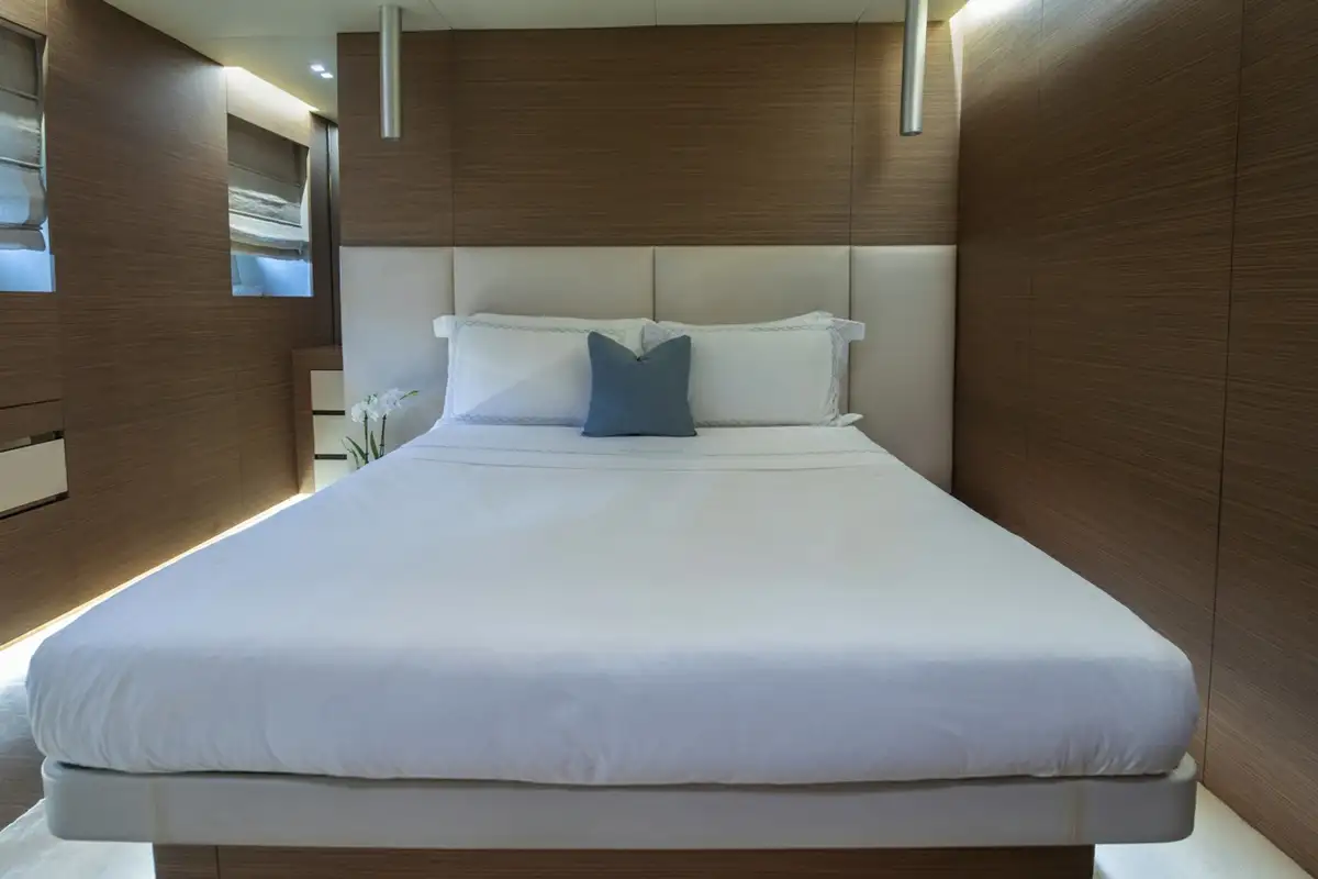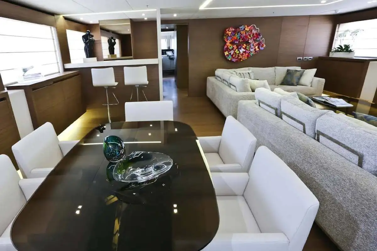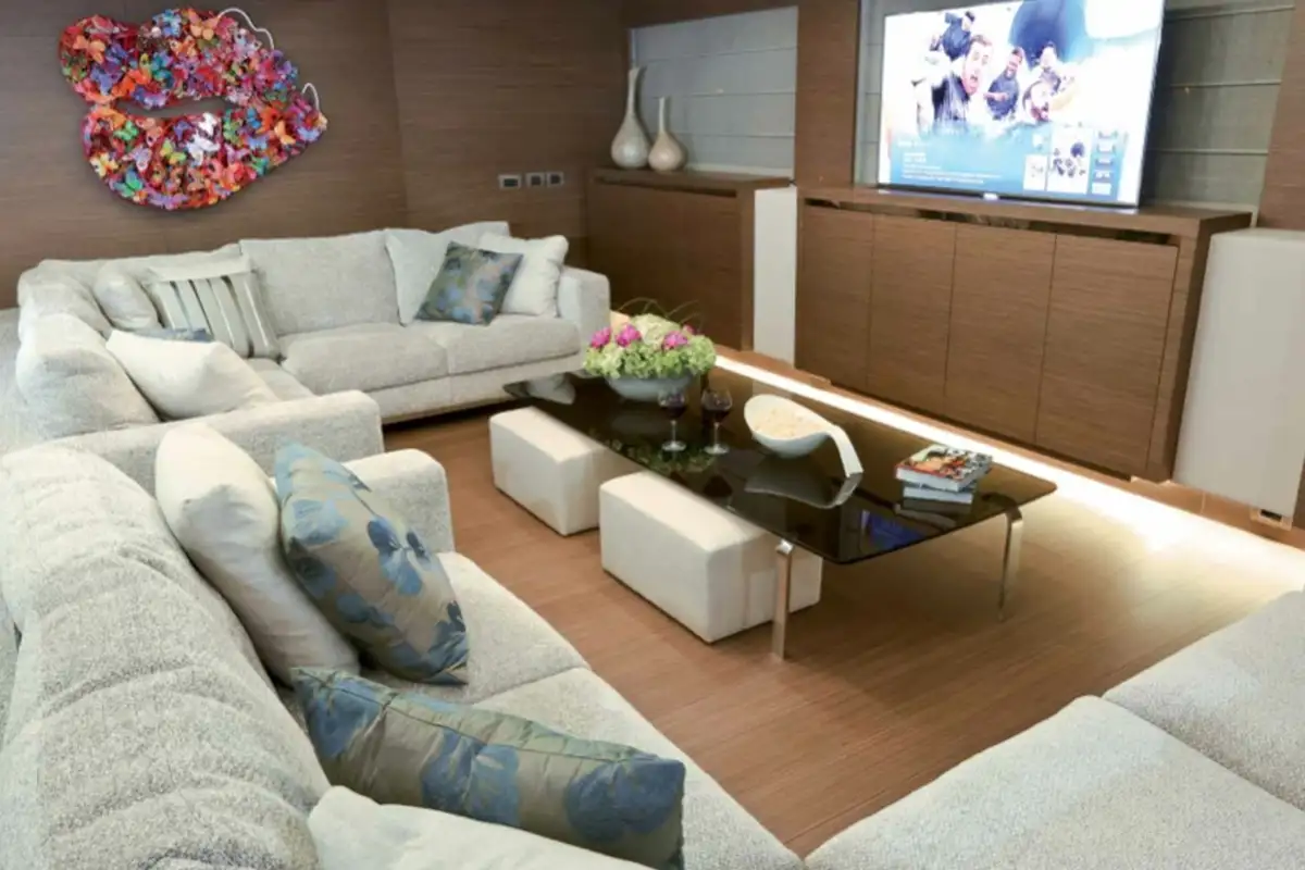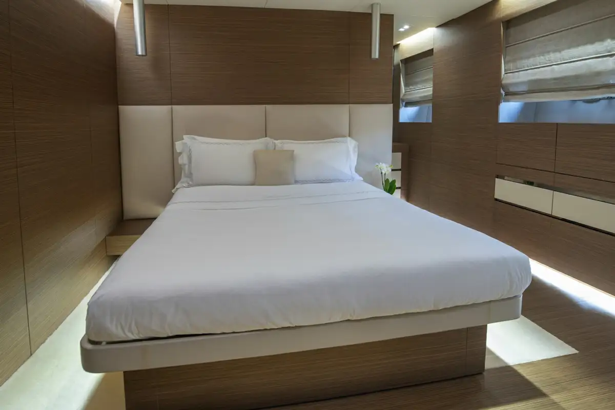 Clean and simple, her interior is bright and contemporary with gentle cream upholstery and light wood carpentry and flooring. Her main lounge has an open plan layout stretching back to a rectangular dining table separated from the rest of the room by a TV cabinet partition. For a more casual setting, your guests can retreat to the upper deck lounge to enjoy a cocktail at the bar or sit back on the large corner sofas and select a movie from the yacht’s extensive entertainment library.