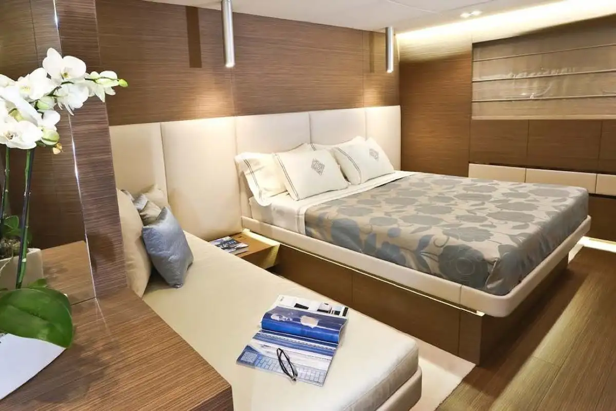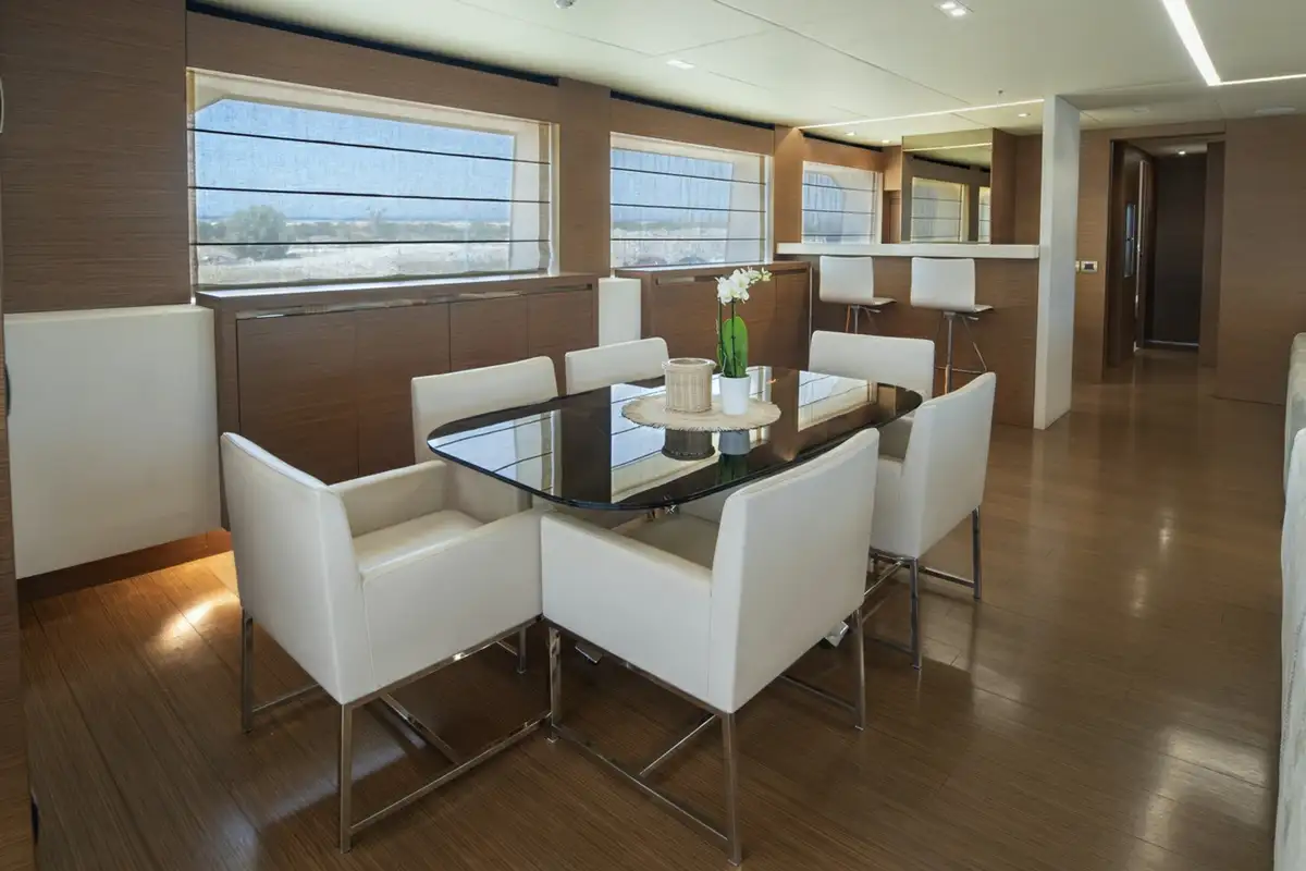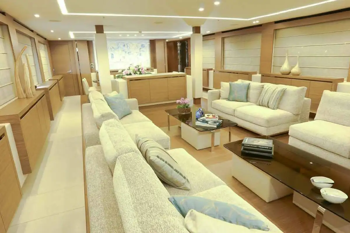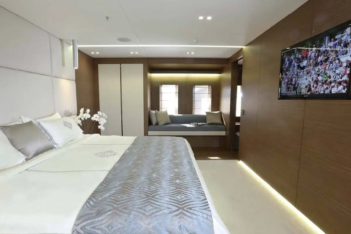 Clean and simple, her interior is bright and contemporary with gentle cream upholstery and light wood carpentry and flooring. Her main lounge has an open plan layout stretching back to a rectangular dining table separated from the rest of the room by a TV cabinet partition. For a more casual setting, your guests can retreat to the upper deck lounge to enjoy a cocktail at the bar or sit back on the large corner sofas and select a movie from the yacht’s extensive entertainment library.