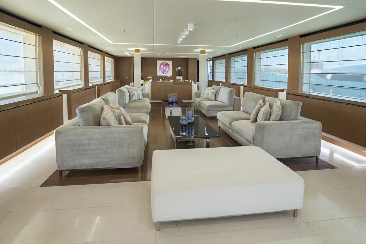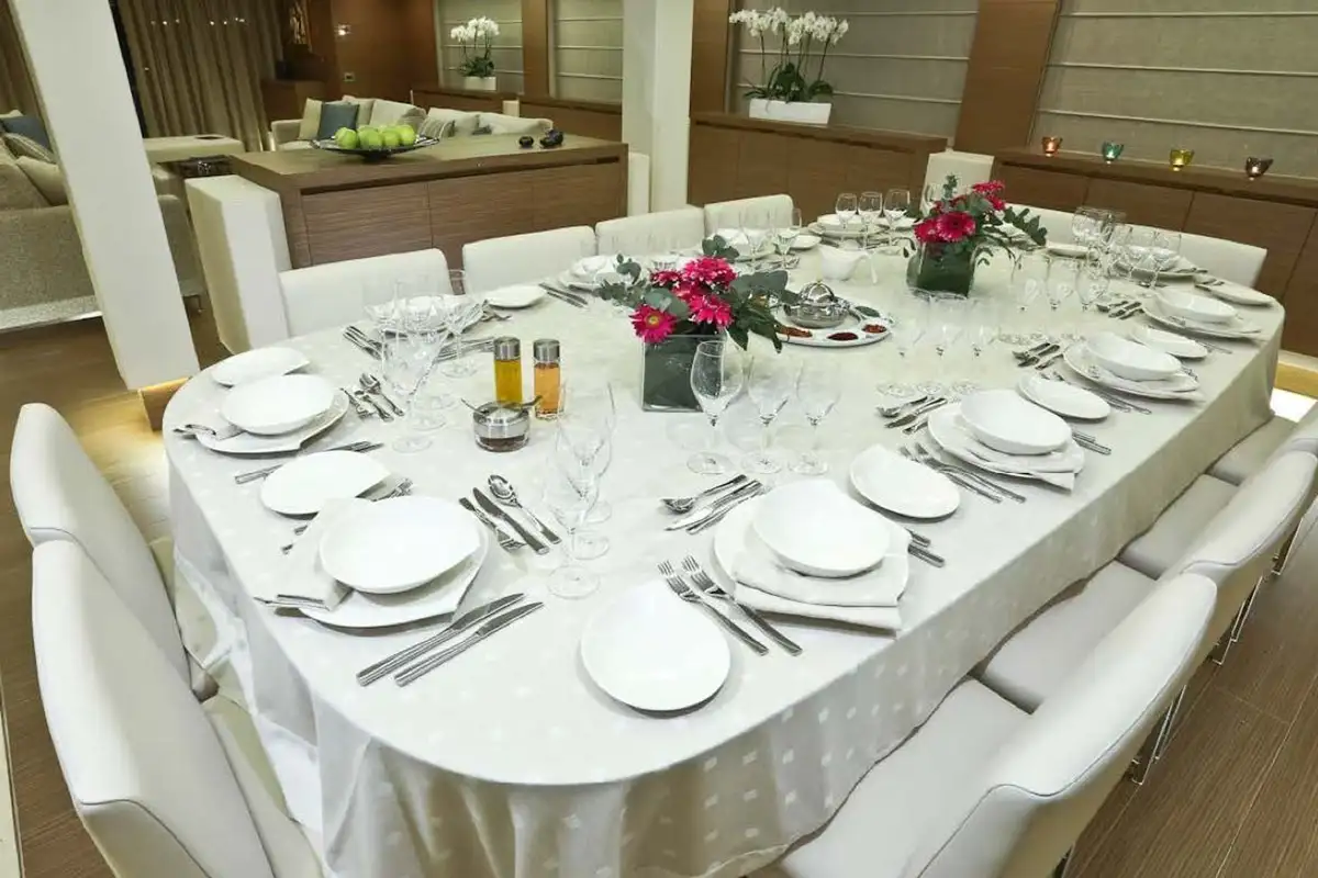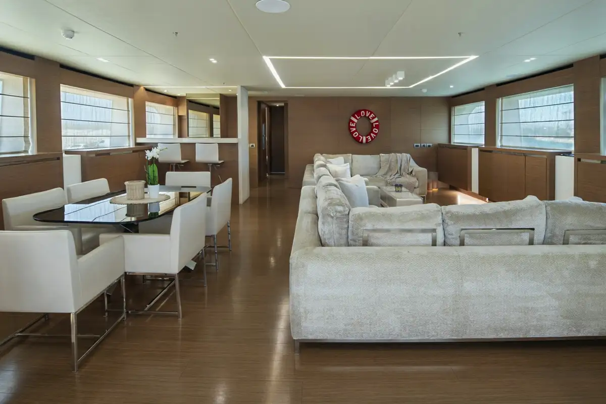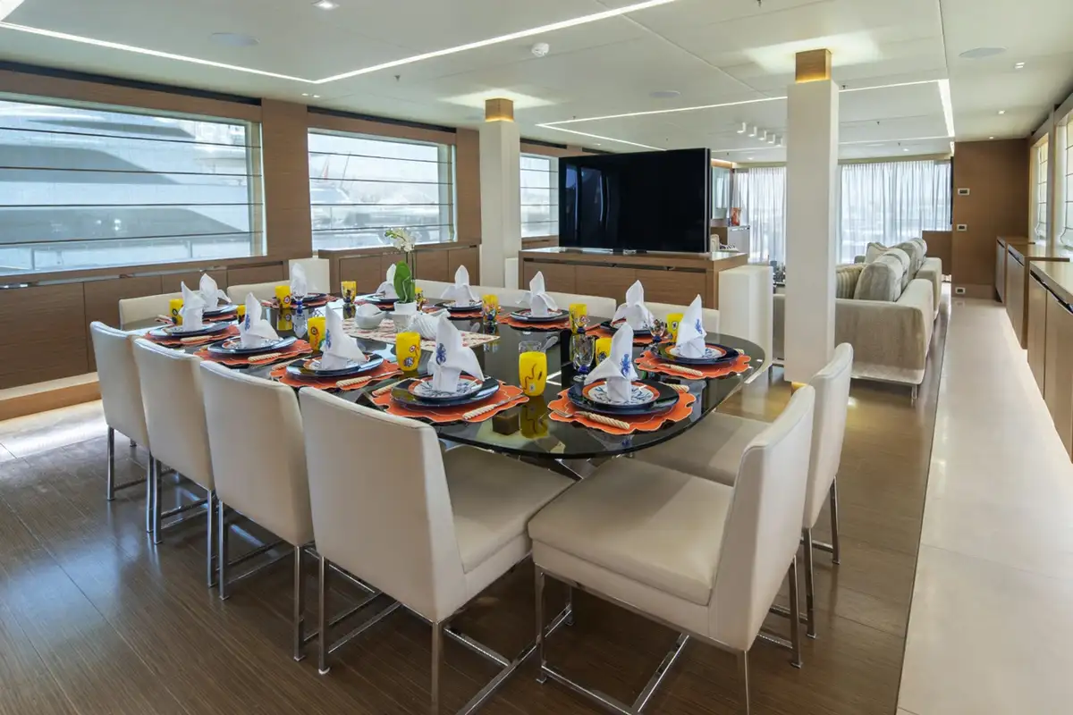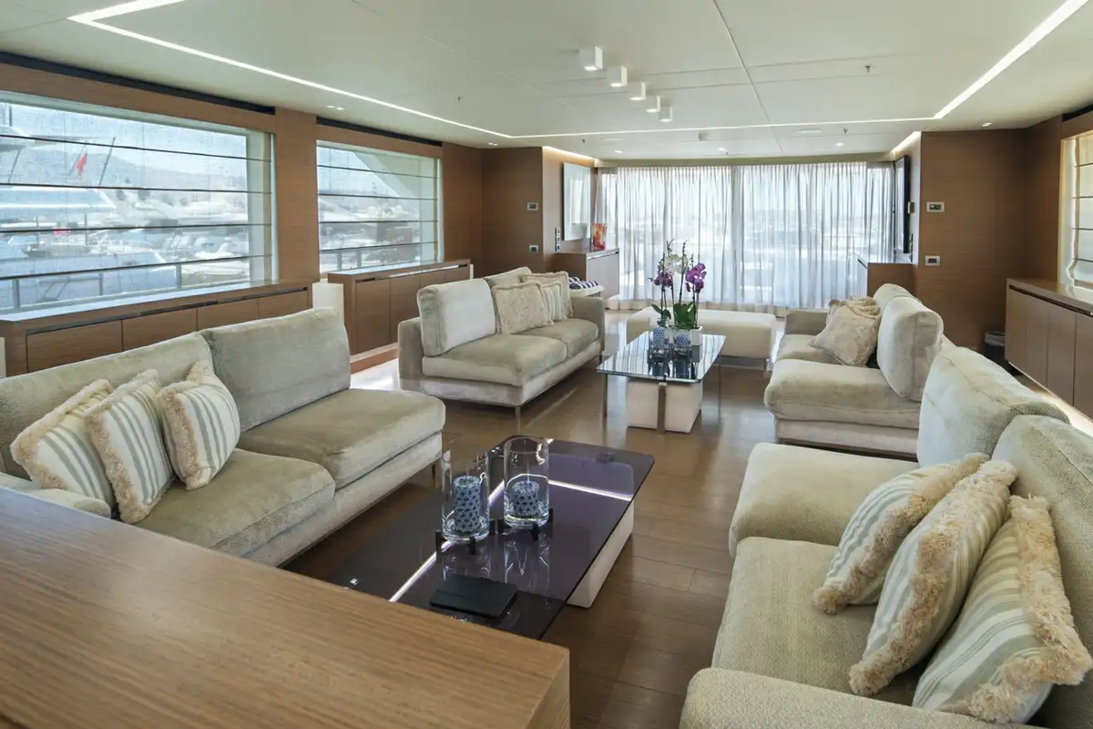 Clean and simple, her interior is bright and contemporary with gentle cream upholstery and light wood carpentry and flooring. Her main lounge has an open plan layout stretching back to a rectangular dining table separated from the rest of the room by a TV cabinet partition. For a more casual setting, your guests can retreat to the upper deck lounge to enjoy a cocktail at the bar or sit back on the large corner sofas and select a movie from the yacht’s extensive entertainment library.