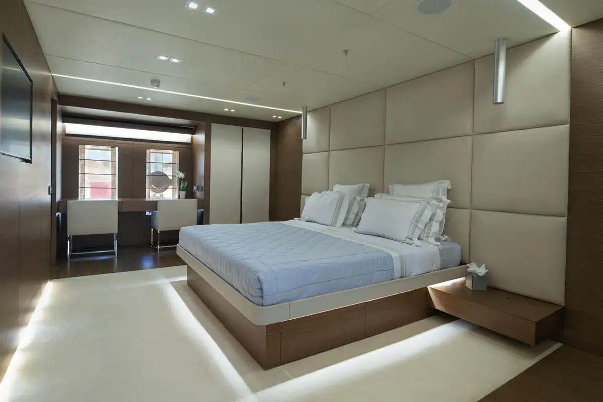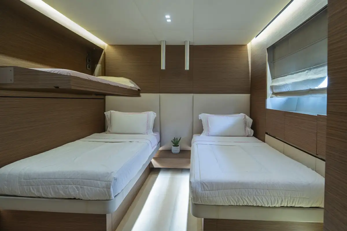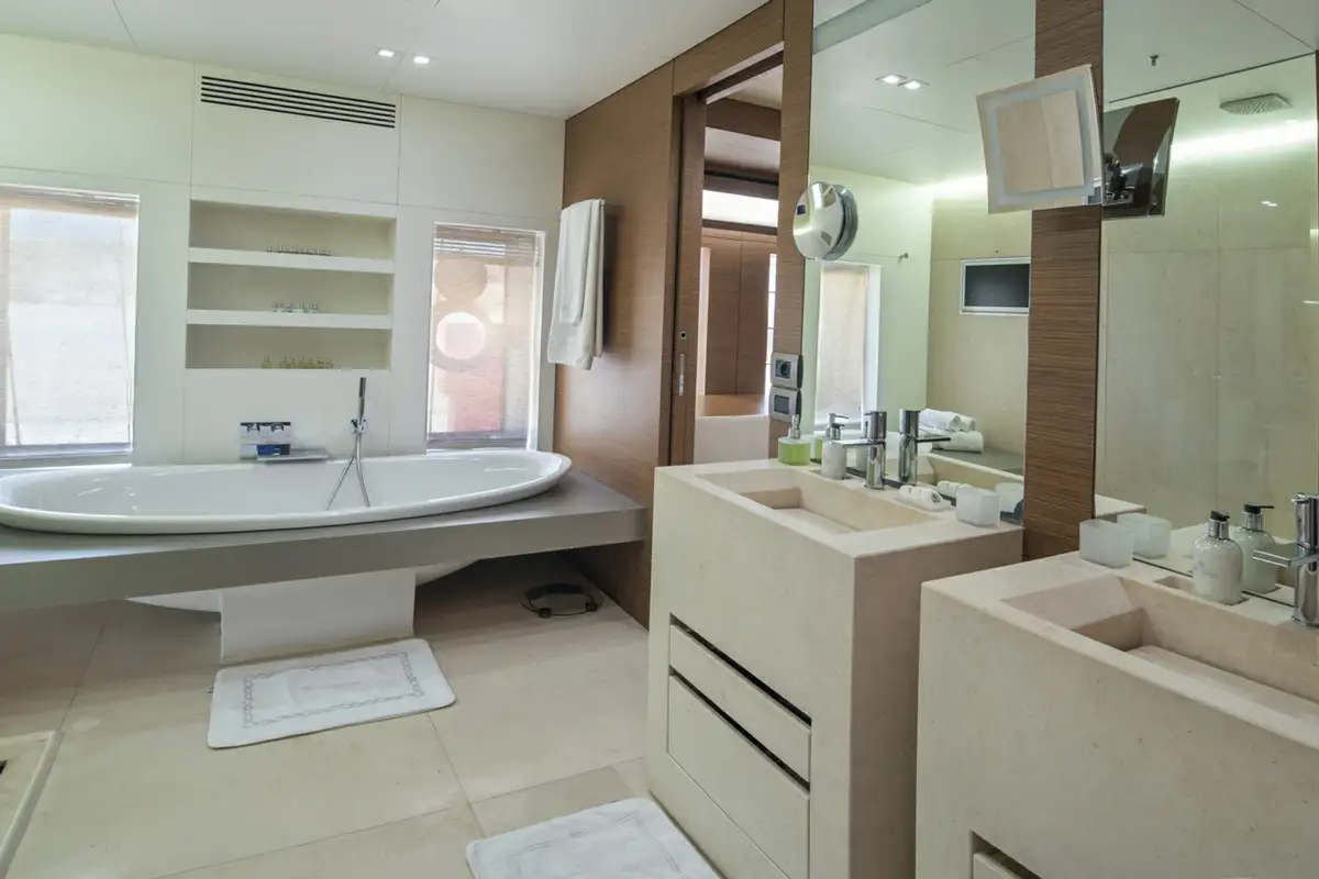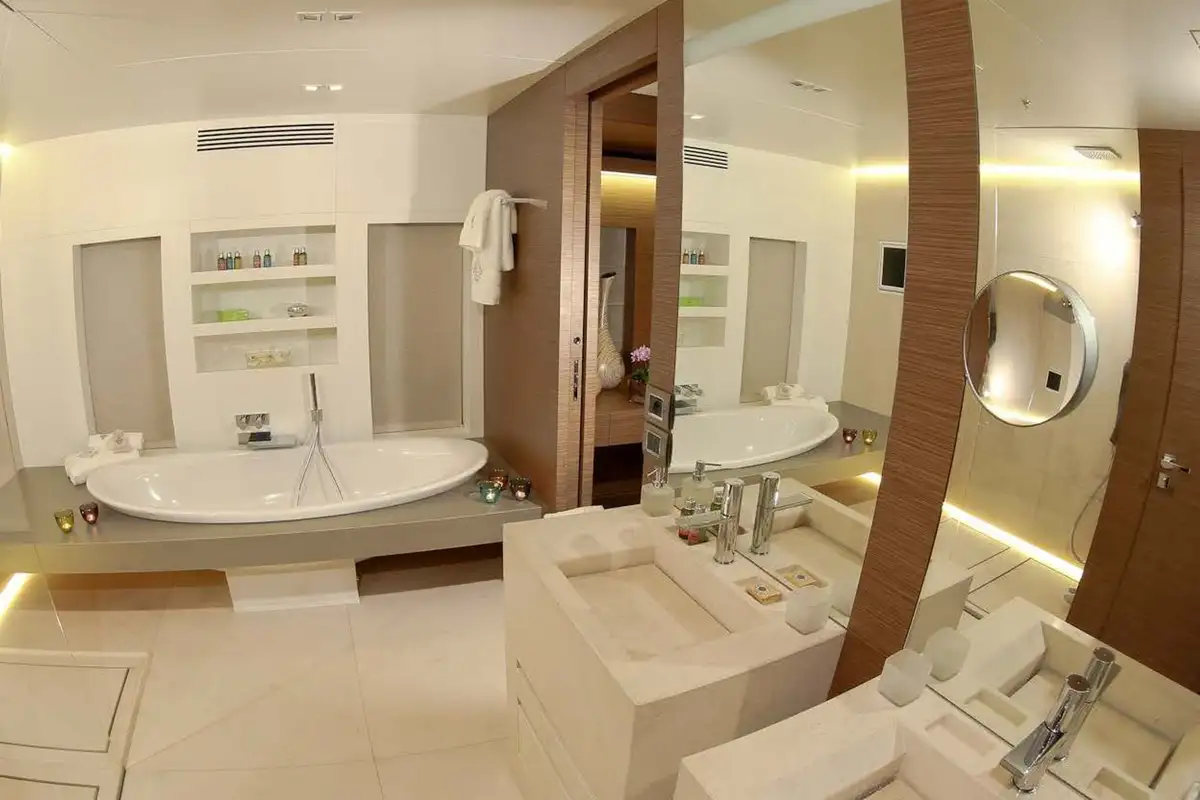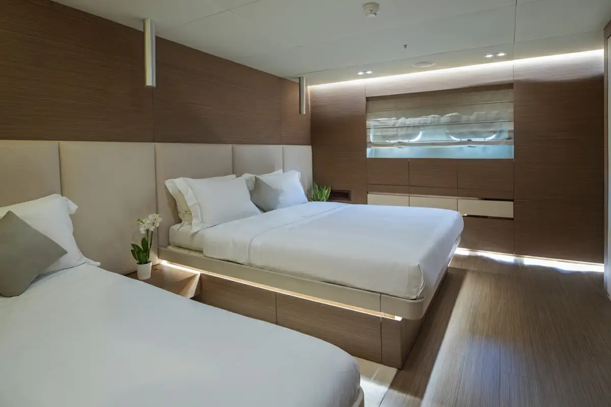Venturing back to your cabin, the same clean colour palette of the main lounge is followed through to the guest cabins. Just beyond the gym room with treadmill and free weights is the master stretching across the full beam of the yacht with dressing room and adjoining private office. A further three VIP cabins and two twin guest cabins, each with a children’s pullman bunk, are located on the lower deck. Perfect for any family members with a baby, the VIP cabin’s sofa can be converted to a small single bed if required.
