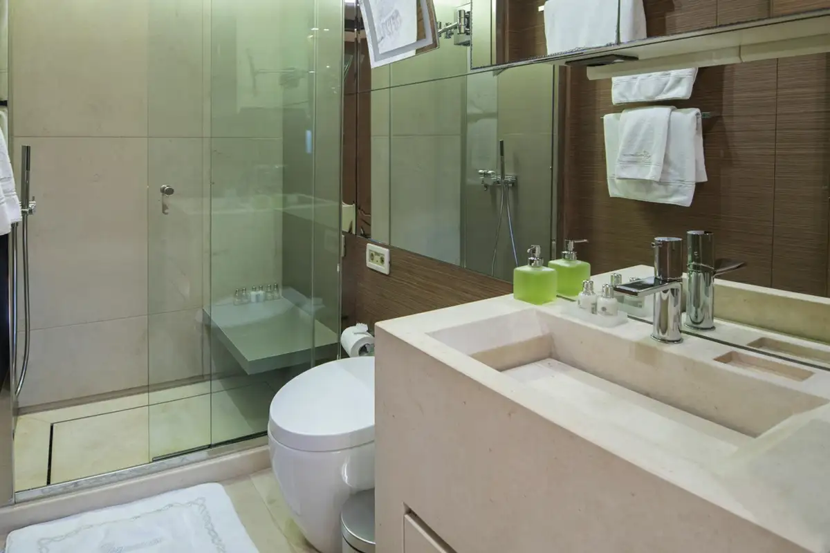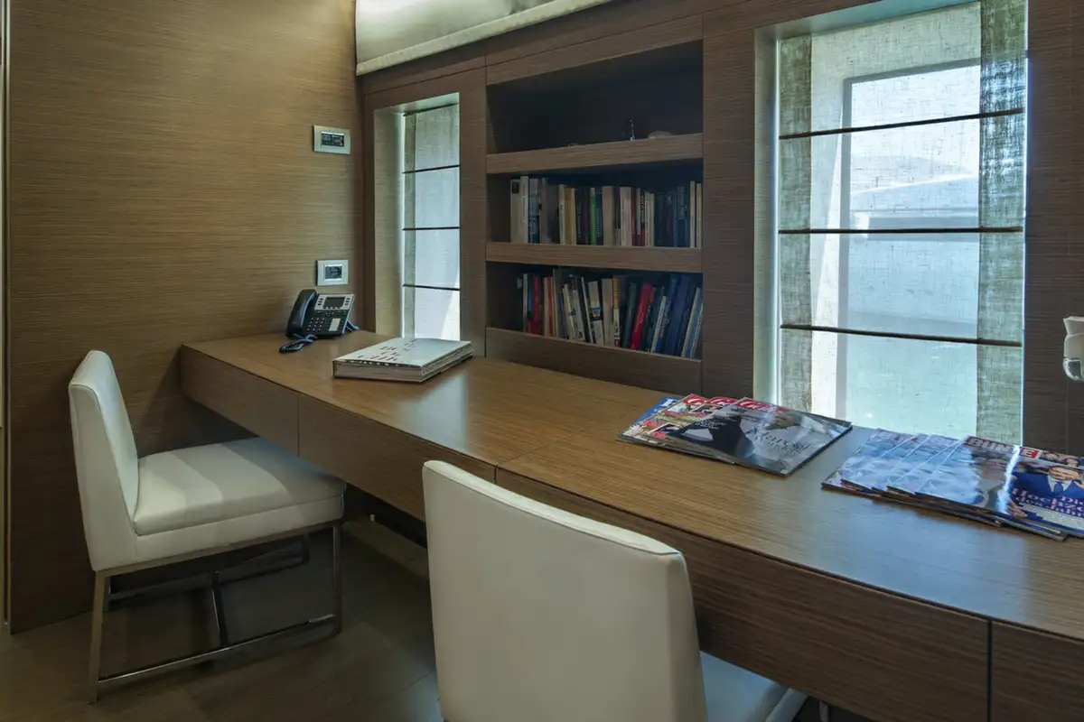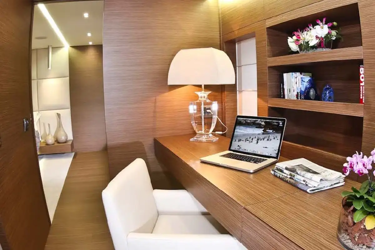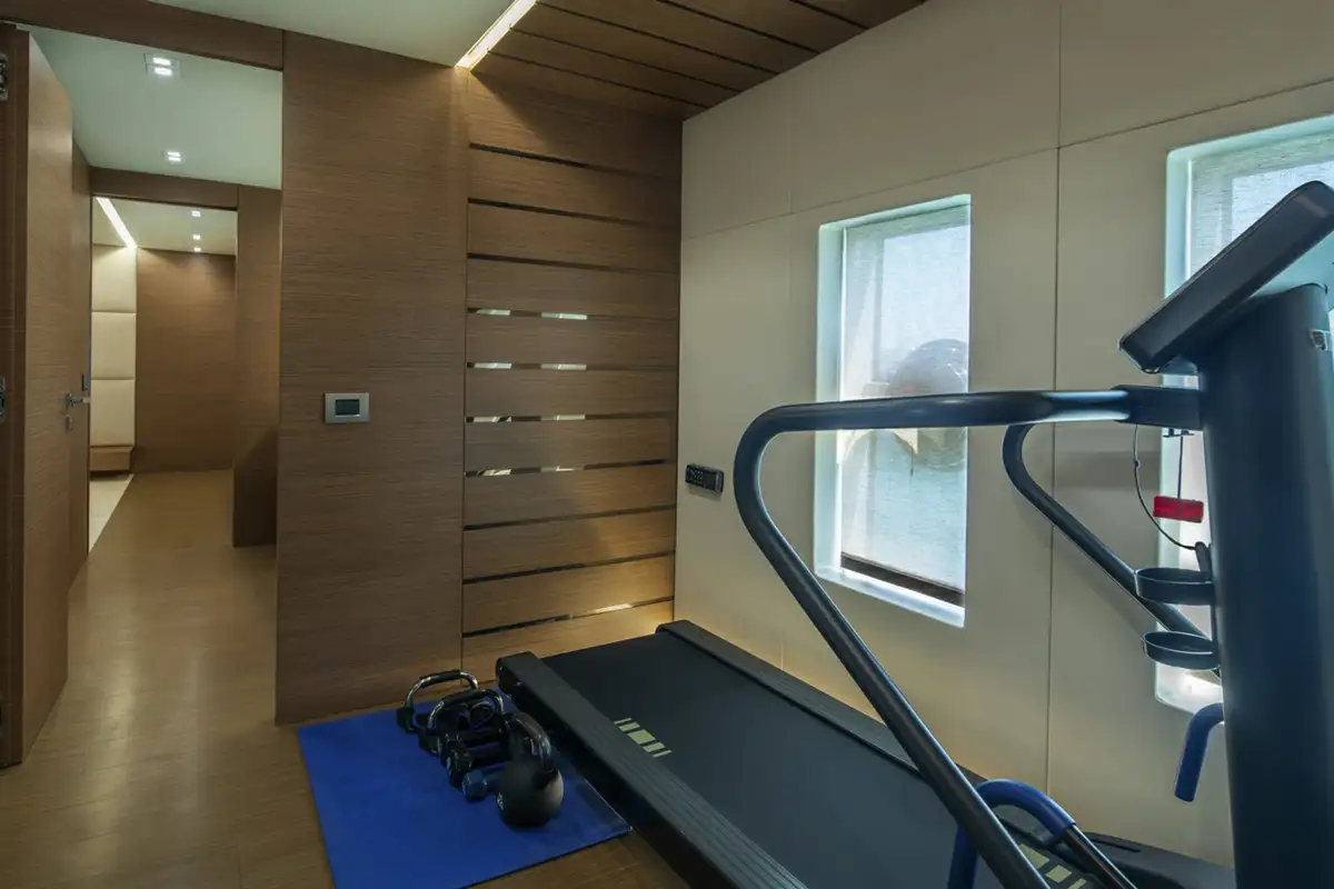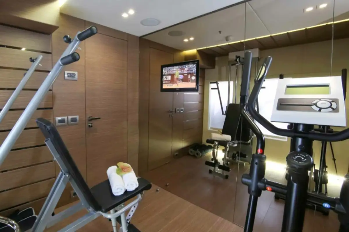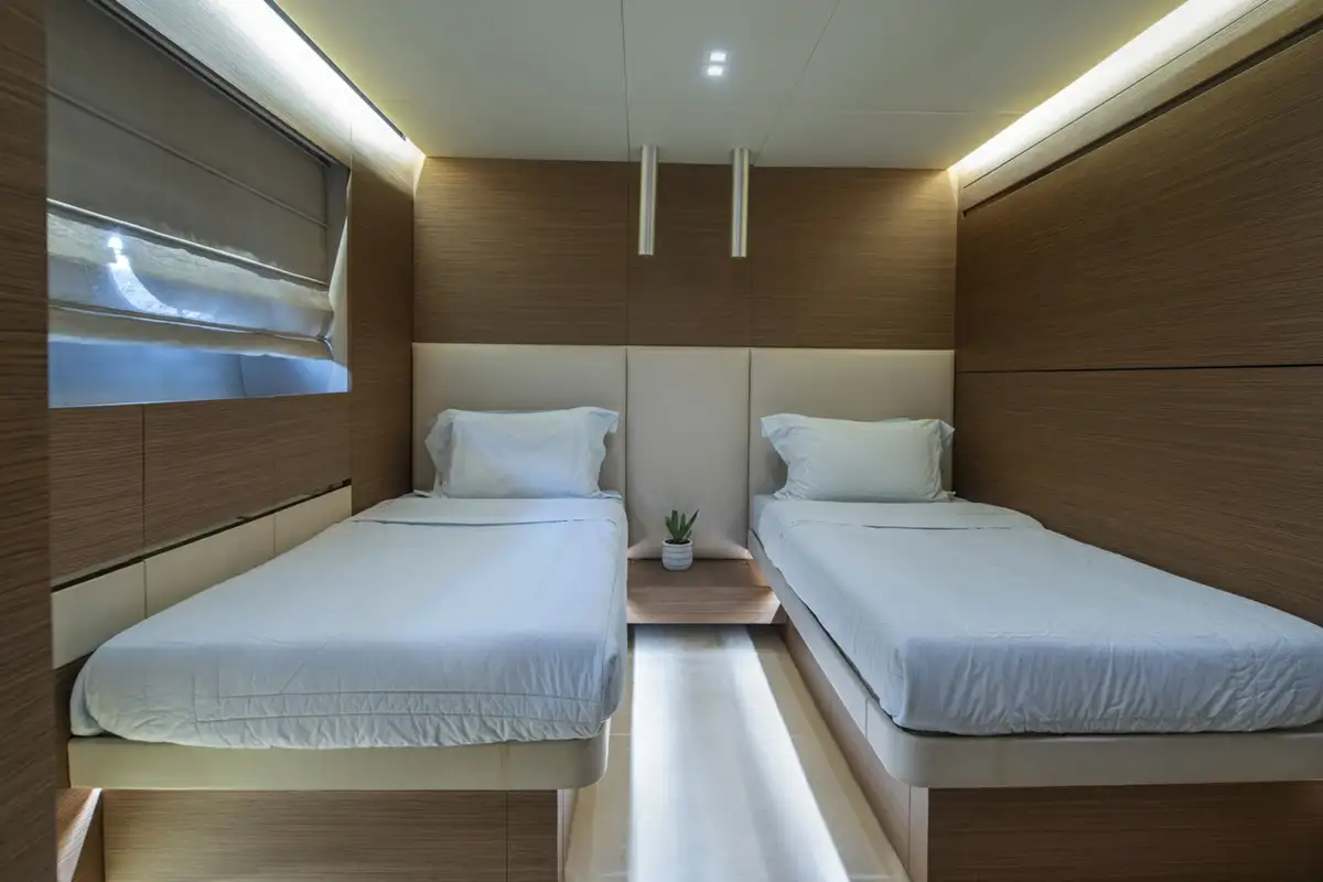 Venturing back to your cabin, the same clean colour palette of the main lounge is followed through to the guest cabins. Just beyond the gym room with treadmill and free weights is the master stretching across the full beam of the yacht with dressing room and adjoining private office. A further three VIP cabins and two twin guest cabins, each with a children’s pullman bunk, are located on the lower deck. Perfect for any family members with a baby, the VIP cabin’s sofa can be converted to a small single bed if required.