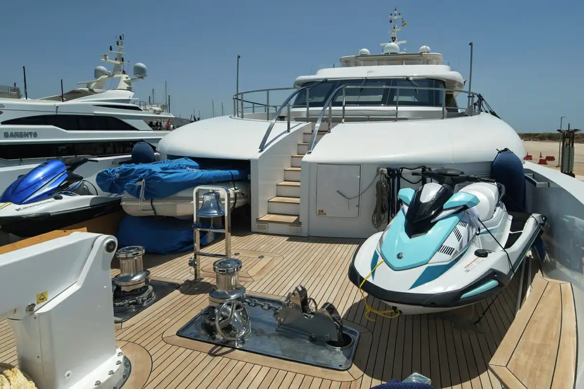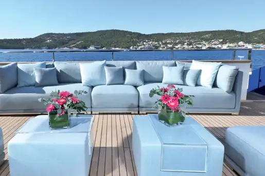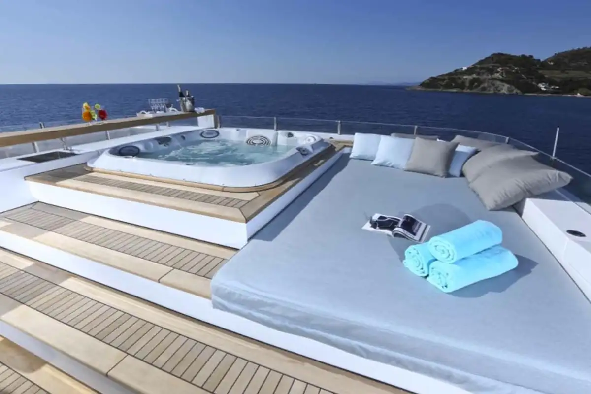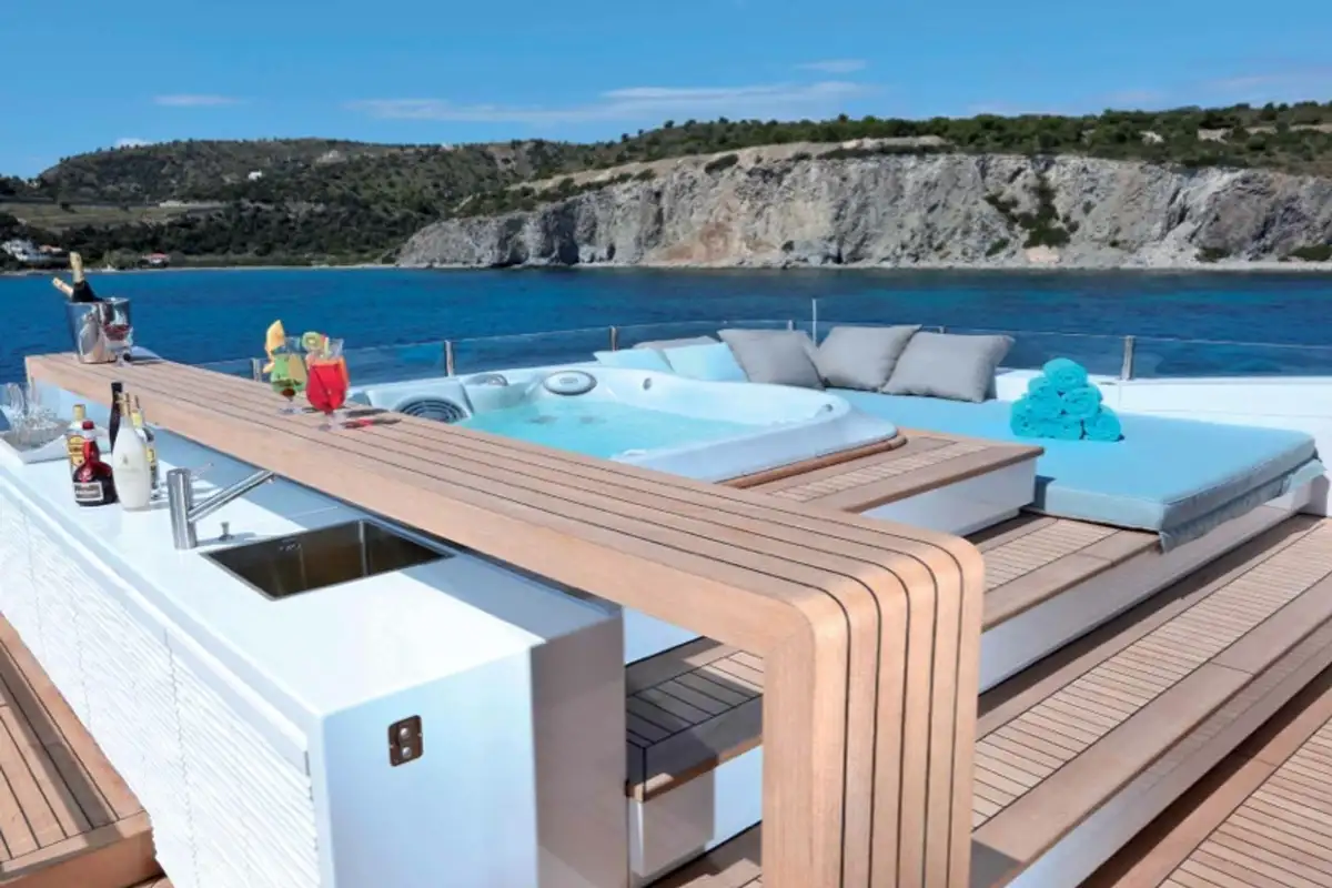 Daytime is all about the outside areas. As you cruise along at 20 knots, your guests can unwind on the aft deck where there are large comfortable sofas, enjoy a BBQ lunch on either the upper deck or the sun deck (both have large dining tables with good sun shade) and spend the rest of the afternoon lazing on the raised sunpad platform alongside the jacuzzi and bar. The watertoys are essential for exploring Greece’s crystal blue waters and IPANEMAS’s pair of three-person jet skis are the perfect choice for this.