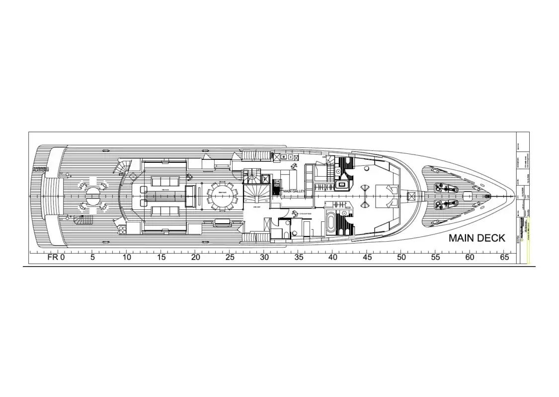 On the main deck, a staircase from the swim platform leads to the cockpit, where free-standing furniture sets the tone for relaxation. The main deck lounge has an L-shaped sofa to port accompanied by armchairs to starboard the space exudes elegance with its light furnishings and wooden countertops. The formal dining area is ahead and provides a perfect setting for exquisite meals.