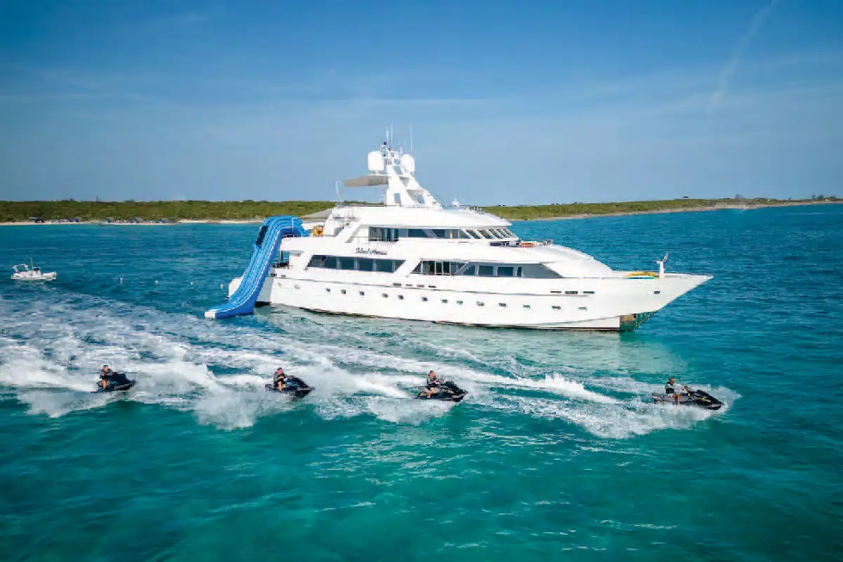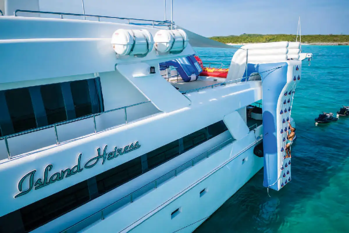 She carries a 20ft RIB for waterskiing, wakeboarding, inflatable tows and beach landings – how about a leisurely Champagne brunch on the white sand beach of an unspoiled cay? Her 34ft centre console powerboat is on hand for longer-range excursions, fishing trips and visits to remote restaurants and bars with private jetties. Back on board, you can tackle the climbing wall and then plunge back into the sea for a cooling dip via the giant water slide.