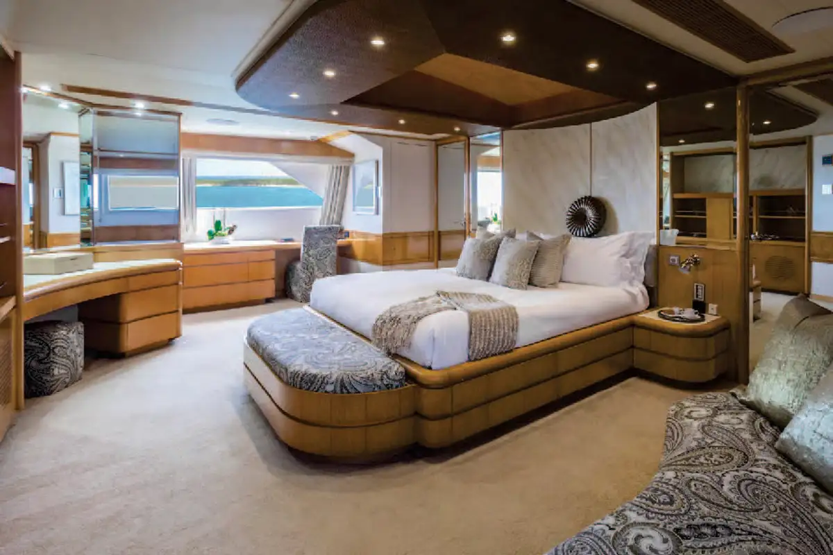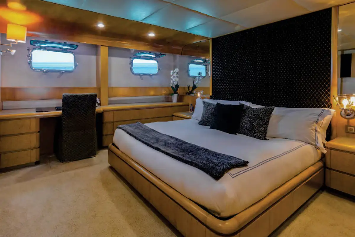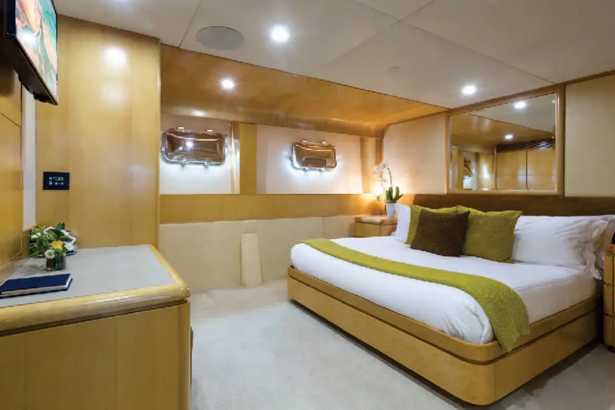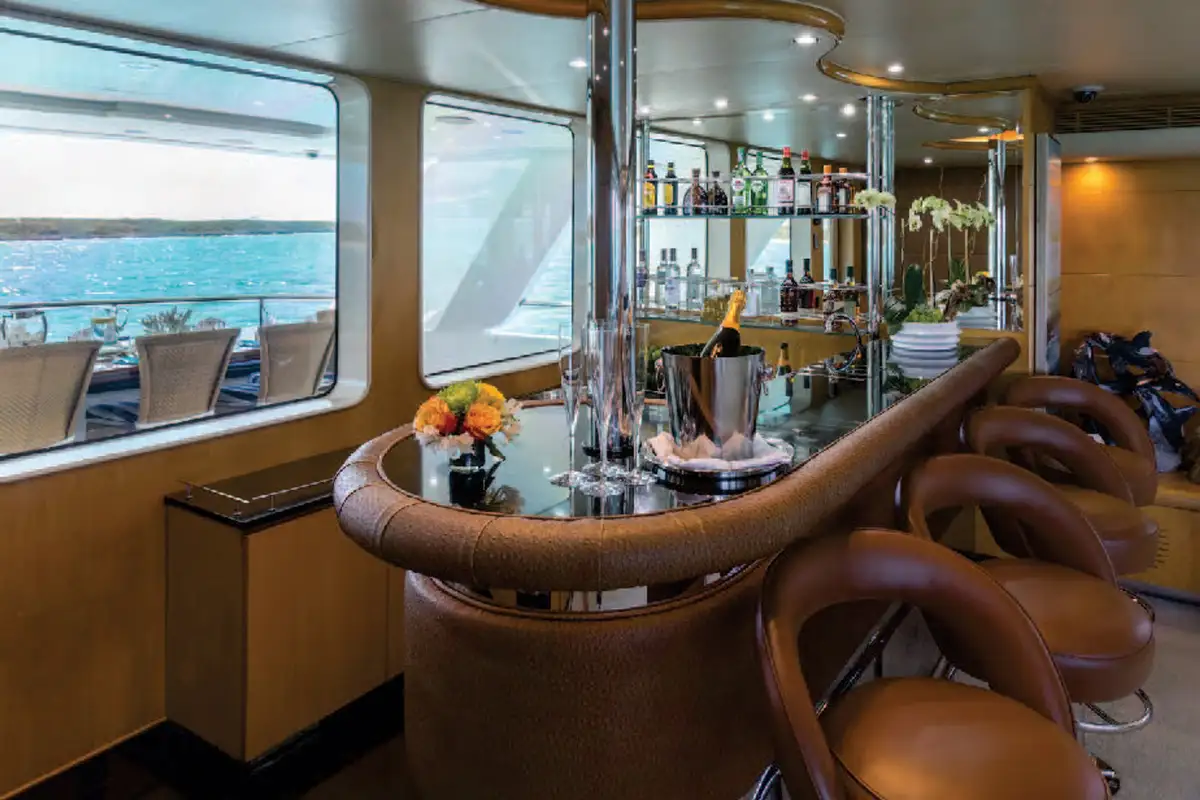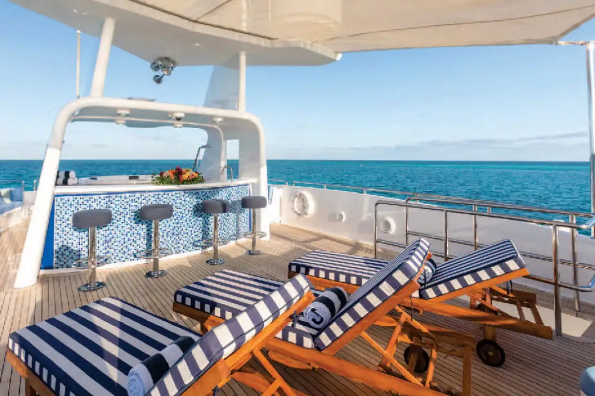 When you’re anchored in a coral lagoon, her sundeck is a wonderful place to be. There’s a jacuzzi pool, plenty of seating, a cocktail bar, classic sun loungers and a large day bed, all with a commanding view out over the sea.