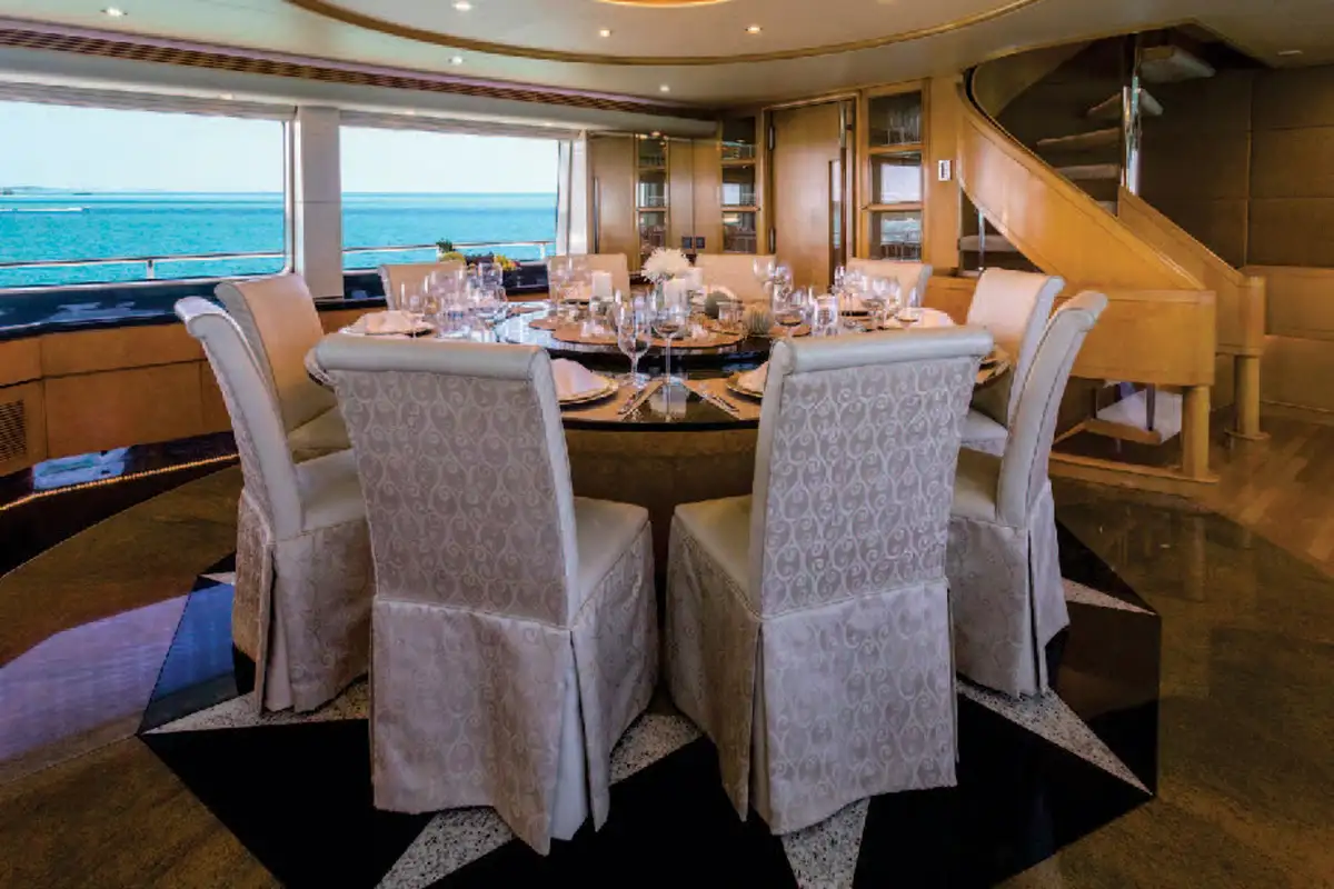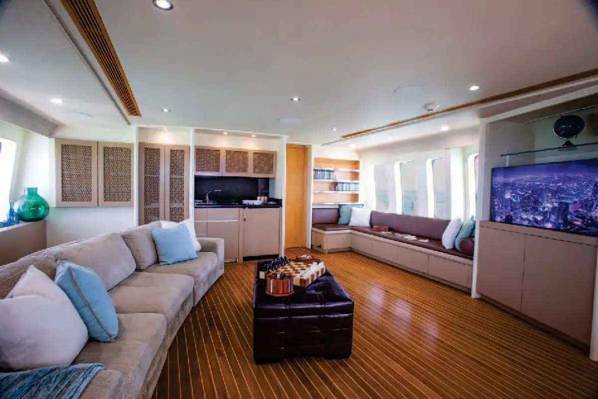 Her two spacious lounges offer a choice of tranquil retreats when you want a break from sun, sand and sea. The main deck saloon is elegant and formal with a bar, a dining table and a large, sociable lounge. The upper deck saloon is a cosy living room where some guests can curl up with a book while others watch a movie, game or match on the big TV.