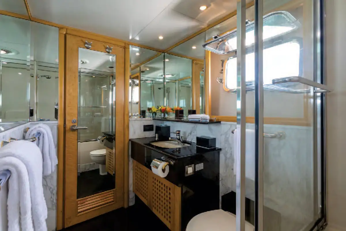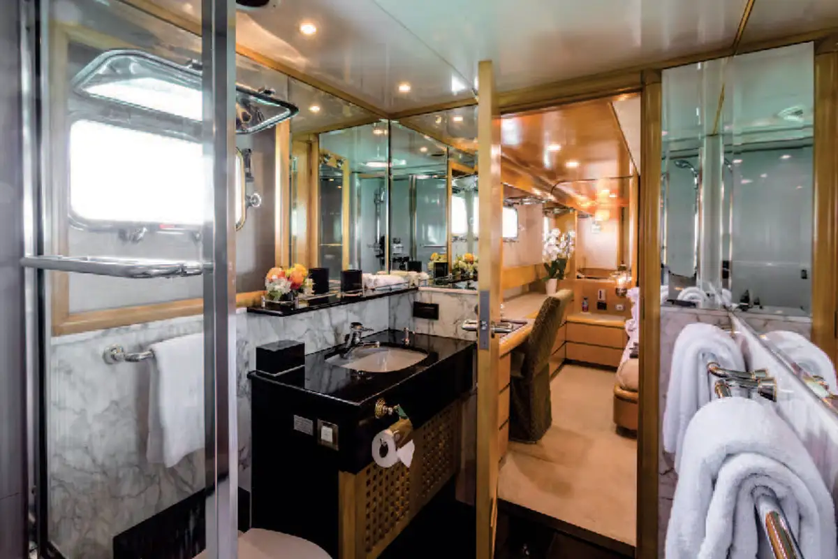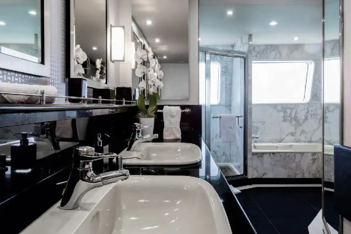 The master suite, up forward on the main deck, is an opulent full-beam cabin with a comfy sofa, a king size bed and a large en suite bathroom with a bathtub, a separate shower and a black-and-white marble finish. It’s a great place to end a perfect day.