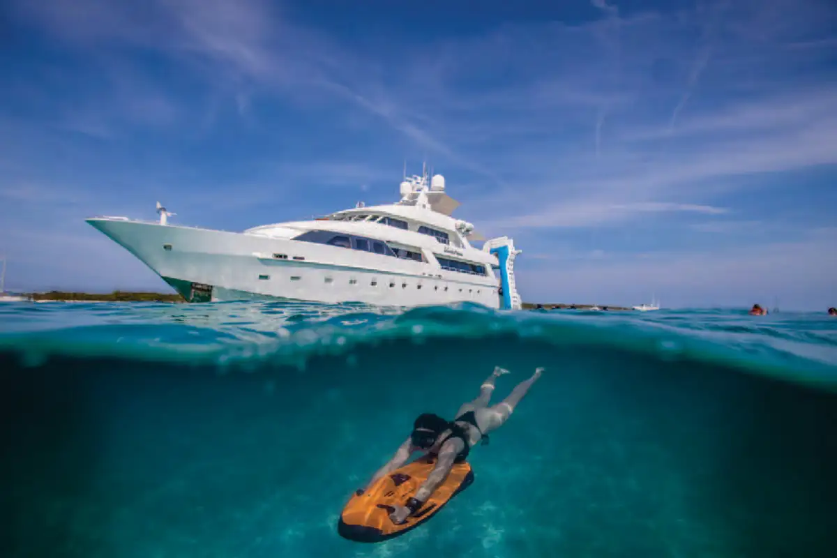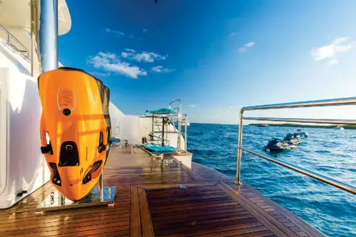 There’s a good variety of watersports to choose from when the anchor goes down. Explore sheltered waters at a gentle pace by kayak or paddleboard. Whizz around on a Waverunner or fly above the waves on an E-foil board. Don a mask and snorkel for a SeaBob excursion or arrange a rendezvous scuba dive with an expert local guide.
