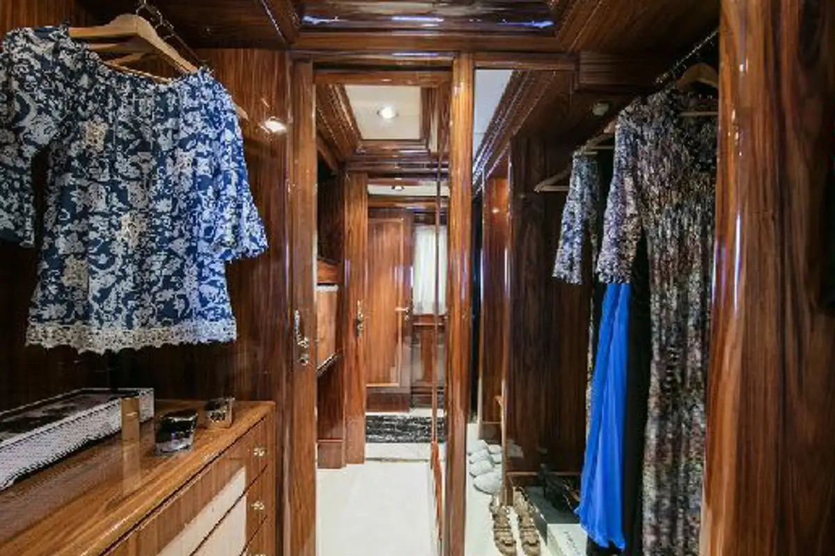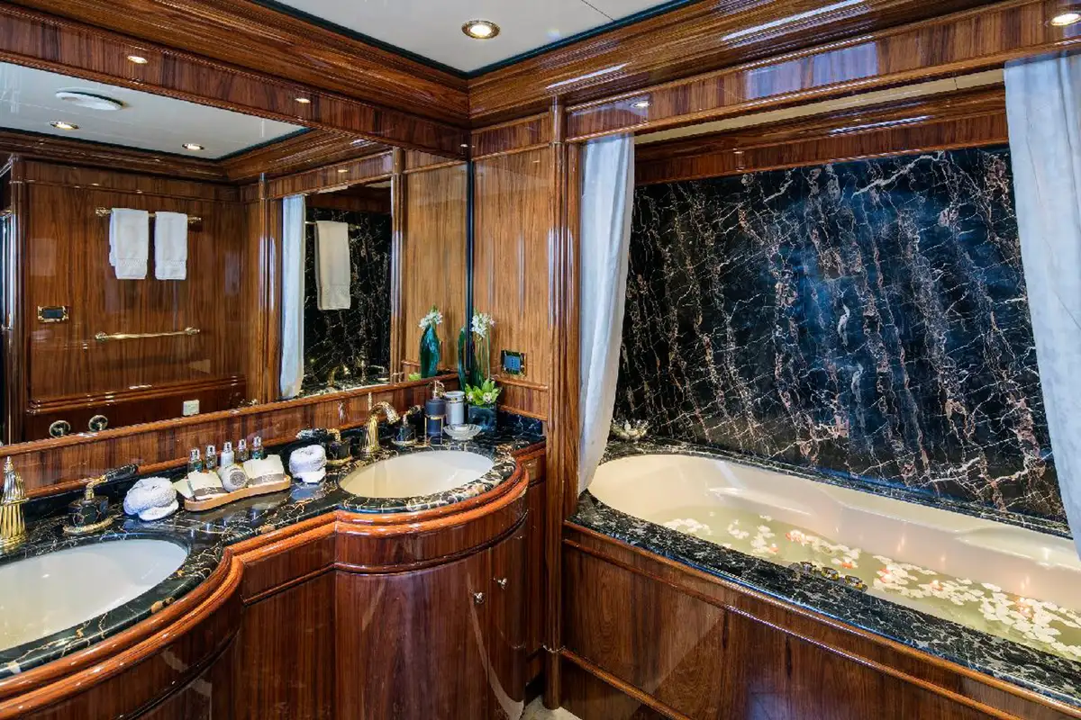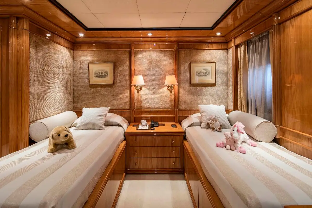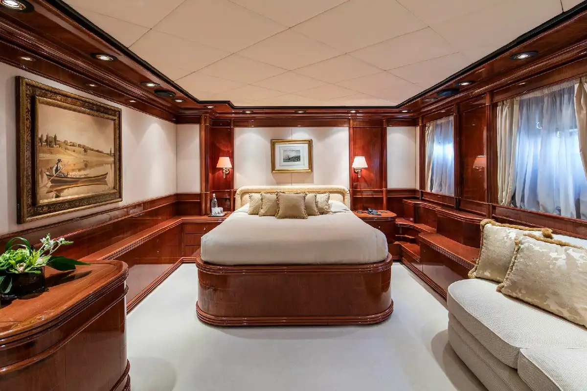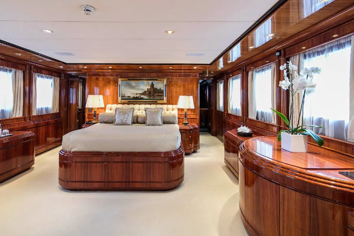 This magnificent vessel accommodates up to 12 guests in six sumptuous cabins, each thoughtfully designed with en suite facilities. These include a secluded master suite offering the utmost in privacy, with double doors heading straight to the upper deck aft deck. A remarkable VIP suite featuring its own office area on the main deck. Adding to the yacht's adaptability, two twin staterooms can be seamlessly converted into a spacious suite through a sliding door, offering flexibility without compromising on comfort.
