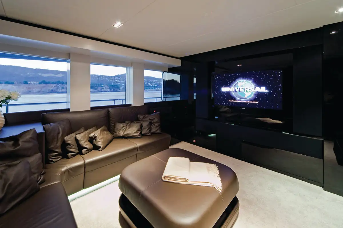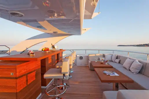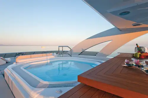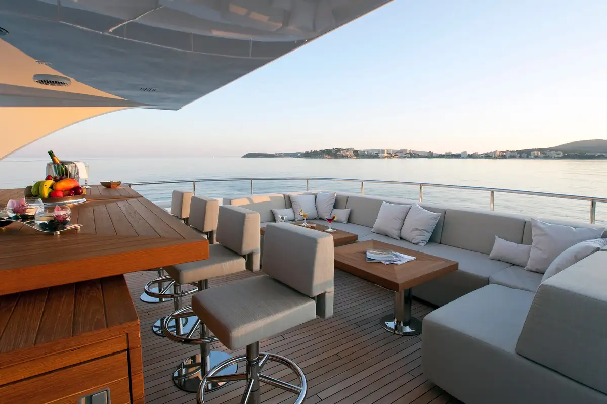 As the sun sets over the ocean and the sea breeze falters, it’s time to gather together for a memorable meal in the sophisticated ambience of the upper aft deck. And as the sky darkens, you might decide to reconfigure the sundeck as an outdoor cinema and enjoy a moonlit movie. What better way to end a perfect day?
