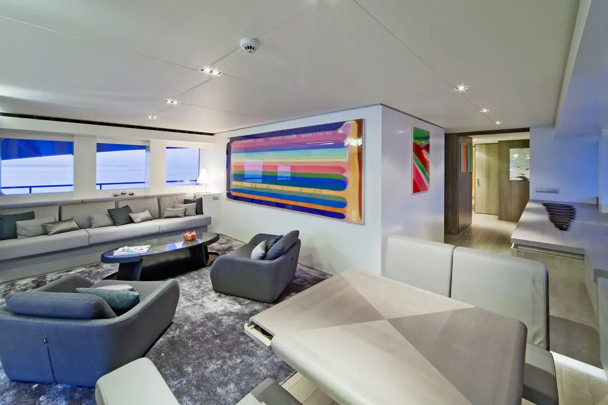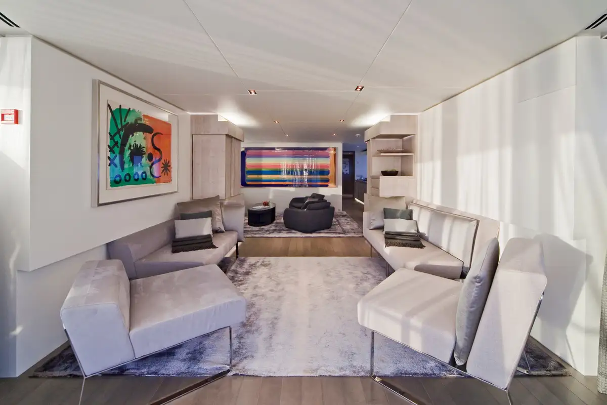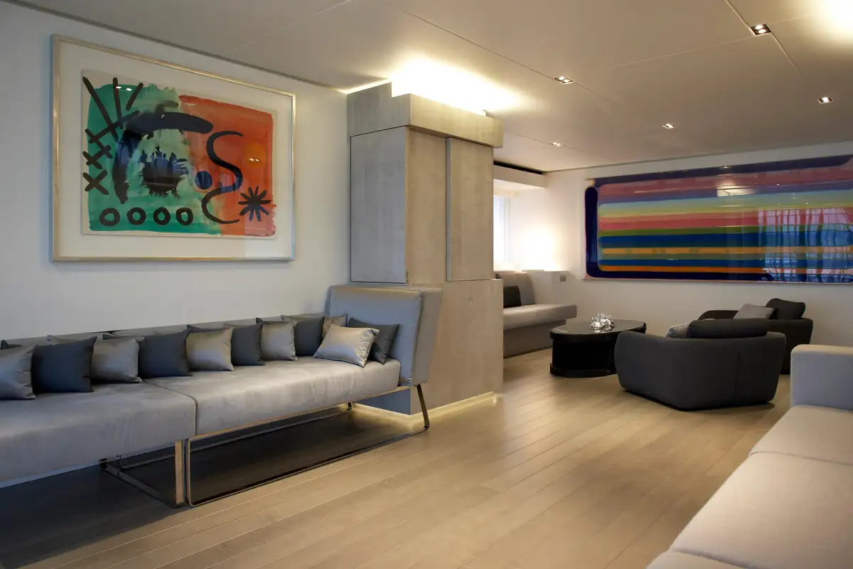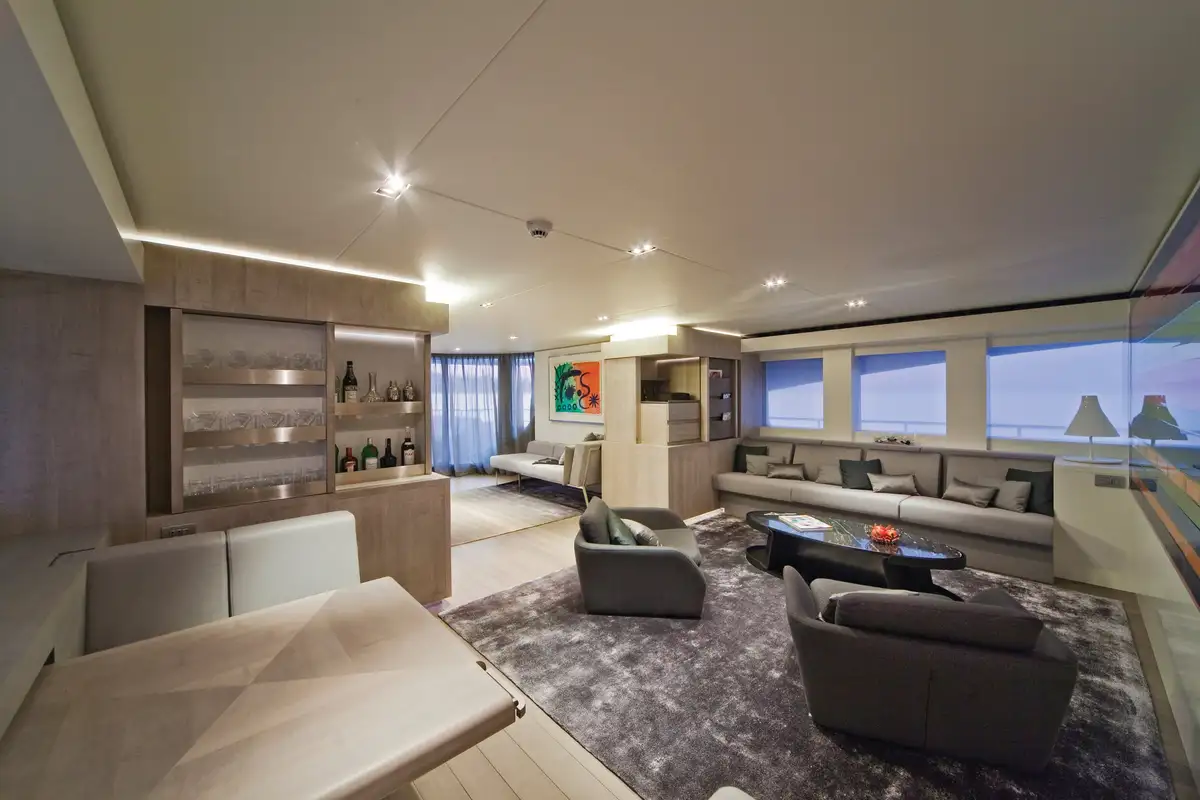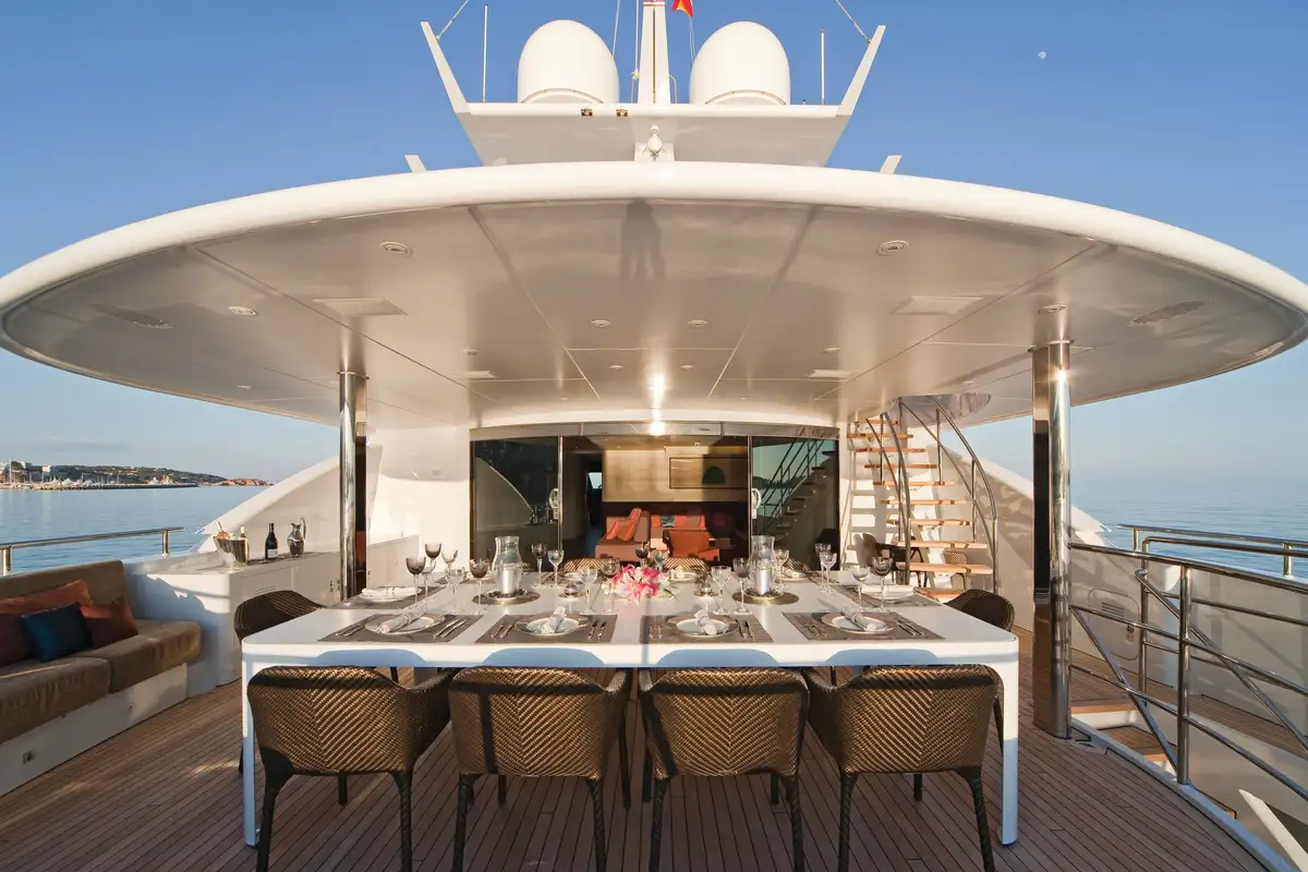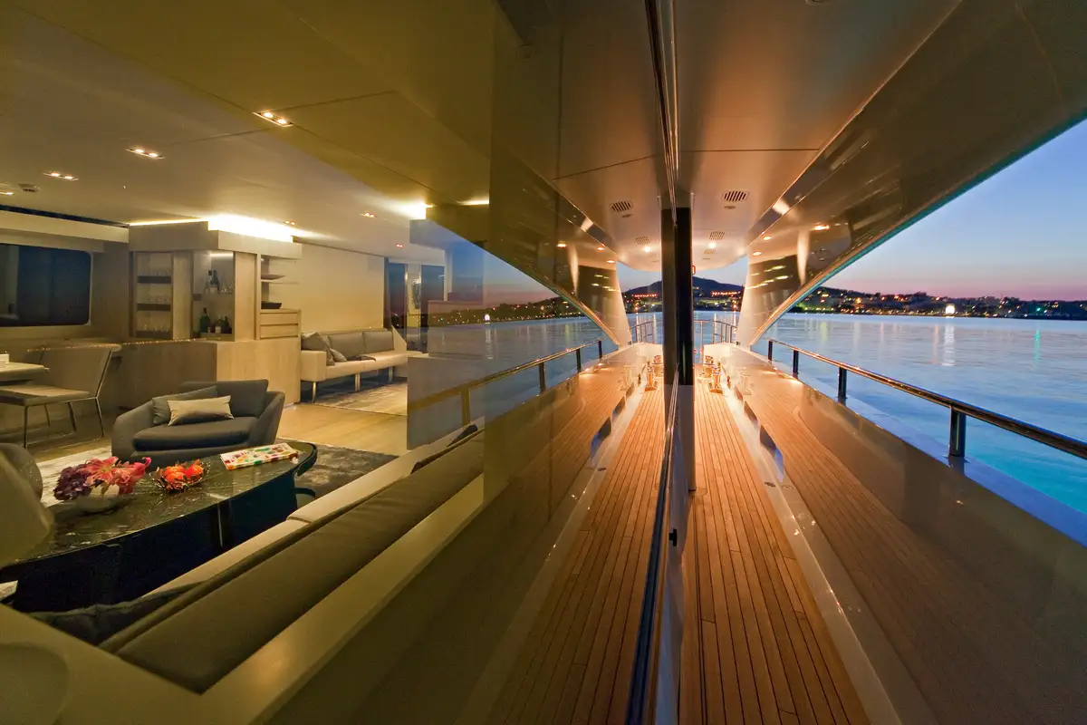 Imposing and streamlined exterior design by Omega Naval Architects announces her powerful presence from afar. Her 25-knot top speed – quite rare for a yacht of this size, with such large interior spaces – effectively doubles the number of places you can choose to explore on your charter holiday, while the wide variety of outdoor spaces on board, in sun and shade, ensures that all guests on board can find their own perfect place to socialise or relax.