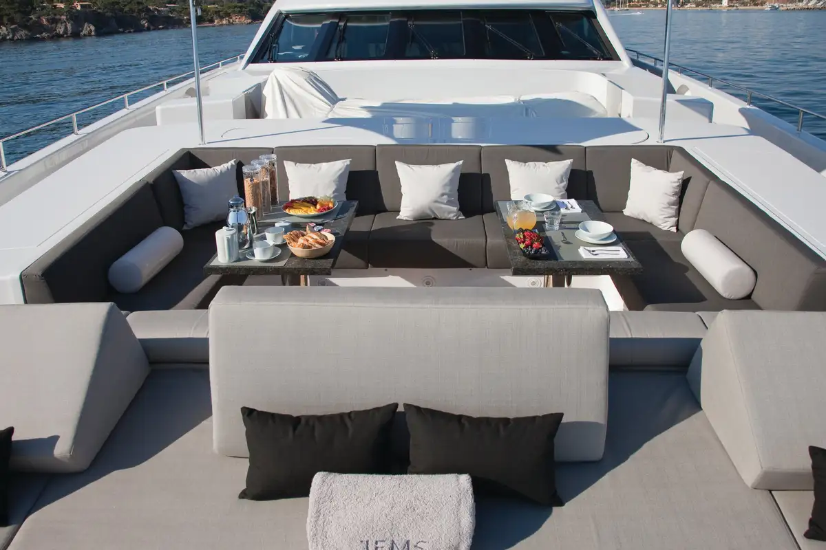A modern tri-deck yacht with an impressive turn of speed, the 44-metre JEMS delivers high-octane exhilaration and refined, stylish relaxation in equal measure. Built and finished to the highest possible standards by the world renowned Heesen shipyard, and designed for 10 guests in five cabins with clean, uncluttered interior design and service from a crew of eight, she offers a wide range of exterior and interior spaces to suit your every mood.